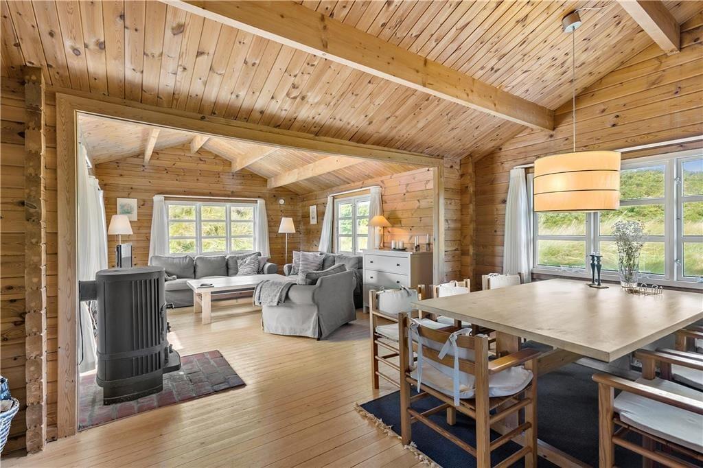 Det klassiske bjælkehus har ligget her siden 1974, og man kan tydeligt se, at både ejendom og interiør er blevet pænt holdt og opdateret gennem årene. Det er virkelig indbegrebet af nordisk sommerhushygge, når der er gang i brændeovnen, og I sidder med bøger eller brætspil i sofaafdelingen – eller når I er samlet til brunch omkring spisebordet, mens I nyder udsigten til klitterne gennem sprossevinduerne. Udover stue og køkken finder I tre gode soveværelser og et badeværelse i huset, og i det tilhørende anneks er der yderligere et soverum og et badeværelse, så der er gode forhold for op til otte personer. Et aktivitetsrum får I også glæde af, for i garagen er der mulighed for at spille bordtennis, bordfodbold og dart frem for at parkere biler.