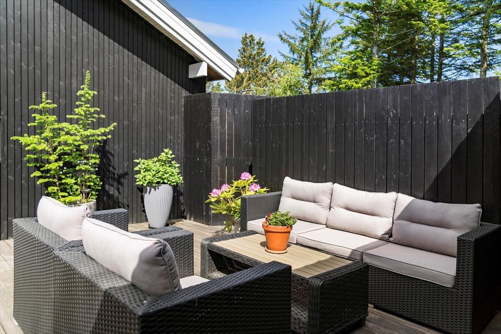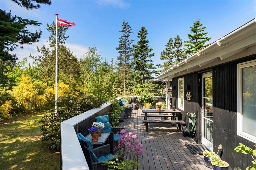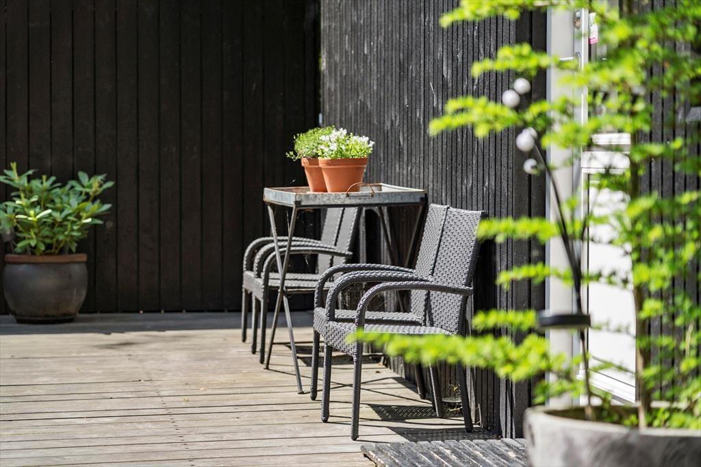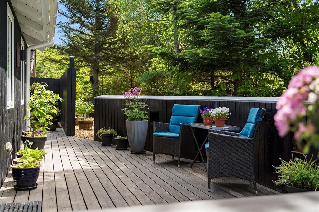 I kan glæde jer til at tilbringe masser af timer under åben himmel på den store lukkede terrasse, der omkranser huset. Her er mange gode kroge, hvor I kan sidde og nyde solen eller læse en god krimi i de fredfyldte rammer. Der er endvidere en udebruser i forlængelse af terrassen, hvor I kan tage opfriskende brusebade, når sommersolen bager. En del af terrassen er overdækket, og I kan tænde op i udepejsen, når aftenen falder på.