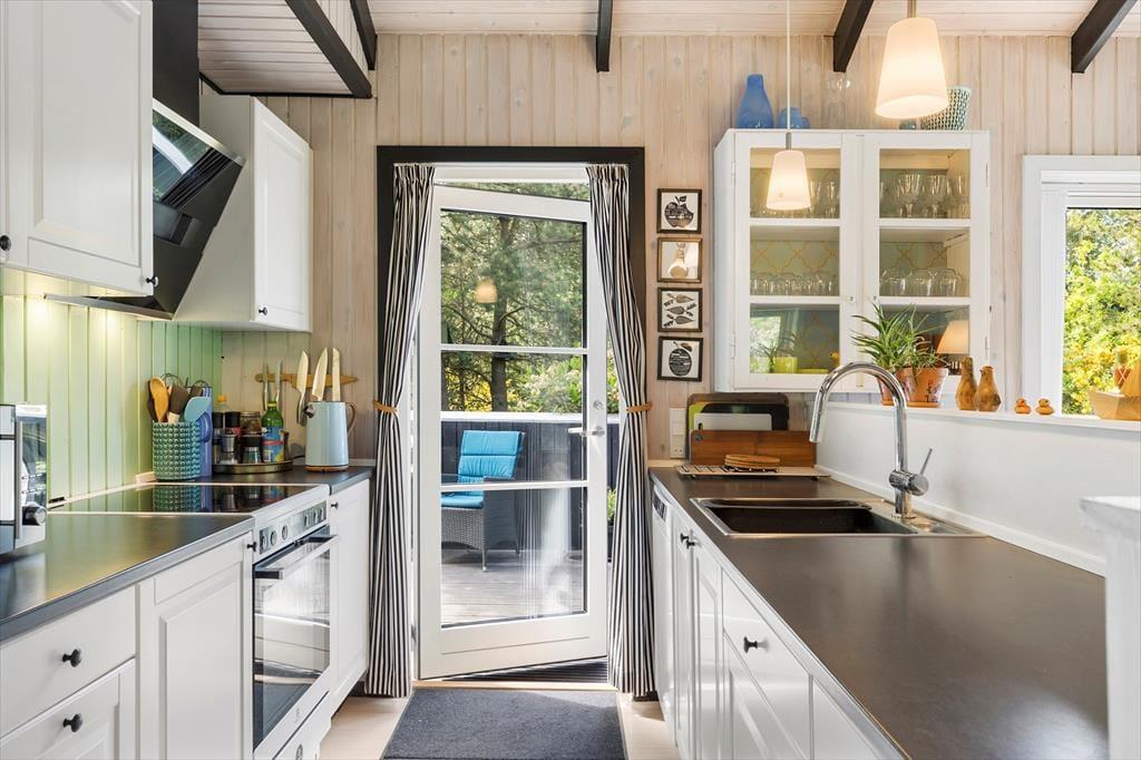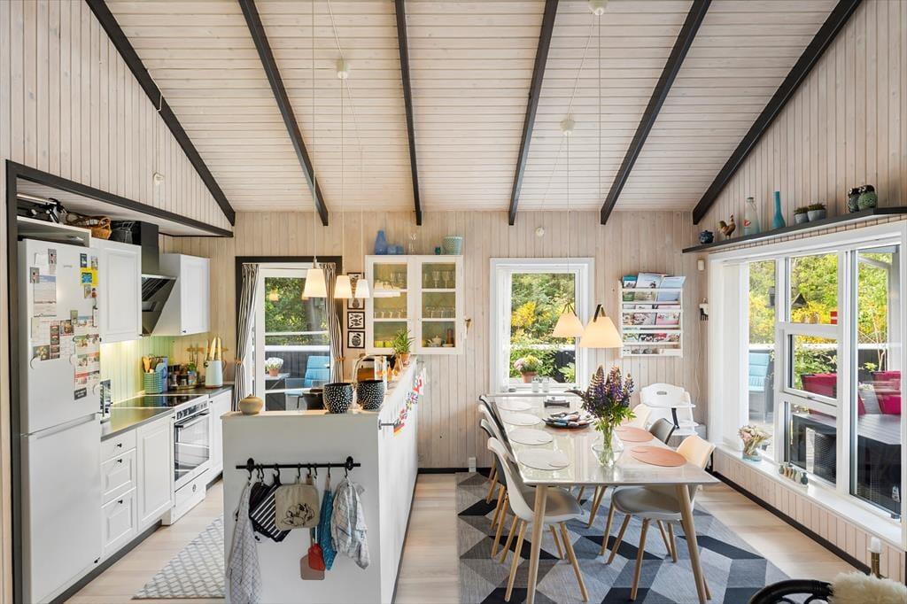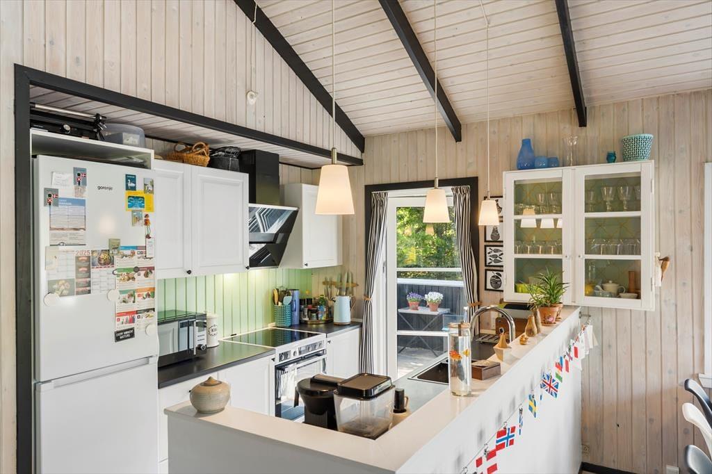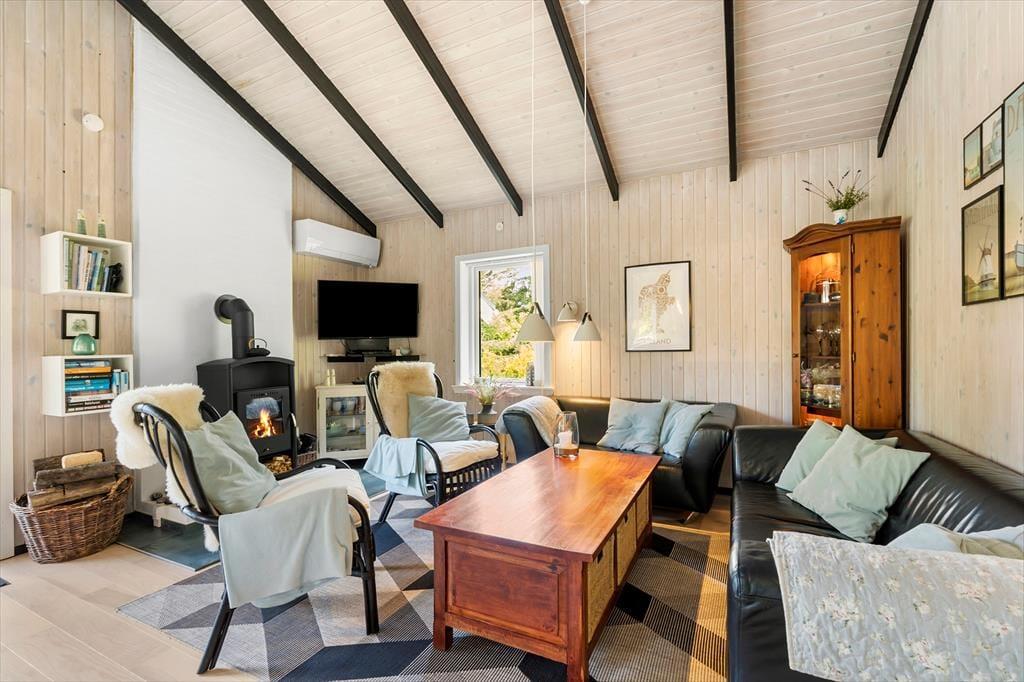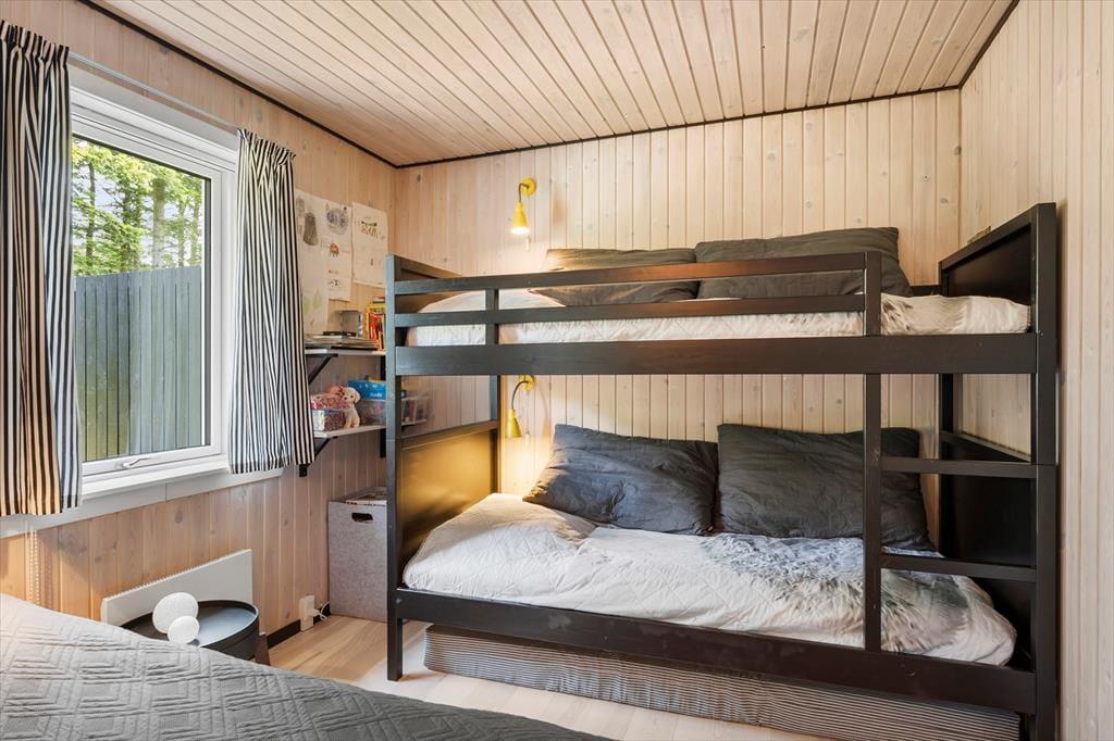 Huset emmer af klassisk sommerhuscharme med sin sortmalede facade og hvide vinduesrammer, der står i flot kontrast til alt det grønne på grunden. Indenfor er der en lys og venlig atmosfære, og det store opholdsrum er et rigtigt ”hjerterum”. Her er der loft til kip, synlige loftsbjælker og et dejligt lysindfald fra de store vinduespartier. Hyggen får optimale betingelser i sofagruppen, og der er naturligvis også en brændeovn til de kølige aftener. Spisebordet er stort, og her får I både plads til puslespillet og aftensmad i familiens skød. Huset indeholder to værelser – et stort værelse med dobbeltseng og køjesenge samt endnu et værelse med dobbeltseng. Herudover er der et badeværelse. Derfor anbefales huset til maks. 4 voksne og 2 børn.
