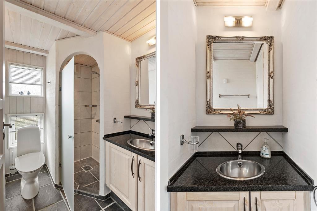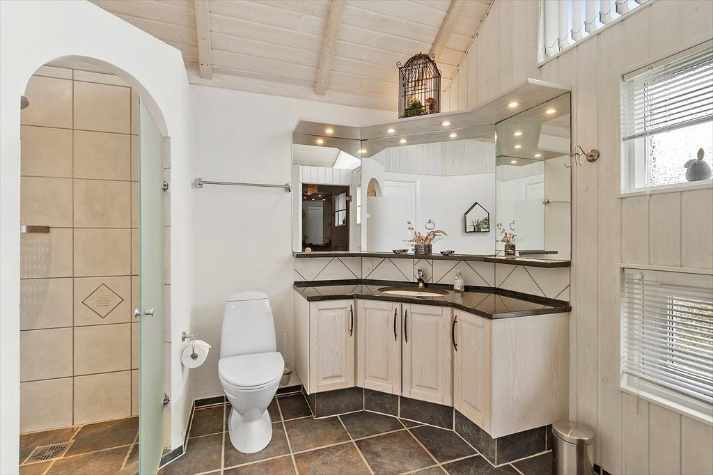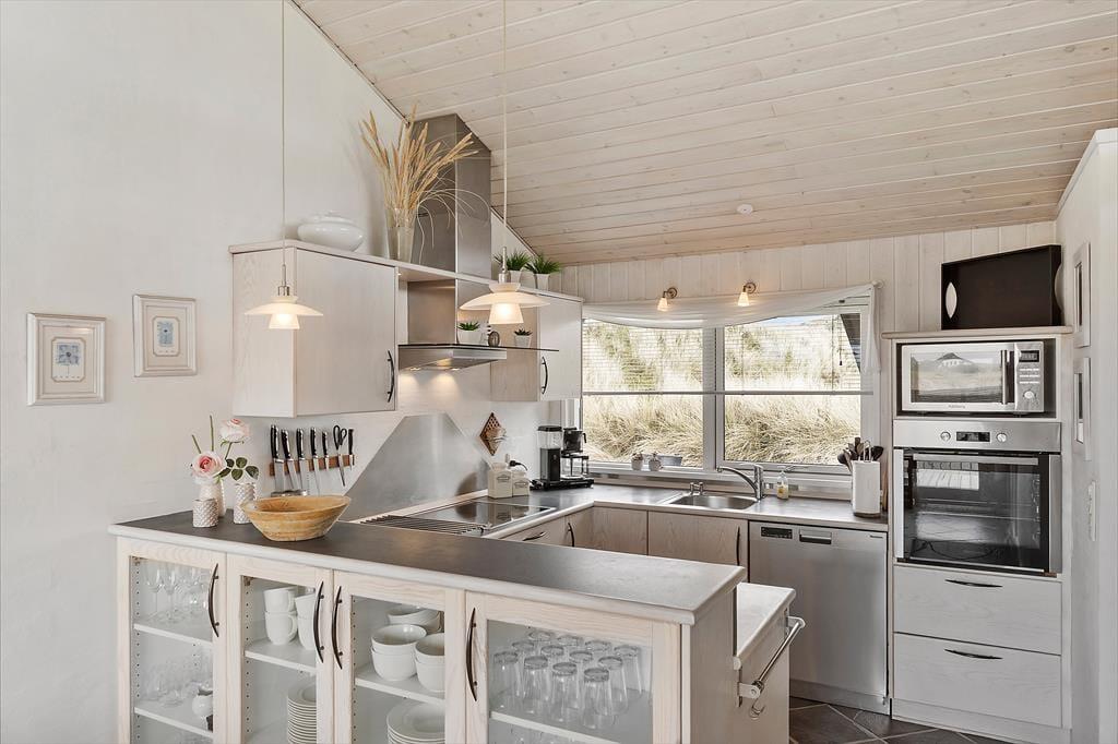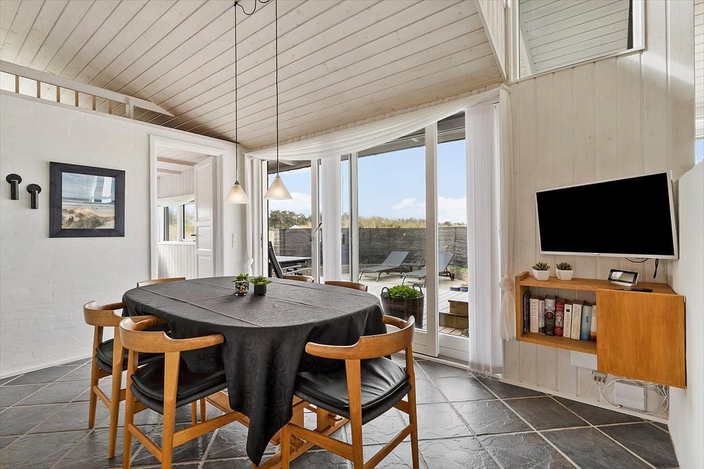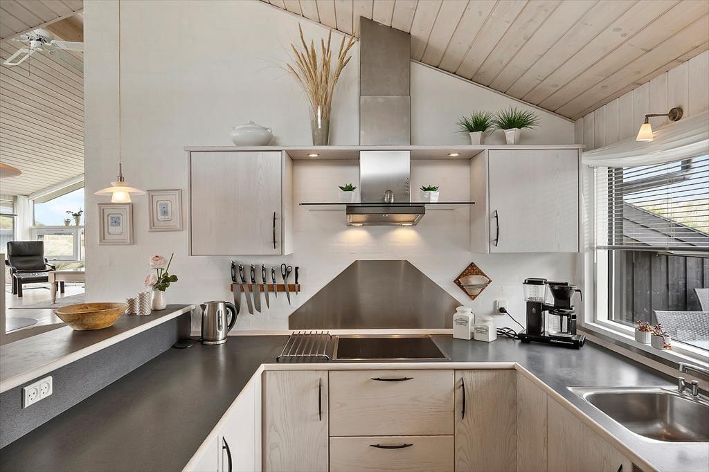 Her er masser af lys, flotte gulve, gode møbler og mange fine detaljer. Desuden både spabad, sauna, vaskemaskine, tørretumbler, parabol med en stor VIASAT-pakke og gratis og trådløst internet, så man hurtigt kan søge informationer om områdets mange muligheder. Her er også installeret varmepumpe, hvilket betyder meget lave forbrugsomkostninger, og tænder man op i brændeovnen, kan man spare endnu mere på udgifterne. Sommerhuset har tre værelser og i alt seks sengepladser, så en stor familie vil sagtens kunne finde sig til rette her. Køkken og spiseafdeling hænger sammen, mens stuen ligger et niveau oppe og har en skøn udsigt til klitterne. Et sommerhus, som vi er stolte af at leje ud!