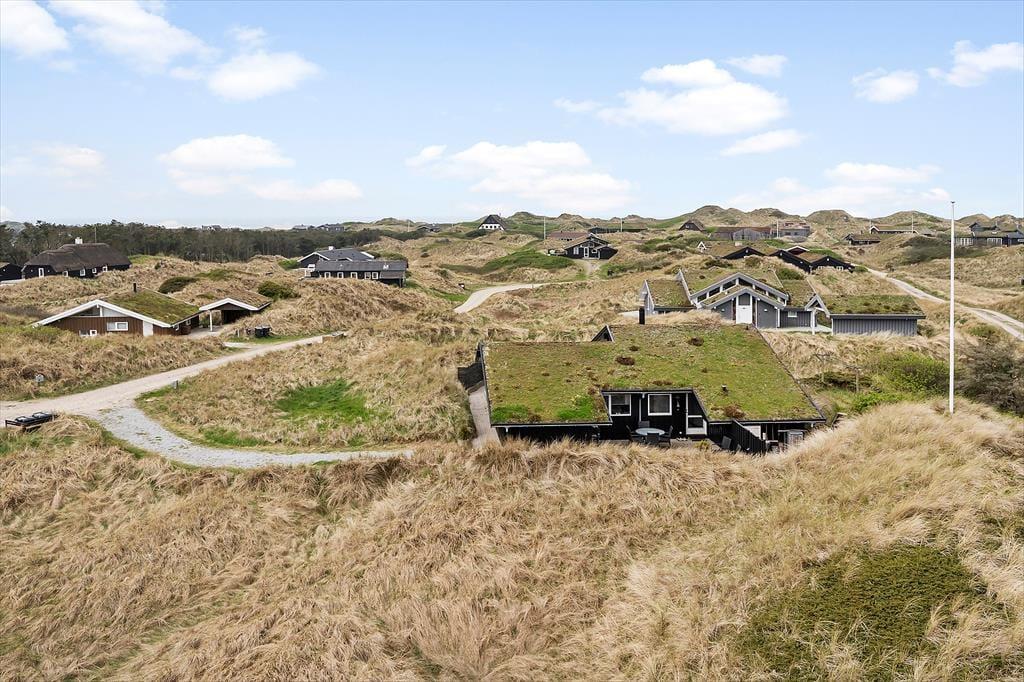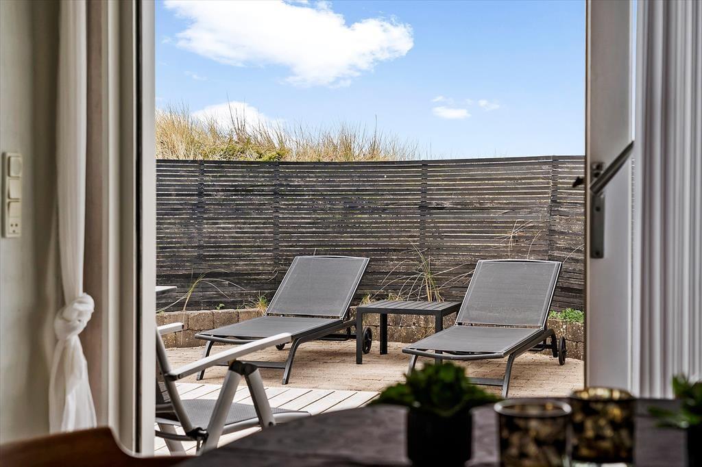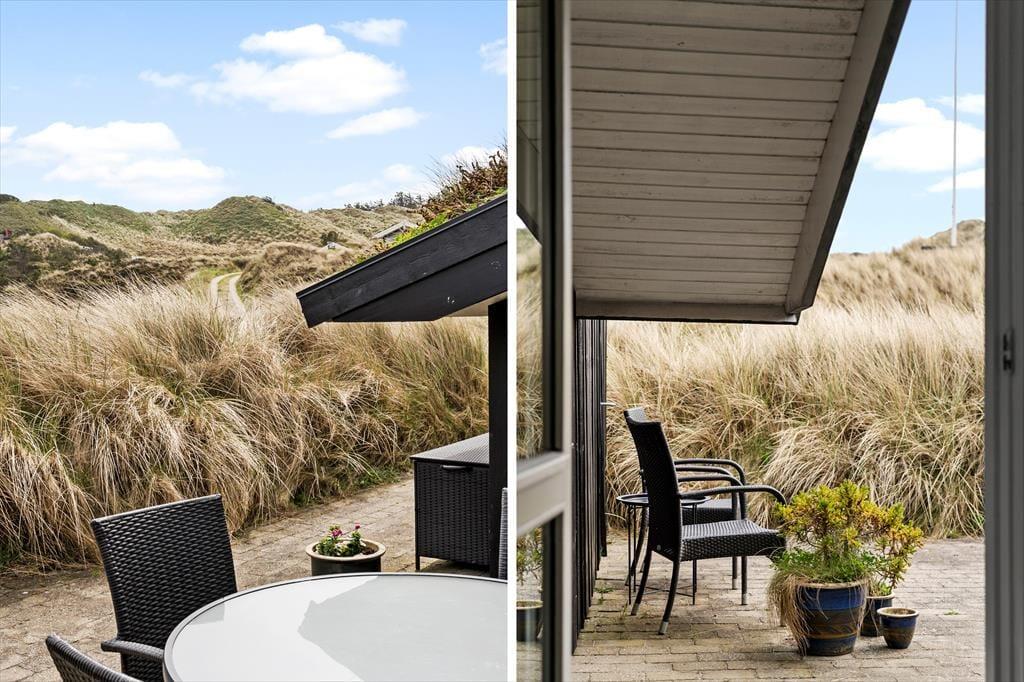 Den store klitgrund med græs, sand og marehalm ligger lidt oppe, og man har derfor en dejlig udsigt over landskabet og Vesterhavet fra de høje klitter. Der er terrasser på begge sider af sommerhuset, så det er muligt at flytte rundt i løbet af dagen for at finde læ og udnytte alle soltimer.