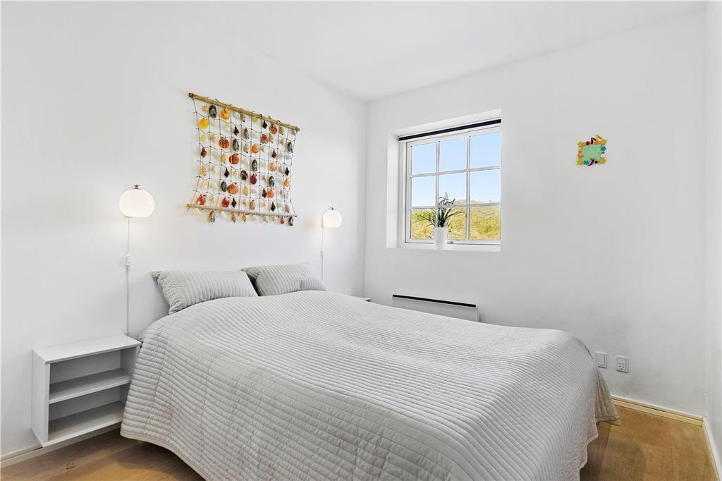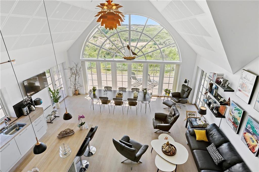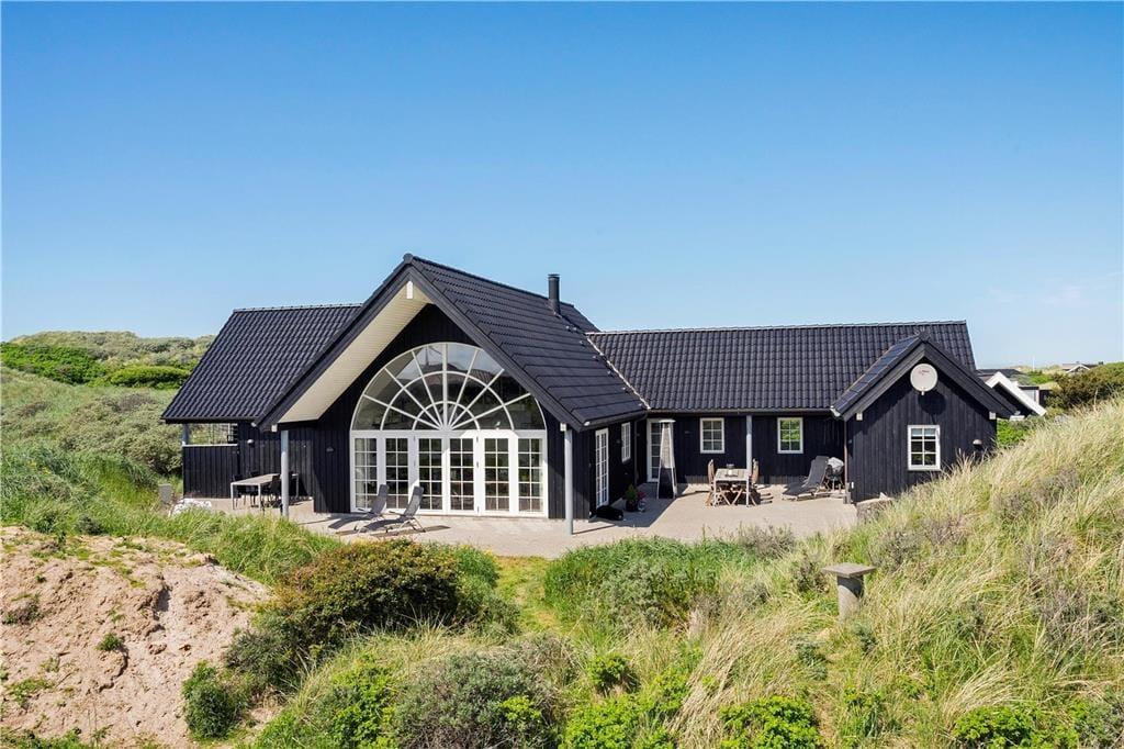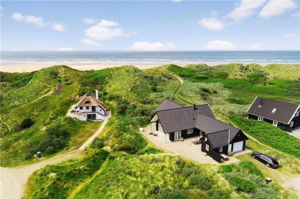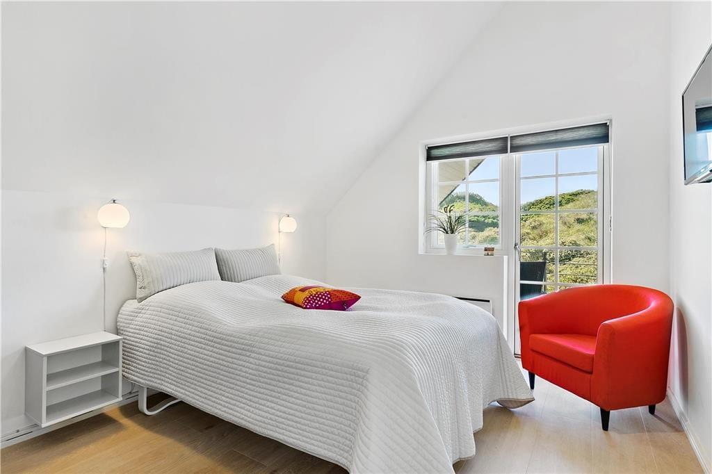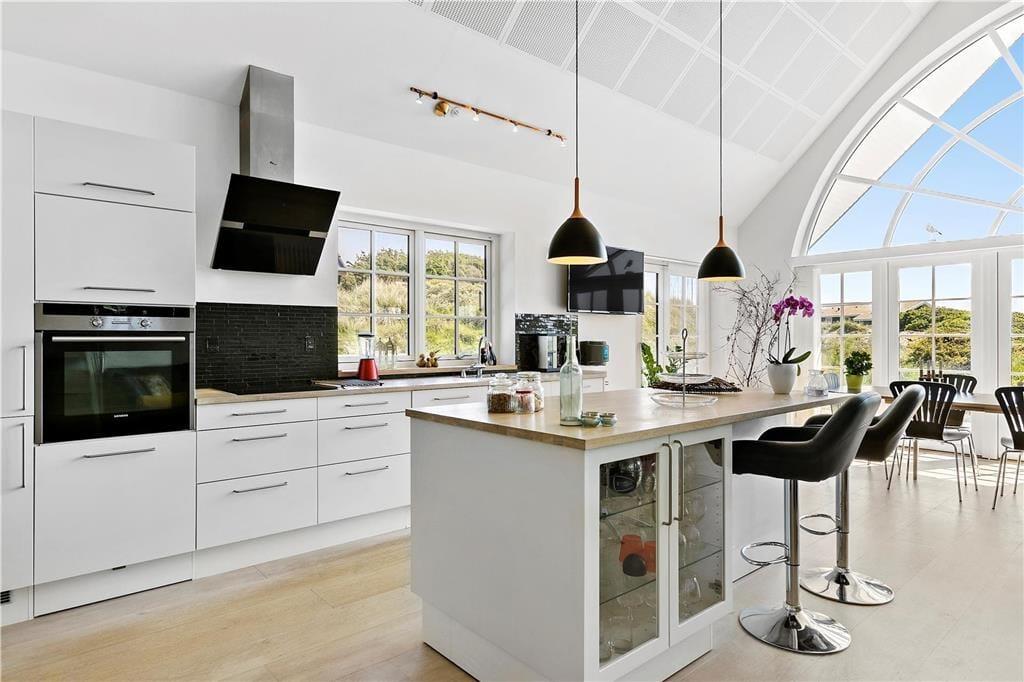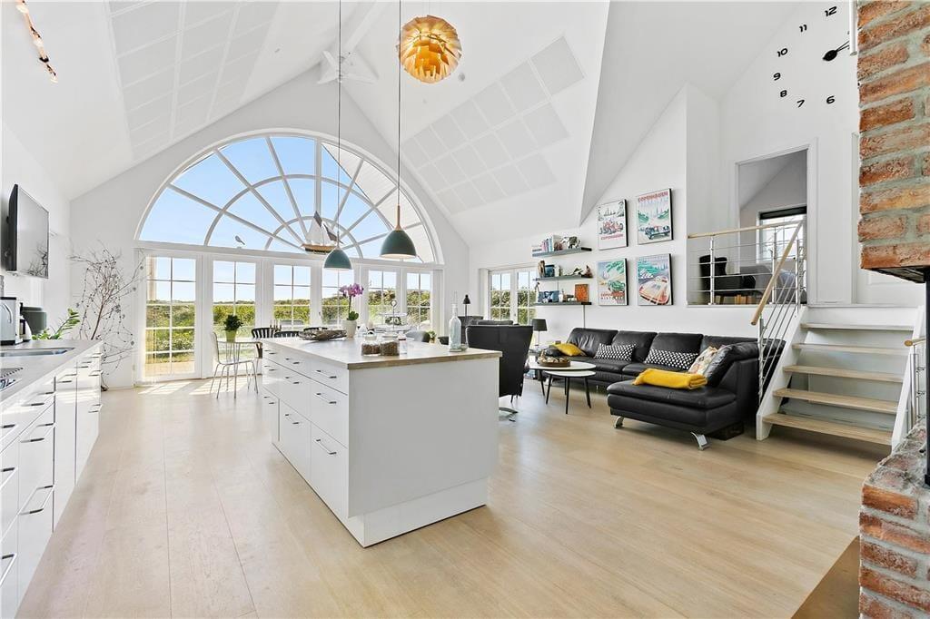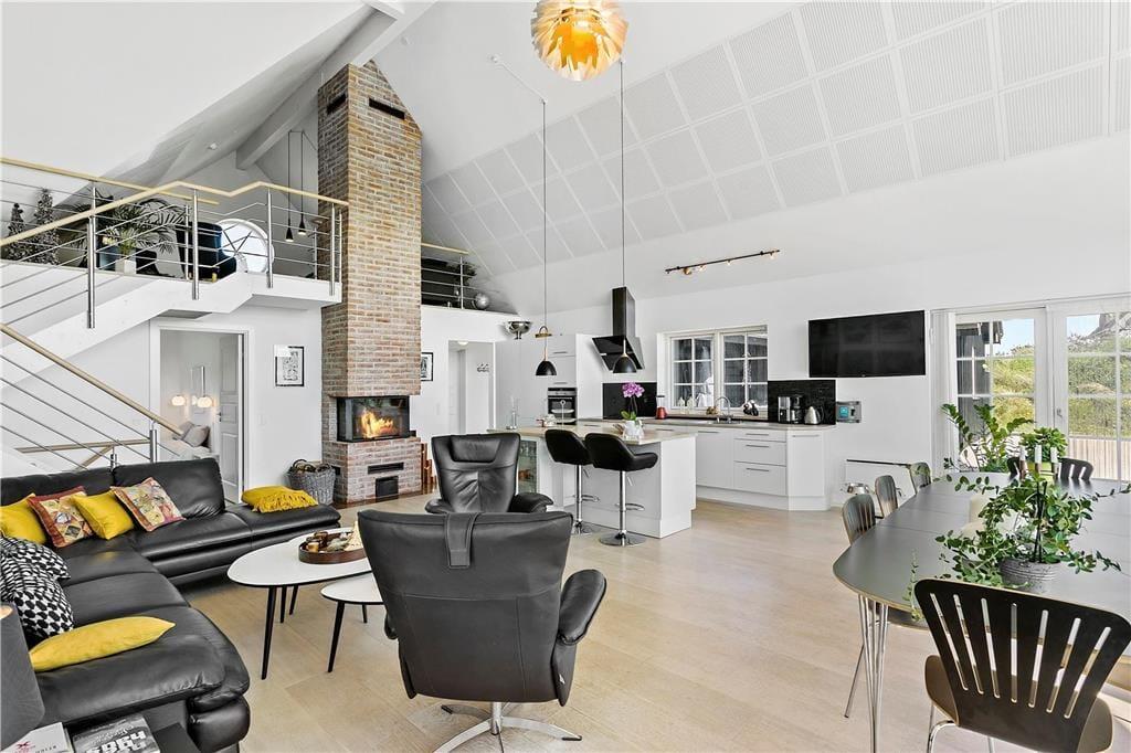 Uanset hvordan man vender og drejer det, er der tale om et særdeles vellykket byggeri. Huset er opført i 2015 i ordentlige kvalitetsmaterialer, og elegant design pryder indretningen overalt. Planløsningen er selvfølgelig også gennemtænkt, så I nemt og bekvemt kan være ti personer samlet inden døre. Fem soveværelser, som alle er udstyret med komfortable dobbeltsenge, er fordelt rundt omkring i huset, som derudover byder på to lækre badeværelser, et praktisk bryggers og den føromtalte herlige vinkælder. Det allerskønneste rum er dog det store, lyse og højloftede opholdsrum, hvor køkkenet og stuen er forenet. Midt i rummet står en pejs, og en trappe fører op til en dejlig hyggekrog i form af en hævet stueafdeling. Store vinduespartier inviterer lyset ind fra flere verdenshjørner, og især opholdsrummets kæmpestore, sydvendte vinduesparti åbenbarer den storslåede udsigt over det kuperede klitlandskab.