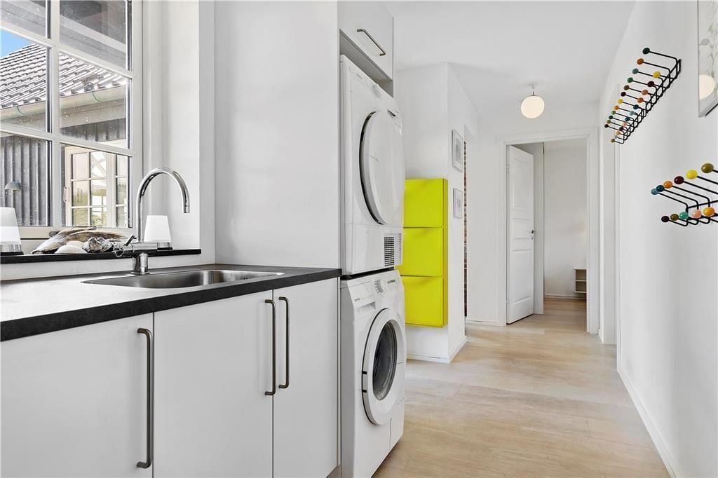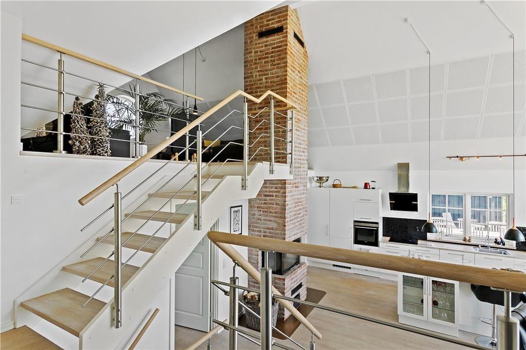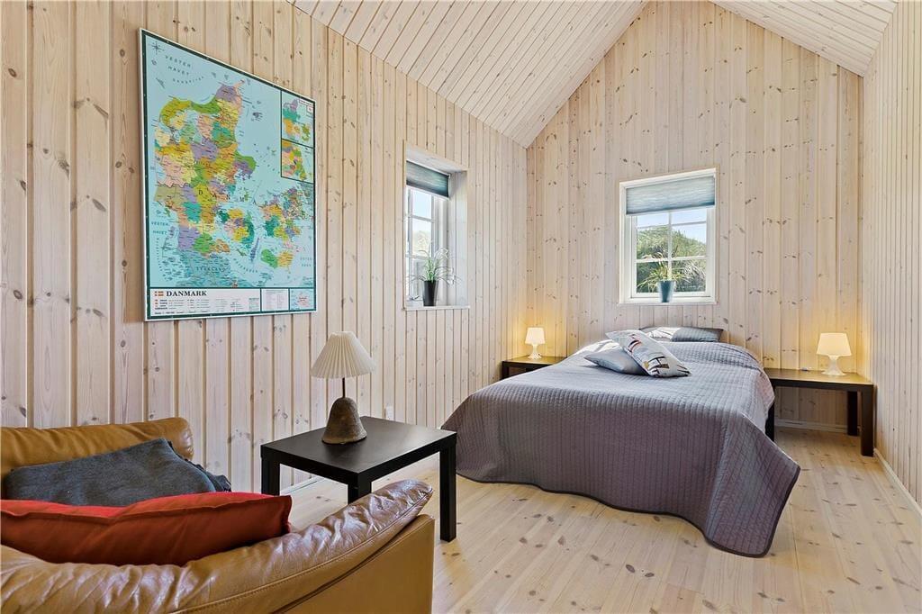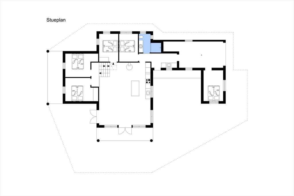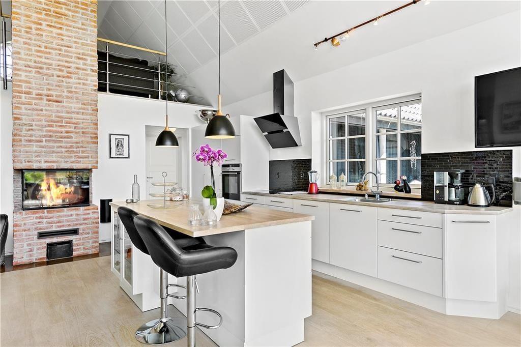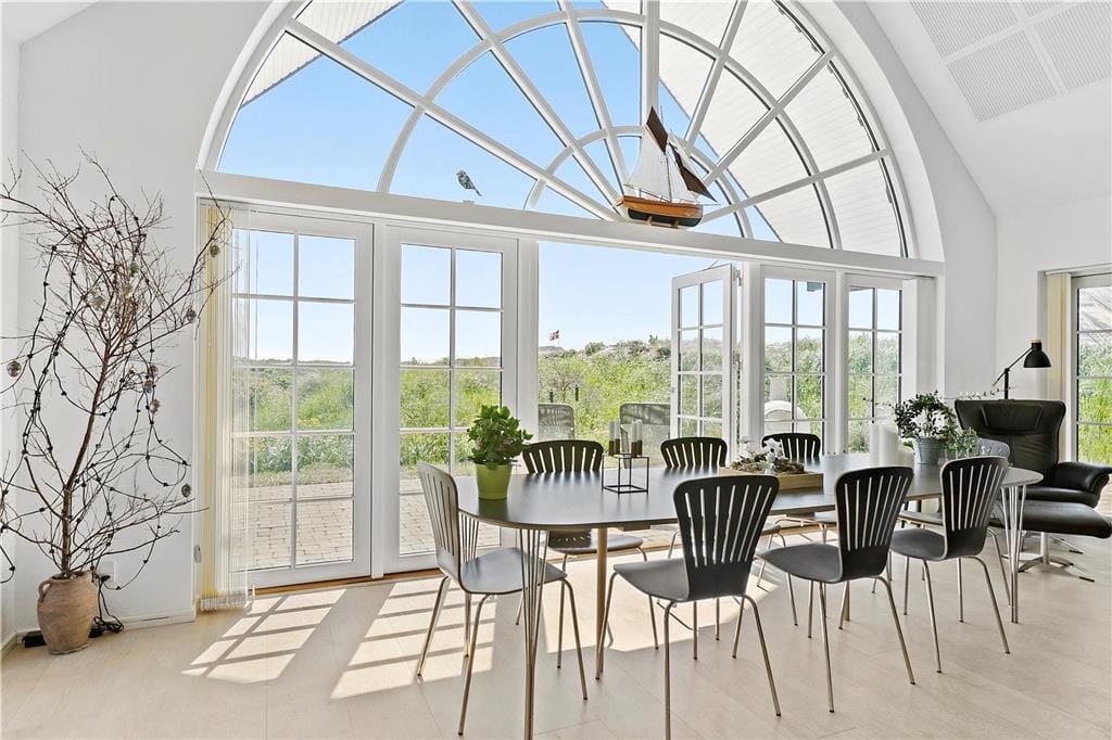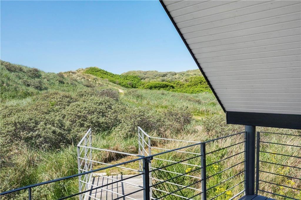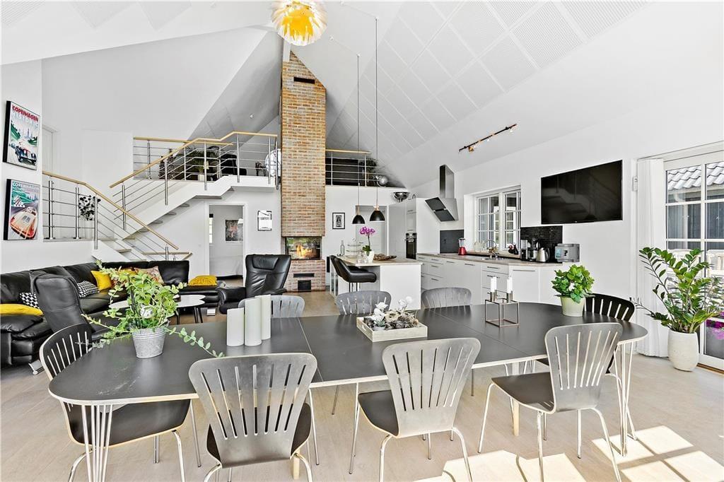 Uanset hvordan man vender og drejer det, er der tale om et særdeles vellykket byggeri. Huset er opført i 2015 i ordentlige kvalitetsmaterialer, og elegant design pryder indretningen overalt. Planløsningen er selvfølgelig også gennemtænkt, så I nemt og bekvemt kan være ti personer samlet inden døre. Fem soveværelser, som alle er udstyret med komfortable dobbeltsenge, er fordelt rundt omkring i huset, som derudover byder på to lækre badeværelser, et praktisk bryggers og den føromtalte herlige vinkælder. Det allerskønneste rum er dog det store, lyse og højloftede opholdsrum, hvor køkkenet og stuen er forenet. Midt i rummet står en pejs, og en trappe fører op til en dejlig hyggekrog i form af en hævet stueafdeling. Store vinduespartier inviterer lyset ind fra flere verdenshjørner, og især opholdsrummets kæmpestore, sydvendte vinduesparti åbenbarer den storslåede udsigt over det kuperede klitlandskab.