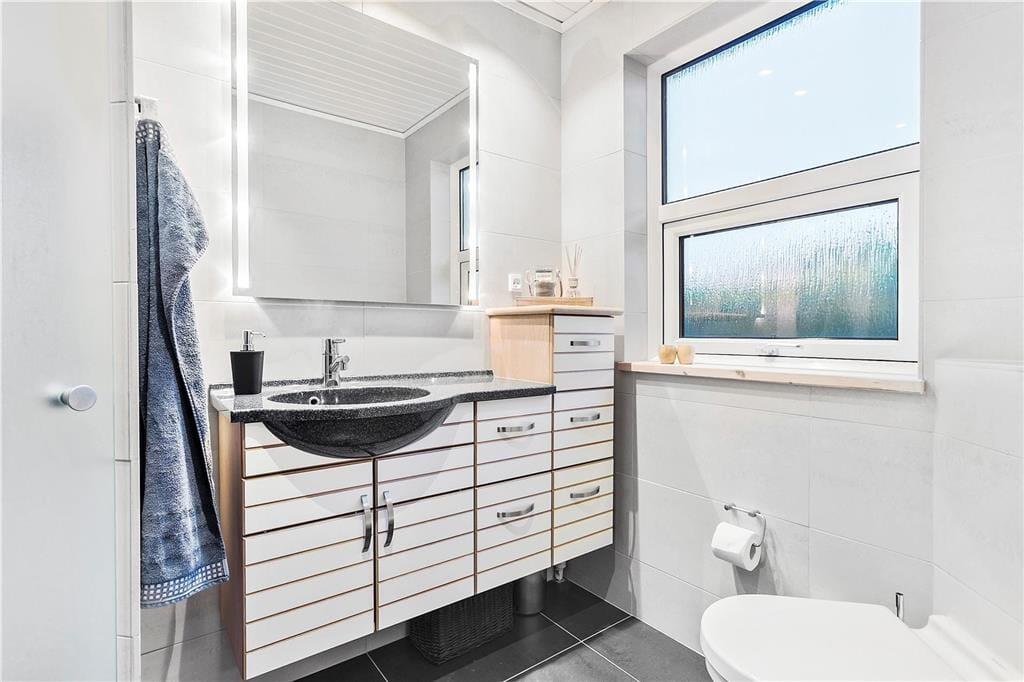 Læsestunder, leg og meget andet er der også masser af plads til ude i det fri. Den kuperede naturgrund måler nemlig hele 2580 m2, og her er der både lægivende beplantning og mere åbne områder, hvor de yngste familiemedlemmer kan boltre sig. Nær sommerhuset breder en dejlig træterrasse sig, og herfra fører et par trin ned til en ugeneret oase i form af en glasafskærmet fliseterrasse.