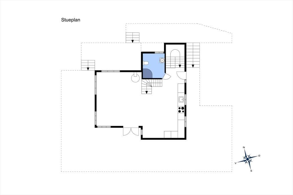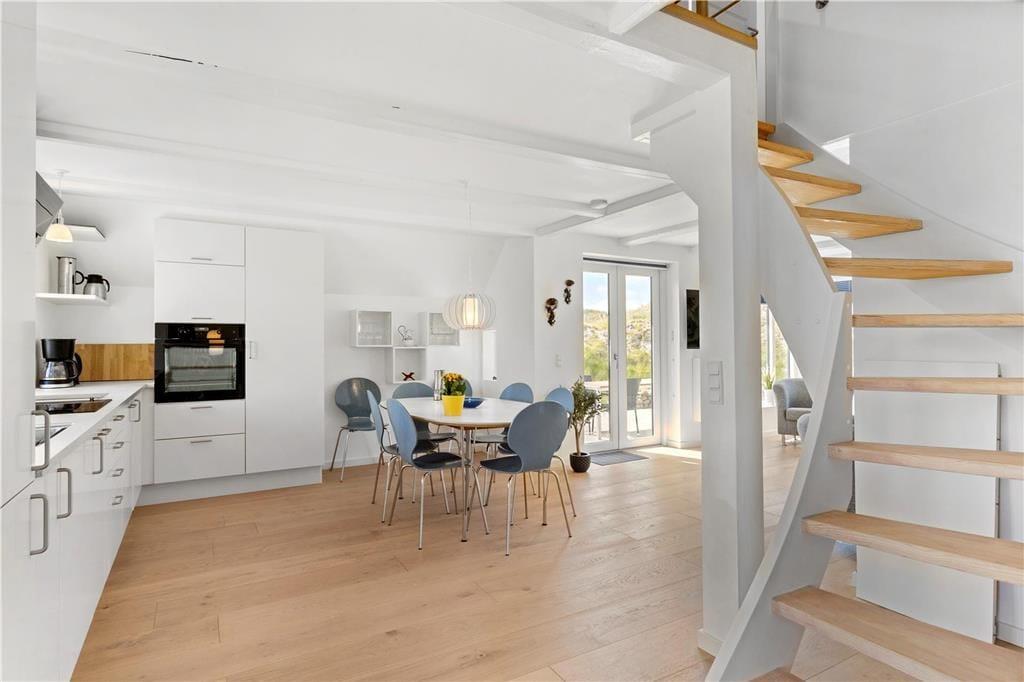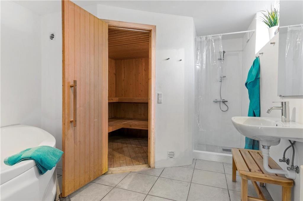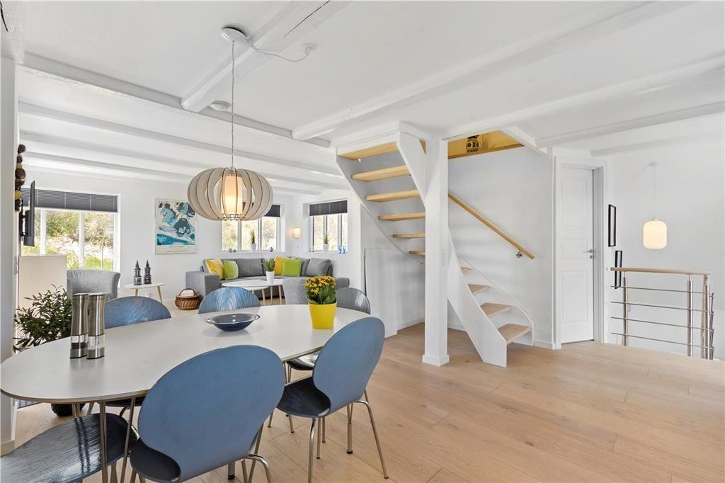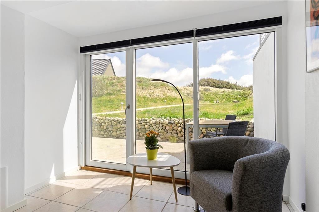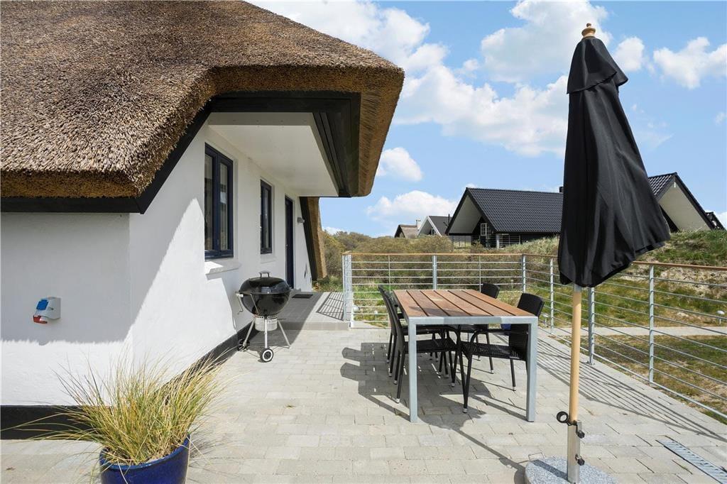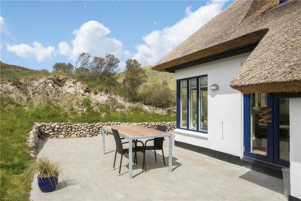 Fra stueplan såvel som underetagen har I direkte adgang ud i det fri, hvor flere flisebelagte terrasser breder sig rundt om huset. Fordi sommerhuset ligger godt gemt i klitterne, kommer udelivet ikke bare til at foregå i ugenerede omgivelser, men også i læ for vestenvinden, hvilket bestemt ikke er alle forundt, når man holder til så tæt på vestkysten. Især på den østvendte terrasse er udsigten over det kuperede landskab betagende – og når I vil skue ud over havet, skal I blot gå til tops af klitterne på den private, kæmpestore naturgrund.