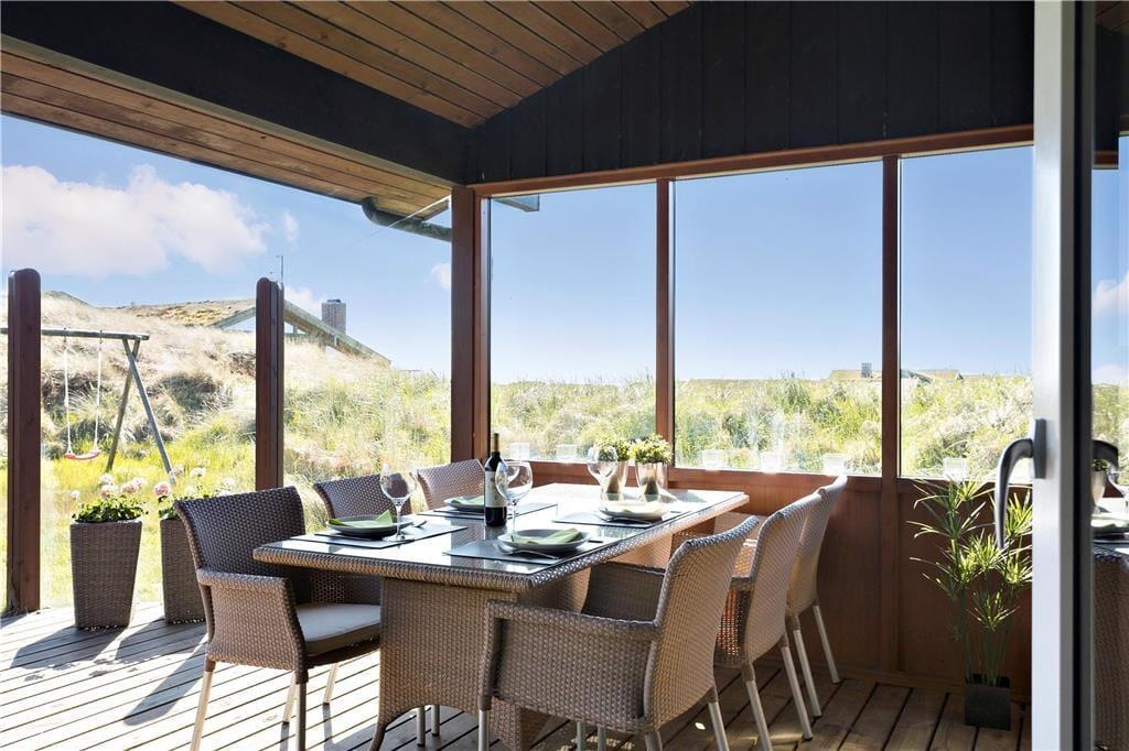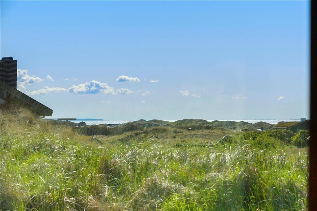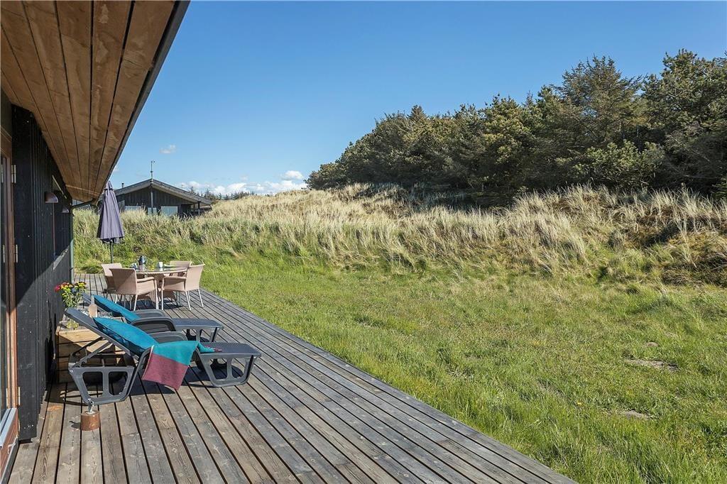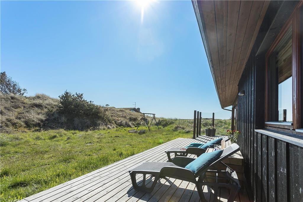 På hele sydsiden af sommerhuset løber en dejlig træterrasse med glasafskærmning og overdækning i det vestlige hjørne. Her kan man altid finde en solplet og holde øje med børnenes leg i sandkassen og gyngerne. Grunden er omgivet af klitter med marehalm, og fra terrassen og toppen af de små bakker har man en formidabel udsigt over Vesterhavet.