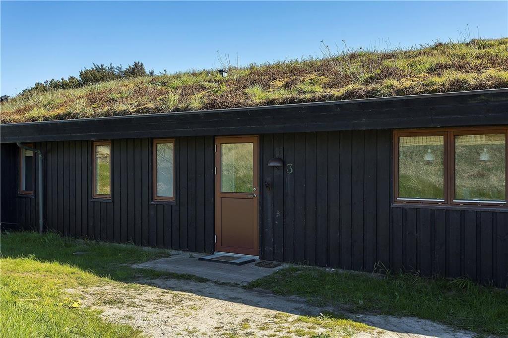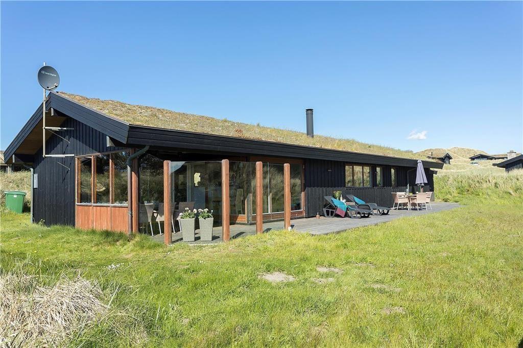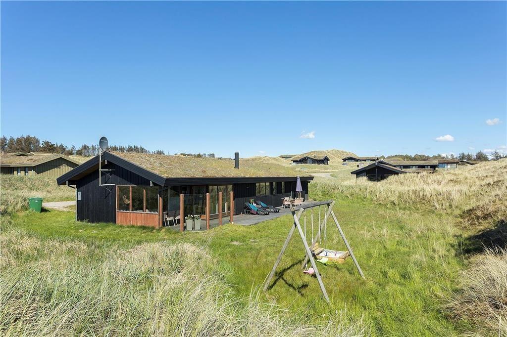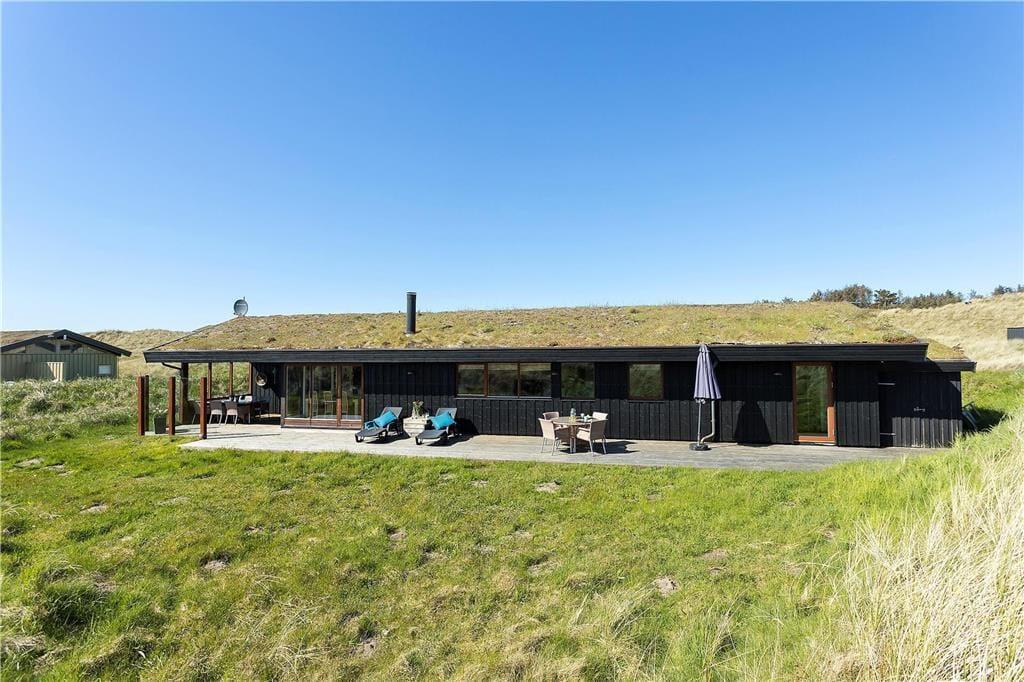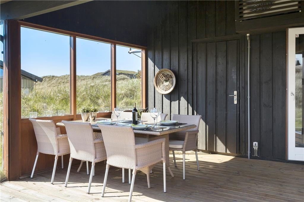 På hele sydsiden af sommerhuset løber en dejlig træterrasse med glasafskærmning og overdækning i det vestlige hjørne. Her kan man altid finde en solplet og holde øje med børnenes leg i sandkassen og gyngerne. Grunden er omgivet af klitter med marehalm, og fra terrassen og toppen af de små bakker har man en formidabel udsigt over Vesterhavet.
