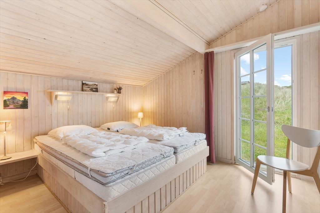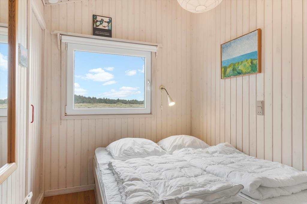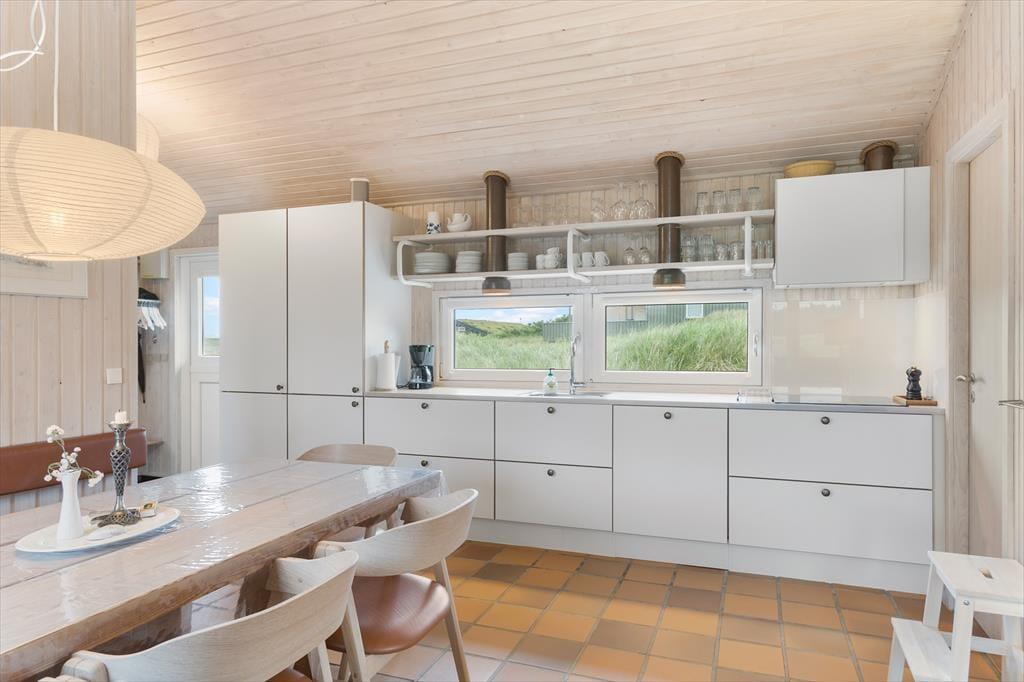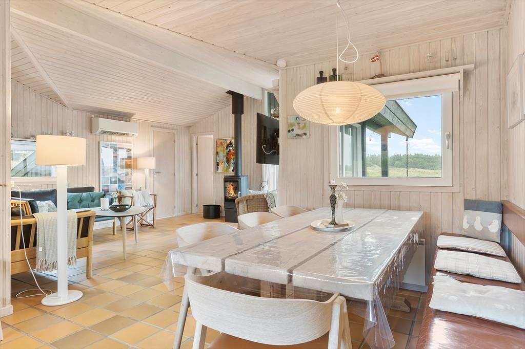 Sommerhuset er velegnet til både familier og vennepar, som gerne vil holde ferie sammen. Her er et dejligt køkken, kombineret med et hyggeligt spisehjørne med bænk, en stue med tv og brændeovn, fire soveværelser og to badeværelser. På det ene badeværelse er spabad og sauna, så holder man ferie i efteråret, er det rart at varme kroppen igennem her efter en lang gåtur på stranden. Indretningen er varm og imødekommende med mange hyggelige detaljer; dette sommerhus er meget populært, og mange gæster vender ofte tilbage hertil år efter år.