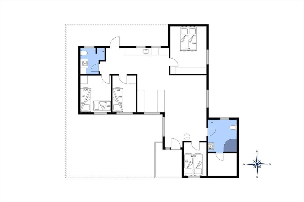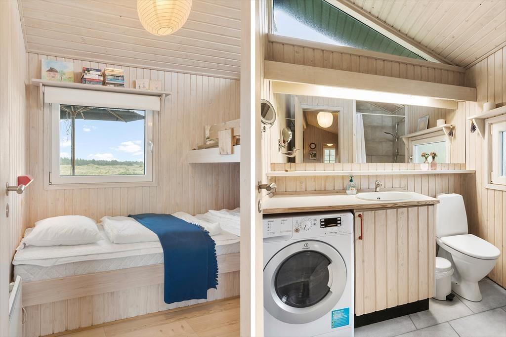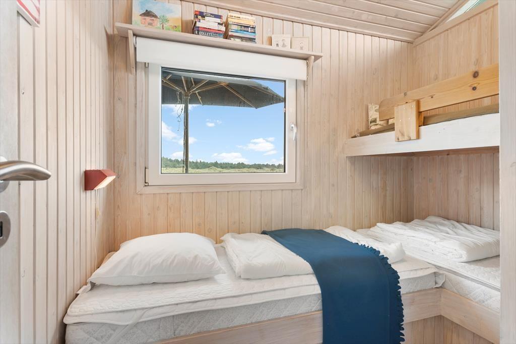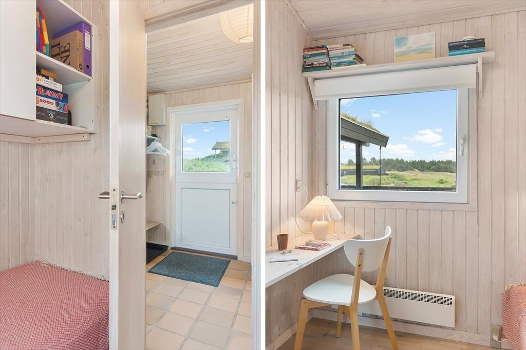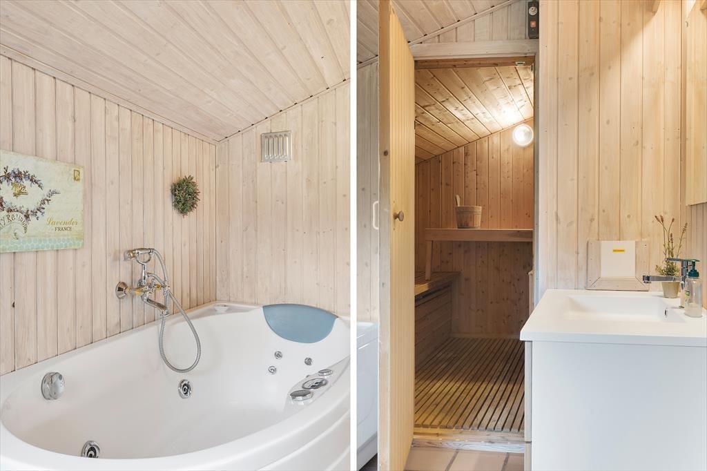 Sommerhuset er velegnet til både familier og vennepar, som gerne vil holde ferie sammen. Her er et dejligt køkken, kombineret med et hyggeligt spisehjørne med bænk, en stue med tv og brændeovn, fire soveværelser og to badeværelser. På det ene badeværelse er spabad og sauna, så holder man ferie i efteråret, er det rart at varme kroppen igennem her efter en lang gåtur på stranden. Indretningen er varm og imødekommende med mange hyggelige detaljer; dette sommerhus er meget populært, og mange gæster vender ofte tilbage hertil år efter år.