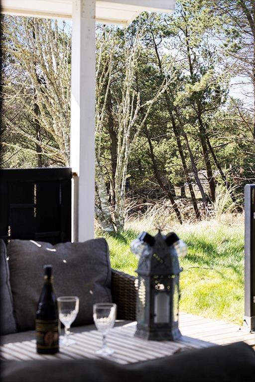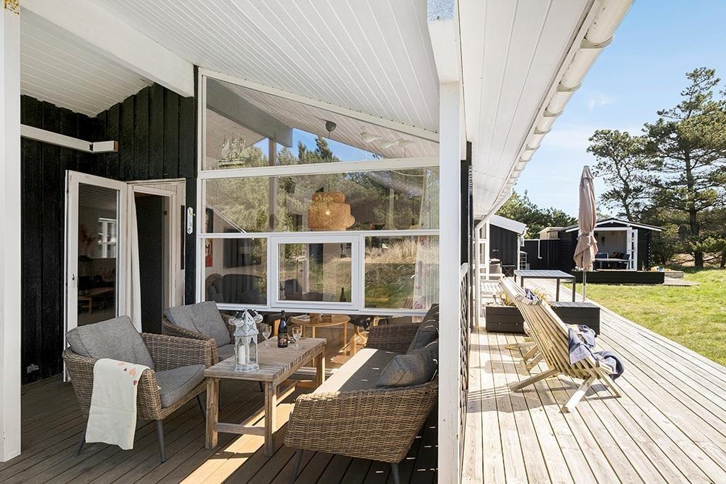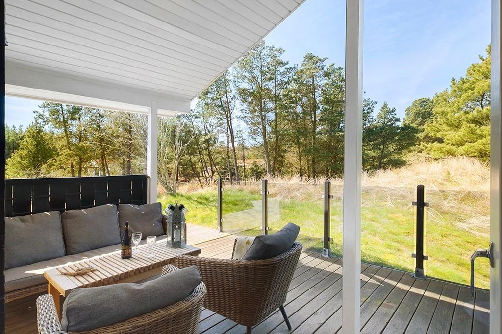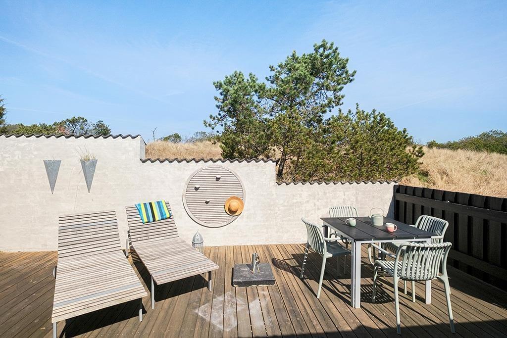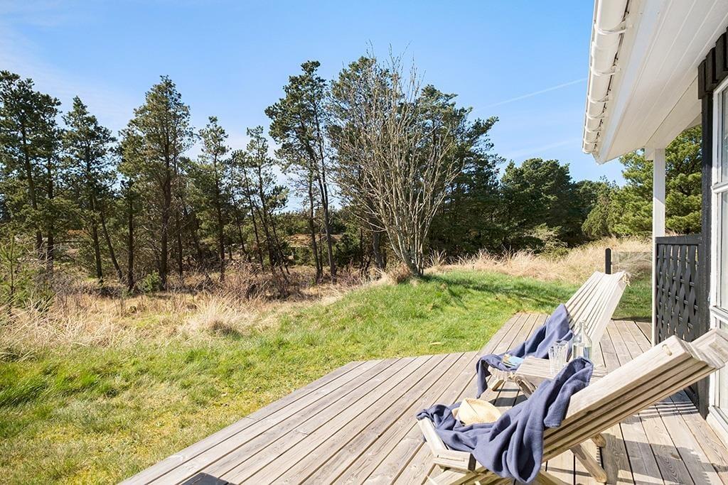 Der er terrasse rundt om det meste af sommerhuset, også en overdækket og afskærmet del med udgang fra stuen; her er ideelt om aftenen, når duggen falder. De smukke naturomgivelser med høje træer og de bakkede klitter er helt fantastiske, her kan man virkelig koble helt af fra hverdagens stress.