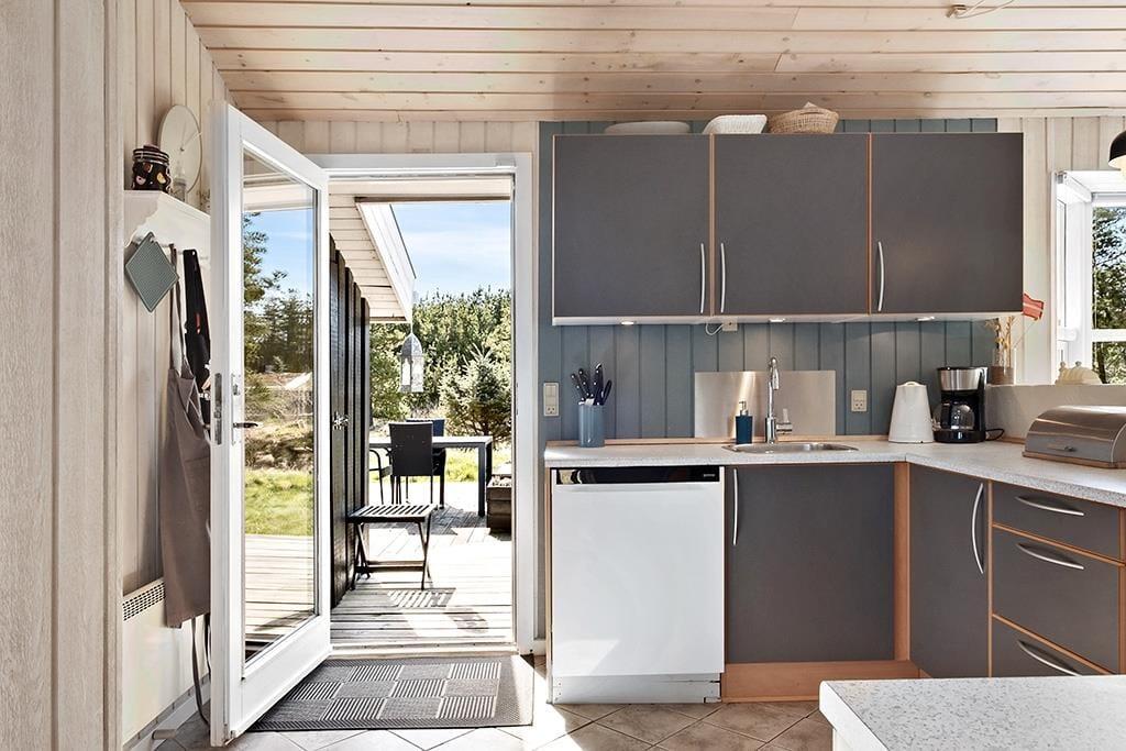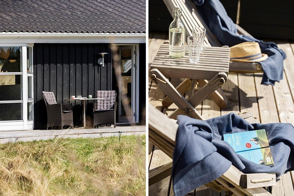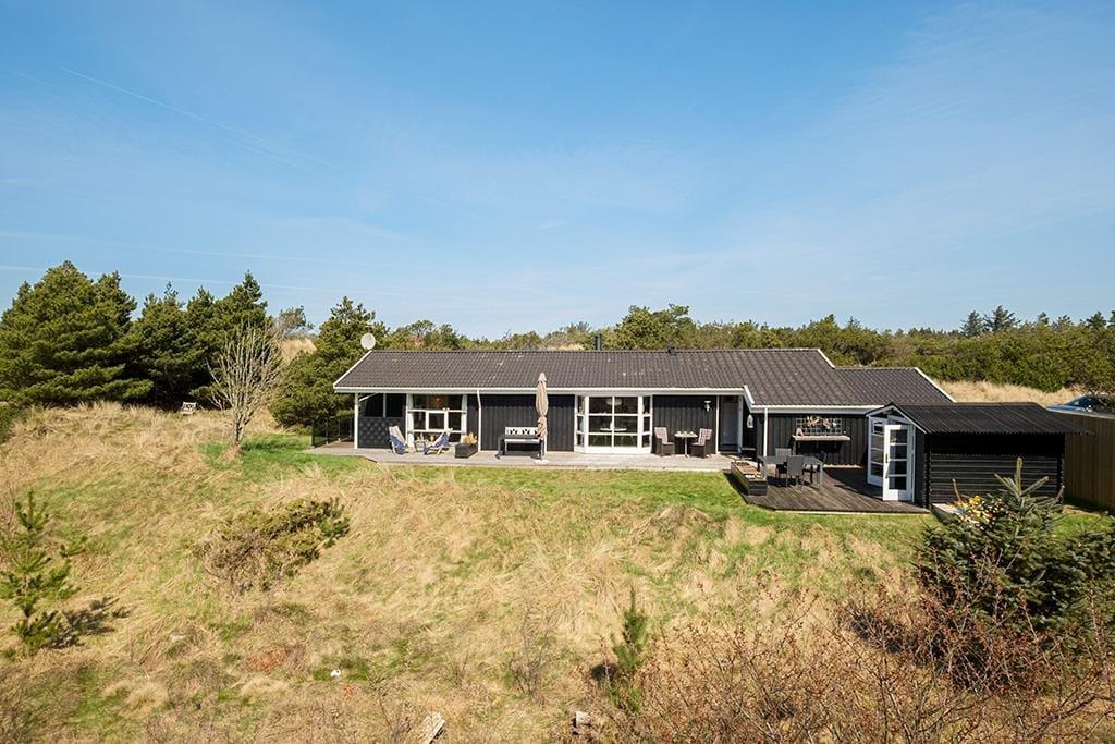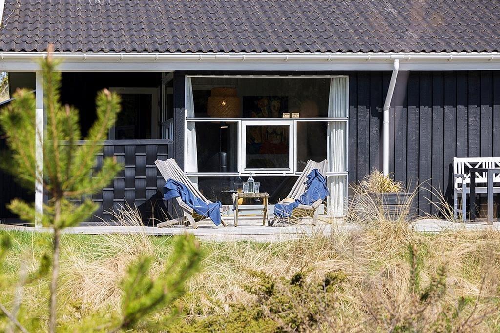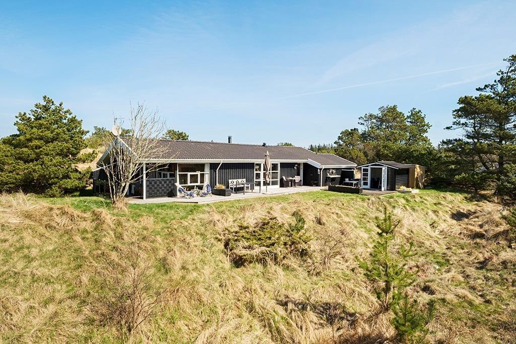Der er terrasse rundt om det meste af sommerhuset, også en overdækket og afskærmet del med udgang fra stuen; her er ideelt om aftenen, når duggen falder. De smukke naturomgivelser med høje træer og de bakkede klitter er helt fantastiske, her kan man virkelig koble helt af fra hverdagens stress.