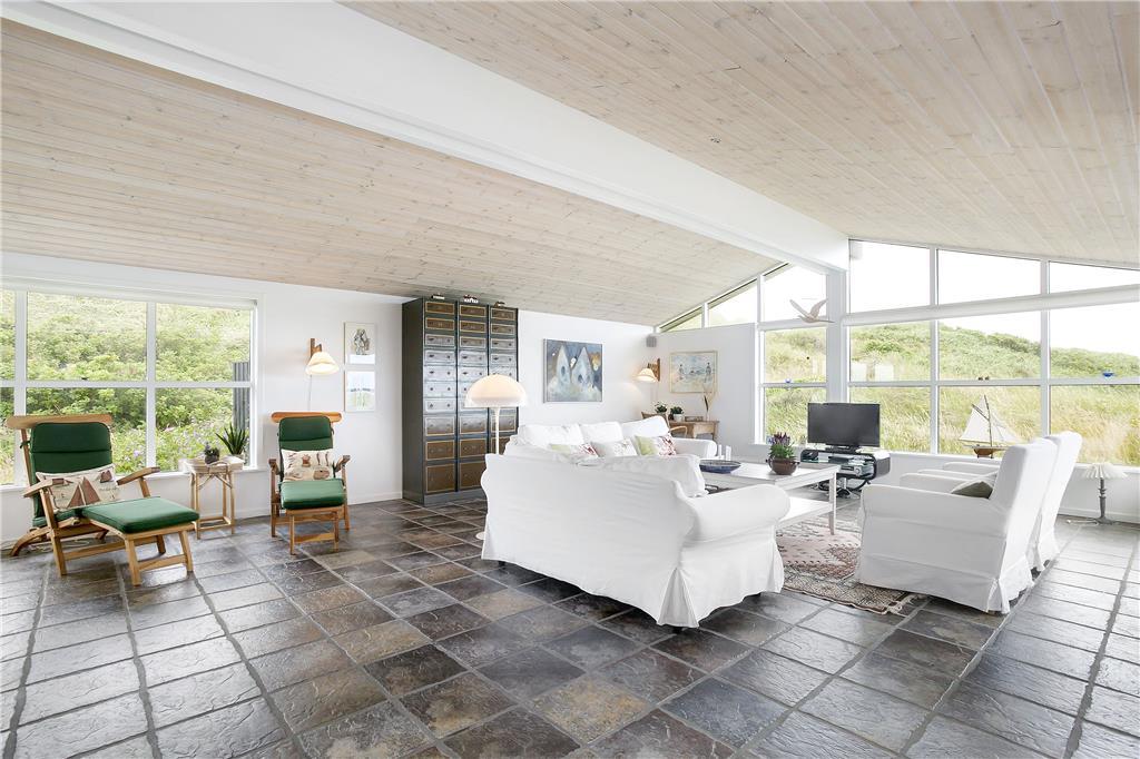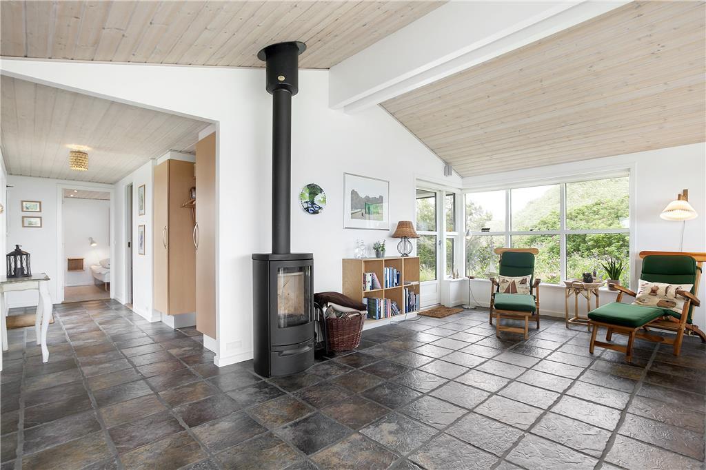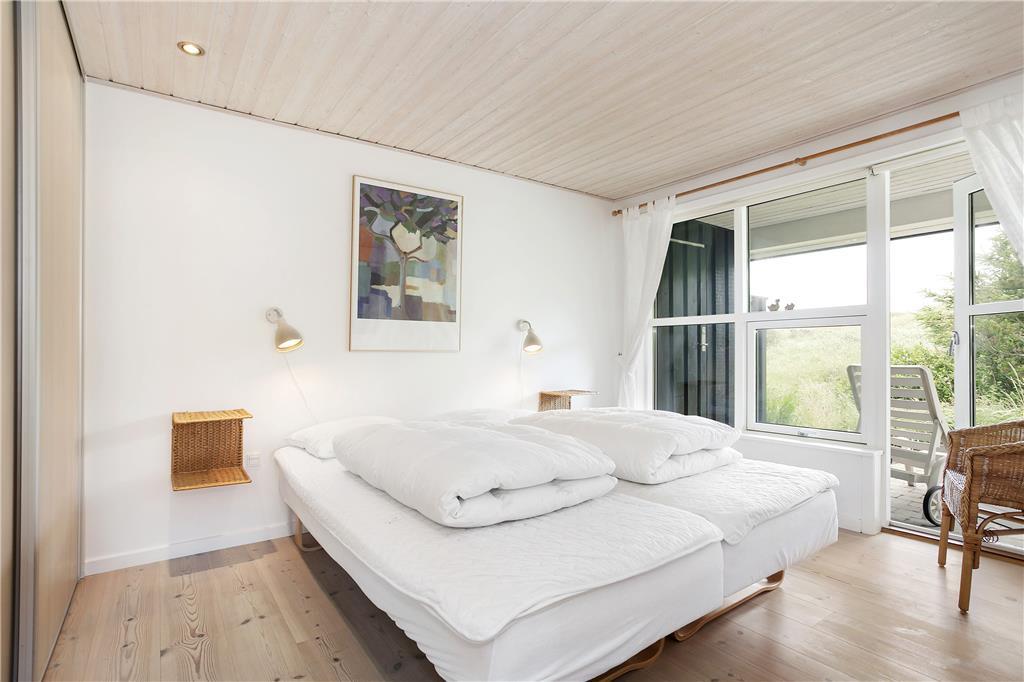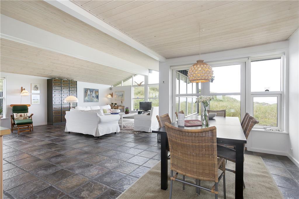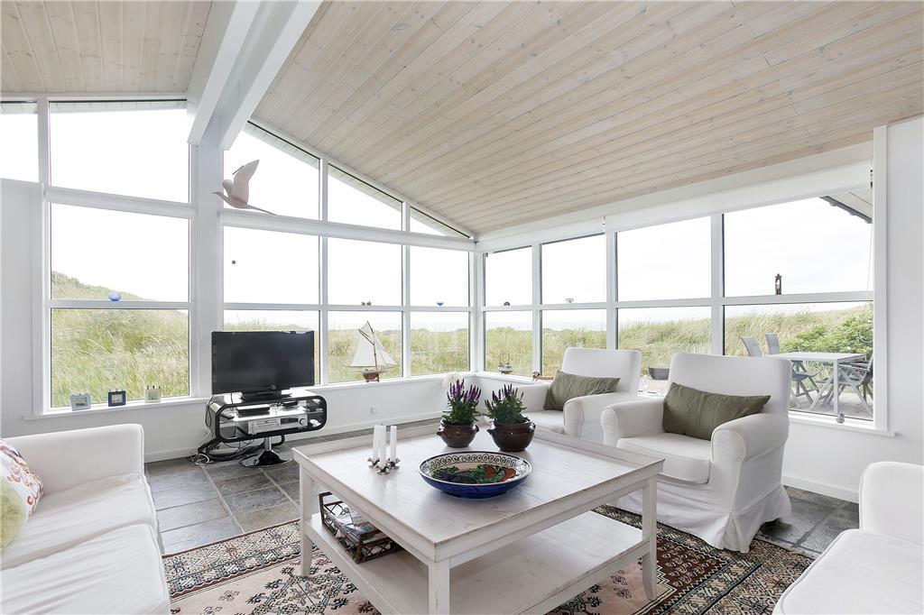 Dette fine sommerhus har alt, hvad en vellykket ferie ved Vesterhavet skal indeholde: et gennemrenoveret og velfungerende hus med en formidabel havudsigt, gode terrasser og kun en lille gåtur til strandkanten. Huset er smagfuldt indrettet og godt udstyret; bl.a. med sauna, vaskemaskine og tørretumbler på det ene badeværelse og naturligvis med gratis og trådløst internet, så man hurtigt kan tjekke vejrudsigten og søge informationer om områdets mange muligheder. Det fantastisk flotte opholdsrum bliver det helt naturlige samlingssted for hele familien; her kan man sidde i de behagelige møbler og nyde udsigten over klitlandskabet og Vesterhavet, og med ild i brændeovnen spreder hyggen sig hurtigt. Sommerhusets tre soveværelser er placeret, så man på meget praktisk vis kan dele sig op i en voksen og en børneafdeling; alternativt vil to par, som ønsker at holde ferie sammen, også hurtigt finde sig til rette her.