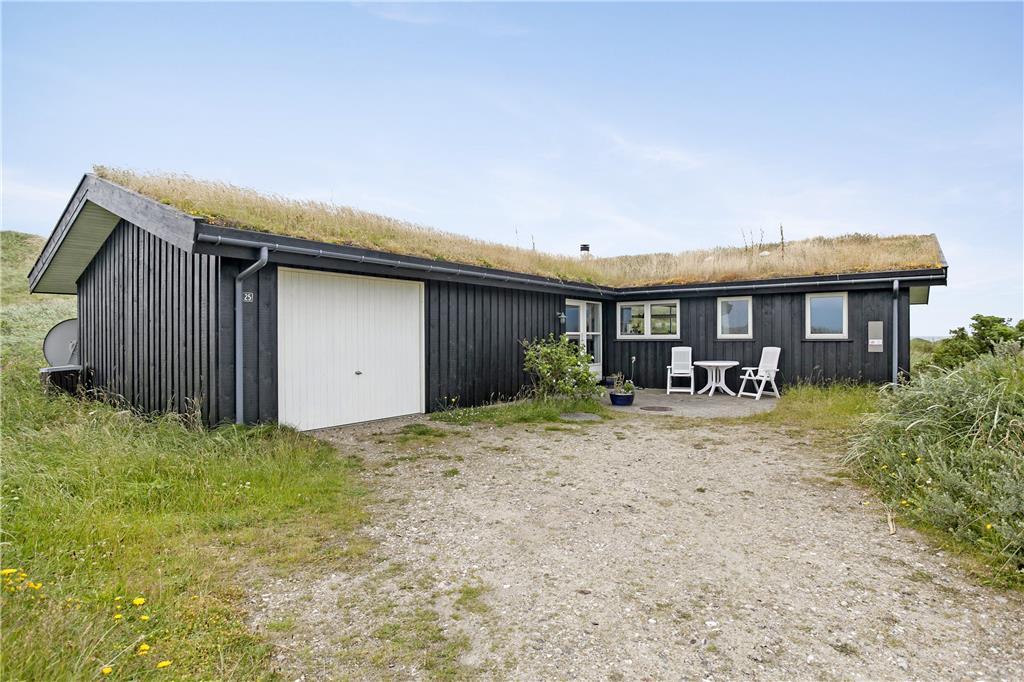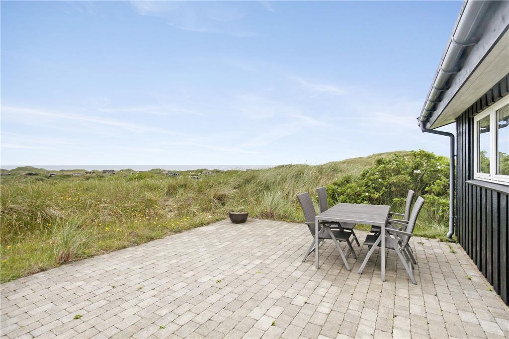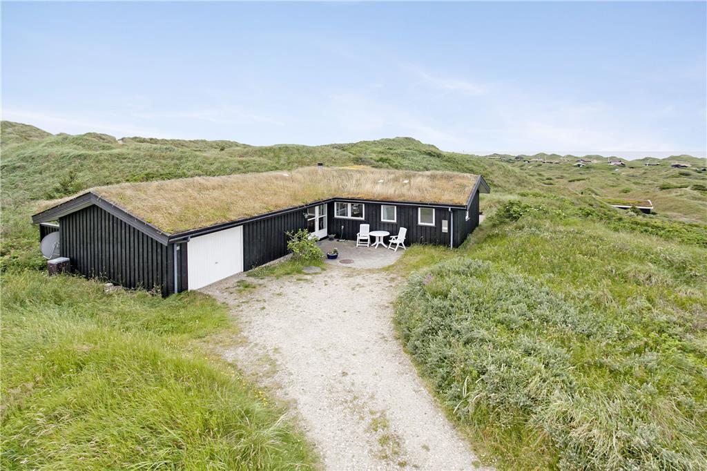 Sommerhuset ligger på en stor og kuperet klitgrund med højt græs, marehalm og lidt buske. Taget er dækket med græstørv og huset falder dermed helt naturligt ind i omgivelserne, mens bilen kan stå godt beskyttet for salt og sand i garagen. Terrasserne ligger på flere sider af sommerhuset, og man har derfor altid mulighed for at finde en ugeneret plads i solen. Om aftenen kan man forlænge dagen lidt på den overdækkede terrasse med et godt glas vin og lyden af Vesterhavet i baggrunden. Dansk sommer når den er bedst!
