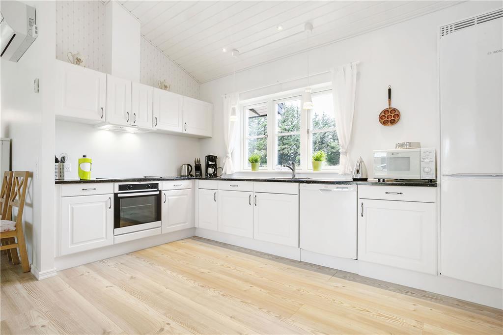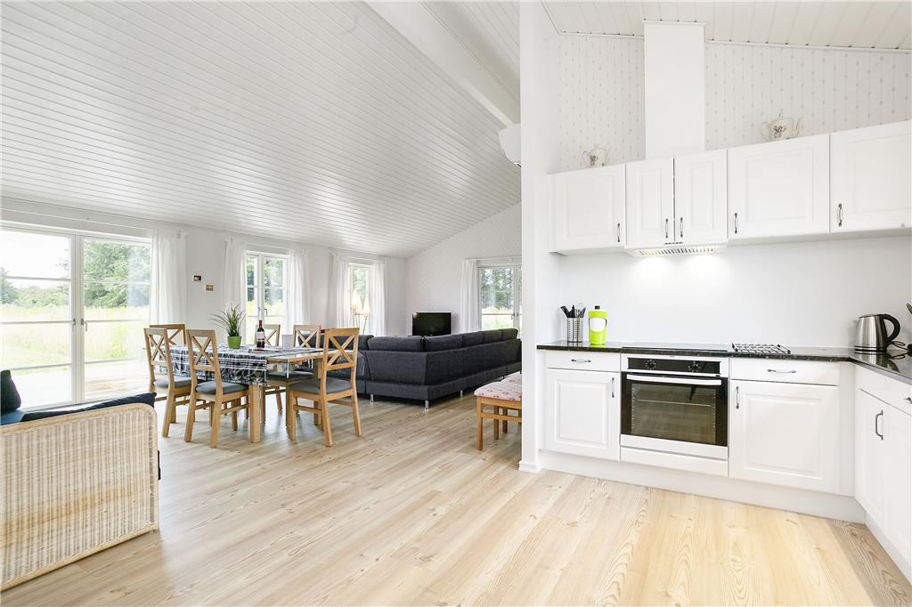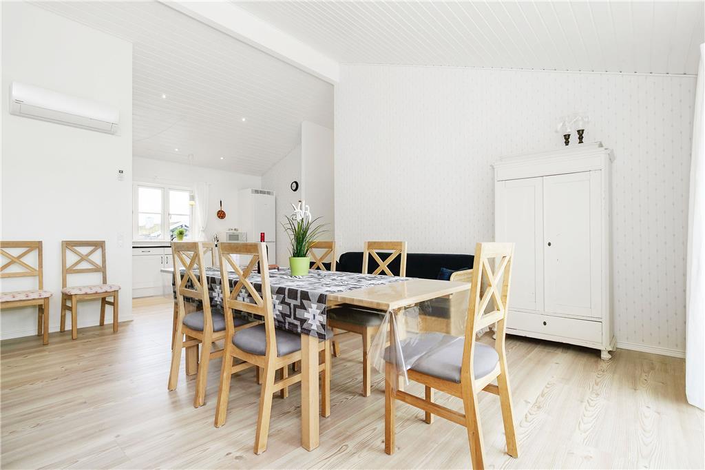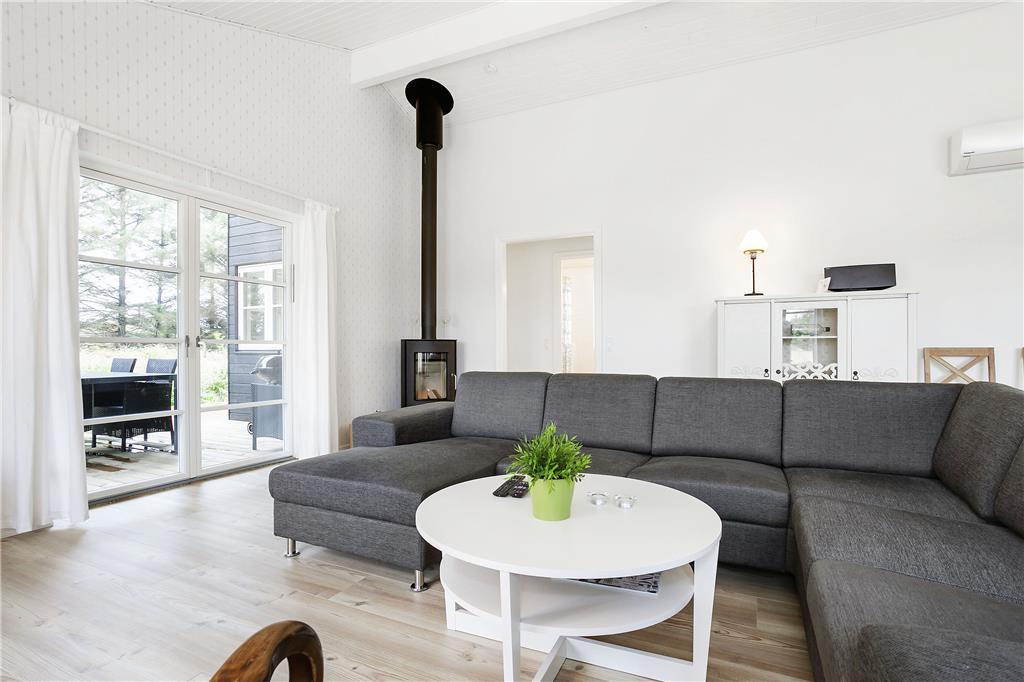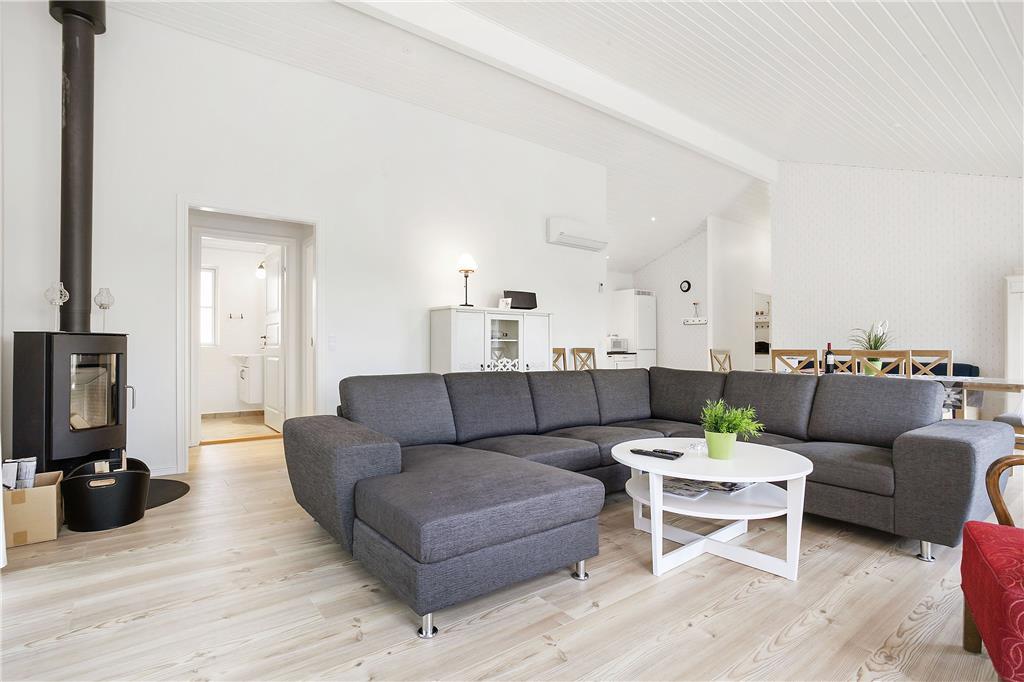 Træd ind i dette lyse og indbydende sommerhus, hvor højt til loftet og store vinduer skaber en rummelig atmosfære. Det åbne køkken-alrum er perfekt til fælles madlavning og samvær, mens den hyggelige stue med brændeovn indbyder til afslapning. De fire komfortable soveværelser sikrer en god nats søvn, og de to stilfulde badeværelser, hvoraf det ene har både spabad og sauna, giver mulighed for ekstra forkælelse.