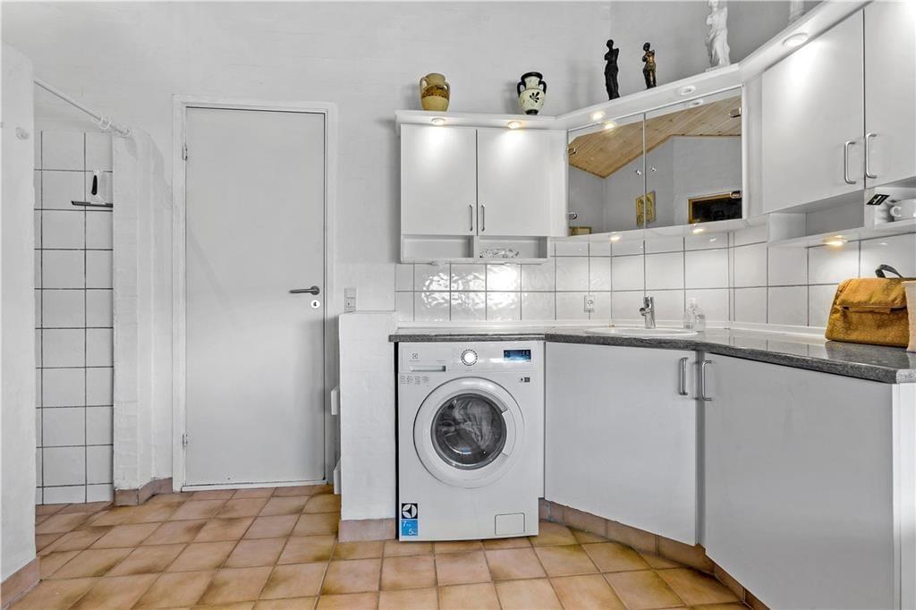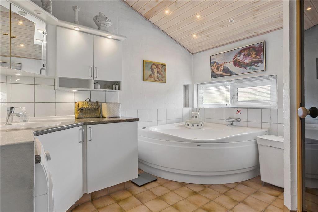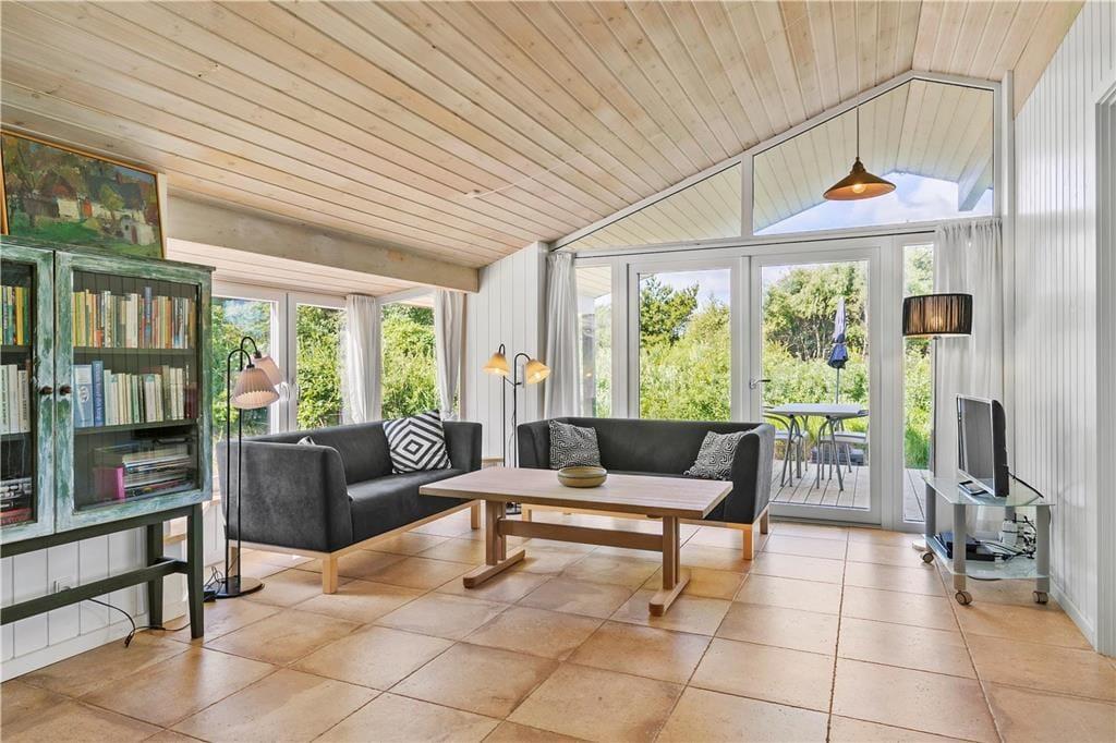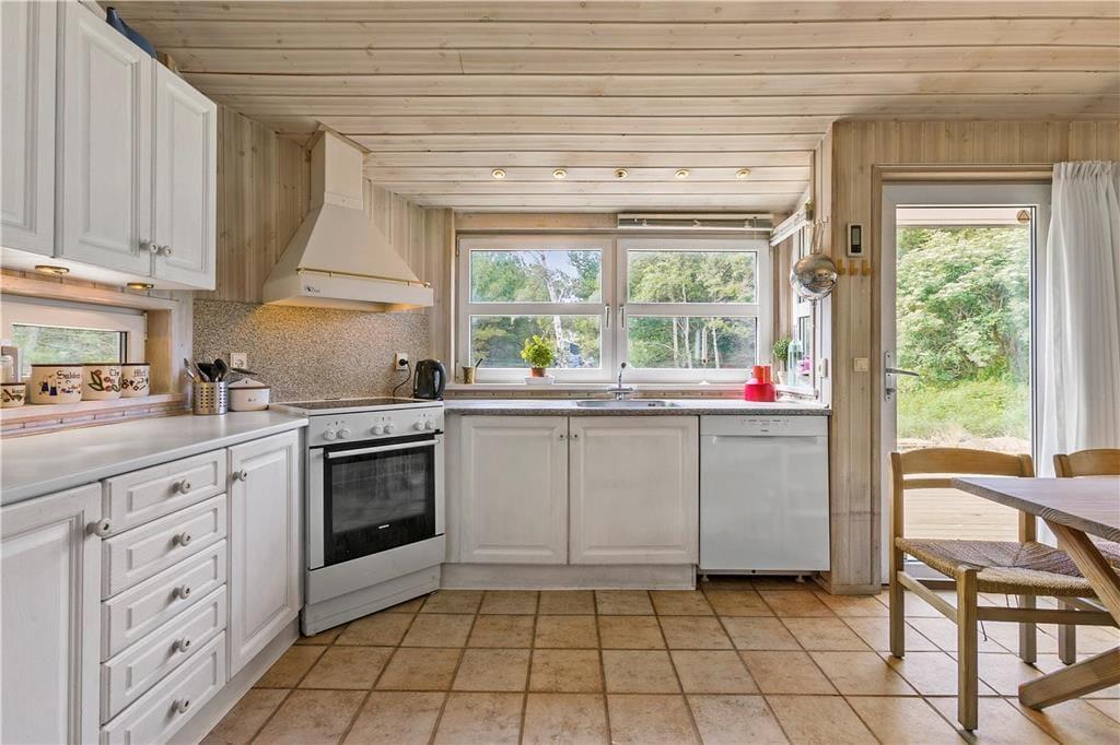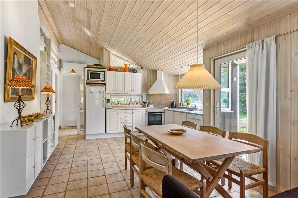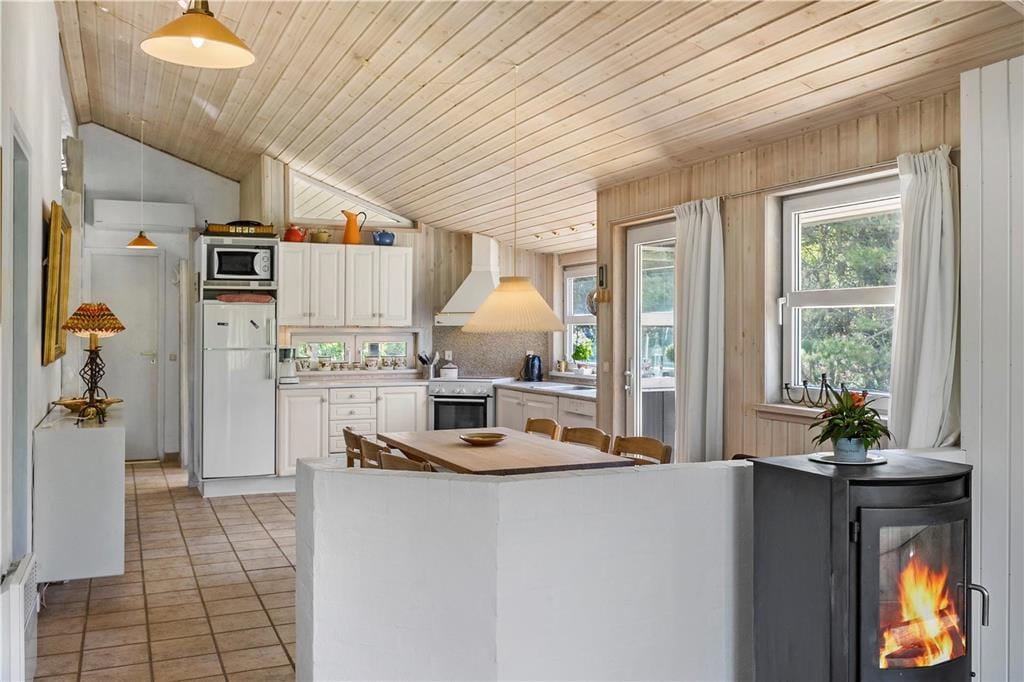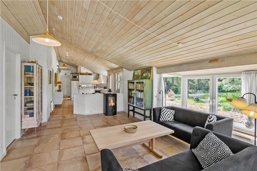 Indenfor i sommerhuset vil du hurtigt mærke den hyggelige stemning, der er skabt af både de store vinduespartier og de lyse farvetoner, der fylder huset med varme og ro. Den åbne planløsning med stue og køkken-alrum i ét skaber et ideelt rum til samvær, hvad enten I samles omkring et måltid eller til en stille stund ved brændeovnen. De høje lofter giver en luftig følelse, og fra stuen er der direkte adgang til naturgrundens store udearealer. Det flotte badeværelse med både spabad og sauna er et ekstra plus, hvor du kan forkæle dig selv efter en lang dag med udendørs aktiviteter eller en tur på stranden.