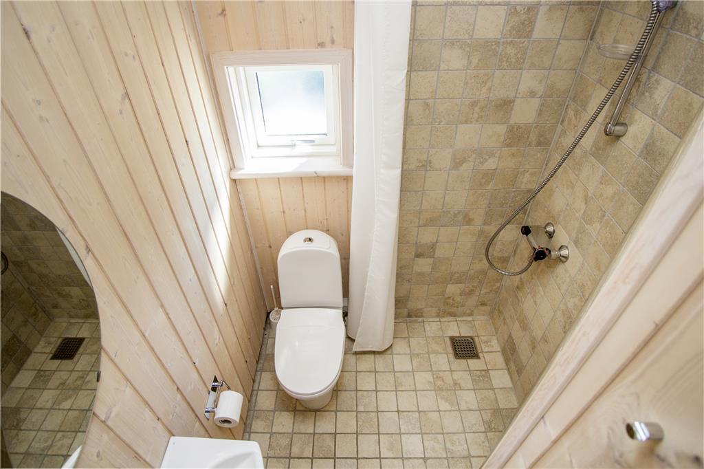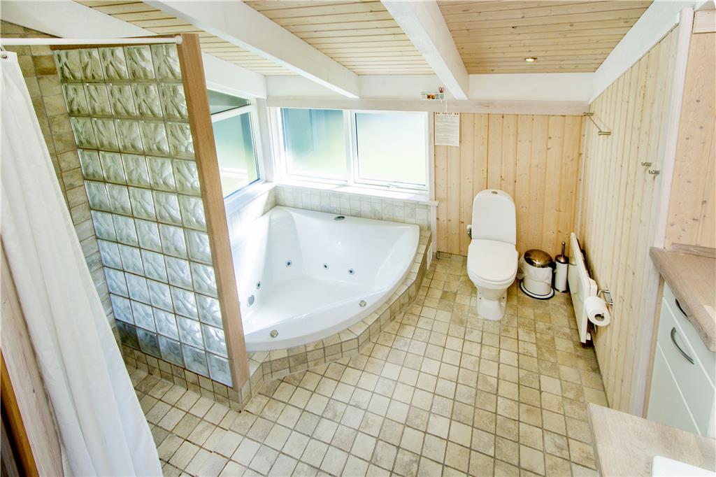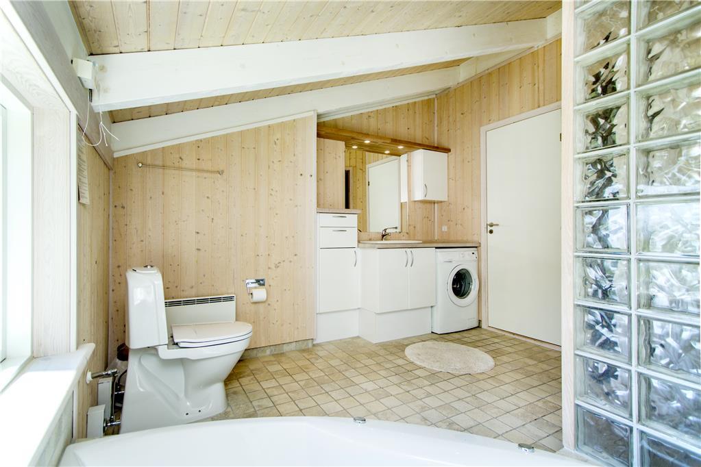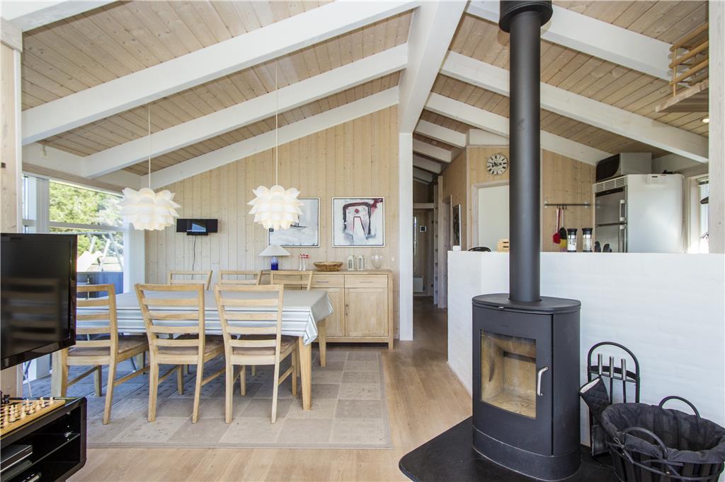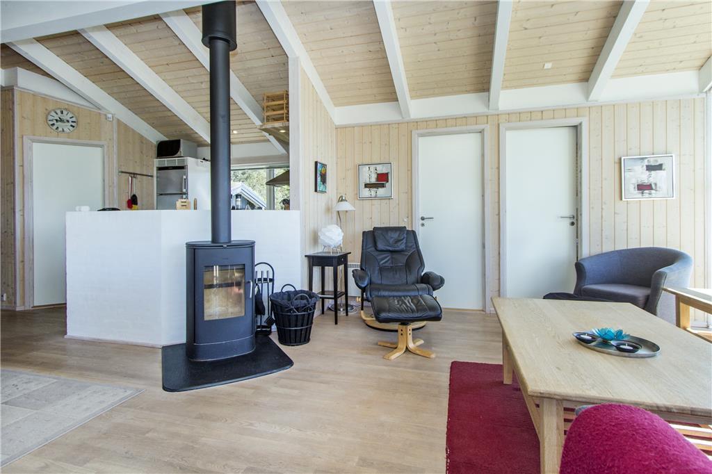 Når du træder indenfor i sommerhuset, mødes du af en lys og indbydende stue med store vinduespartier, der åbner op til det smukke landskab. Det høje loft og de åbne rum giver en følelse af rummelighed, og her er der plads til både hygge og samvær. Det åbne køkken-alrum er perfekt til fælles madlavning, og den stemningsfulde brændeovn bidrager til en hyggelig atmosfære på de køligere dage. Det dejlige badeværelse, der er udstyret med et spabad, giver en ekstra luksus, som gør det let at slappe af og nyde ferien.