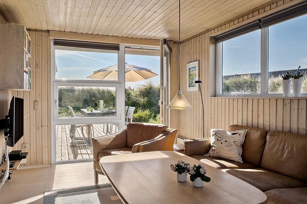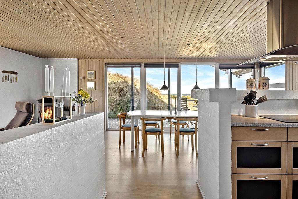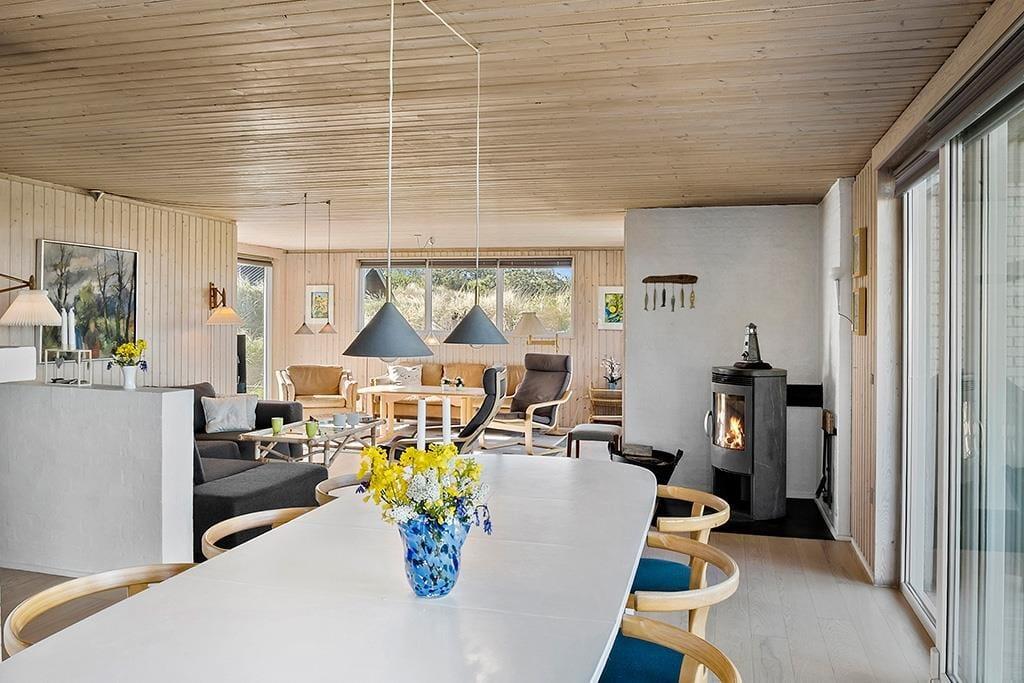 Indenfor er sommerhuset fyldt med den klassiske sommerhusstemning, som gør det til et ideelt valg for både små og store familier. Den åbne opholdsstue er hjertet i huset og indbyder til hygge og samvær med dem, du holder af. Store vinduespartier giver en fantastisk udsigt til den omkringliggende natur og havet i horisonten. I stuen er der plads til at slappe af og nyde en god bog ved brændeovnen eller til at spille brætspil med familien. Det hyggelige køkken gør det nemt at tilberede de dejligste måltider, som kan nydes sammen ved spisebordet, mens I kigger ud på naturen.