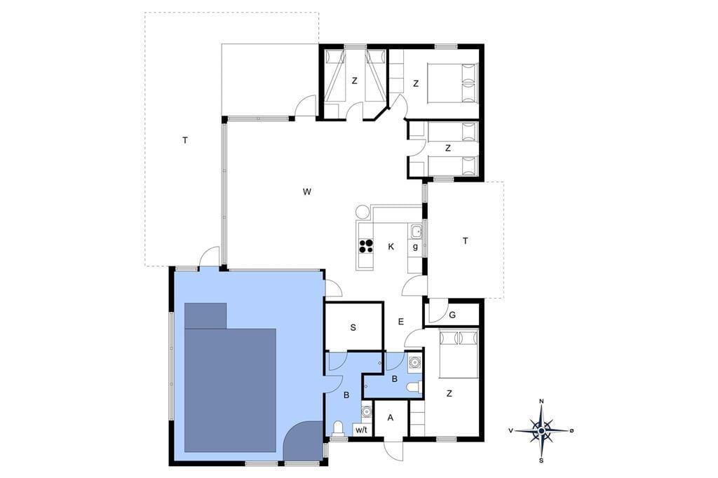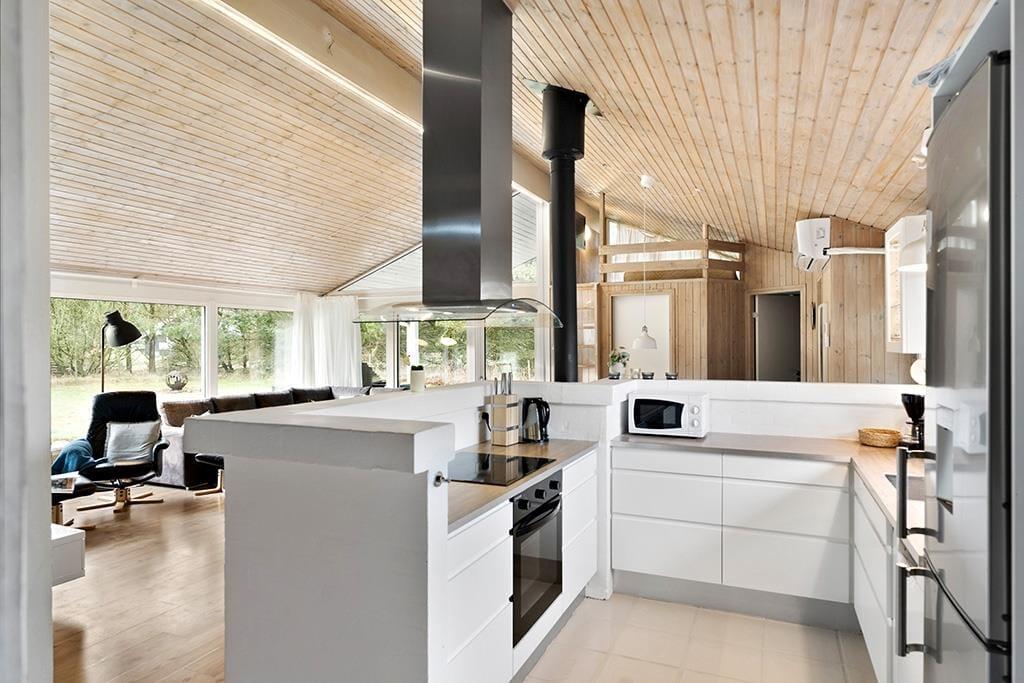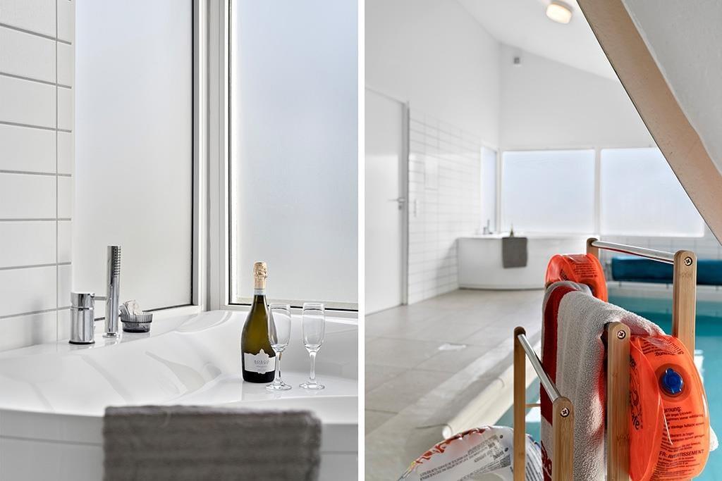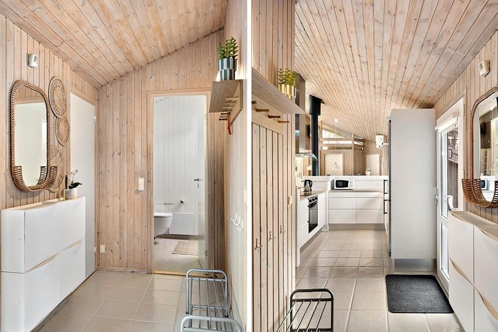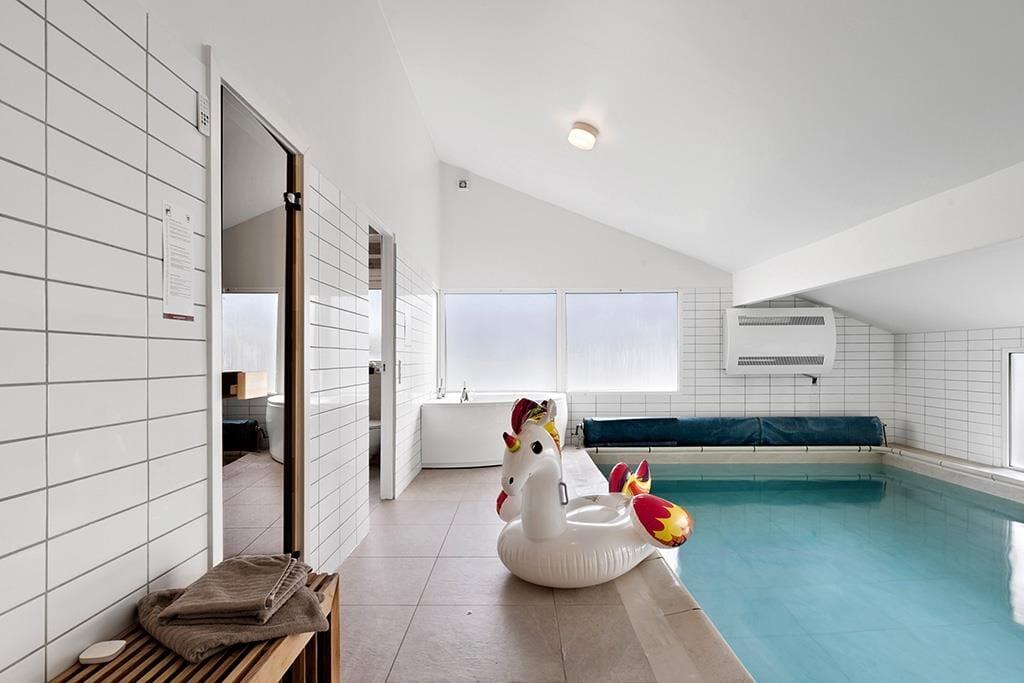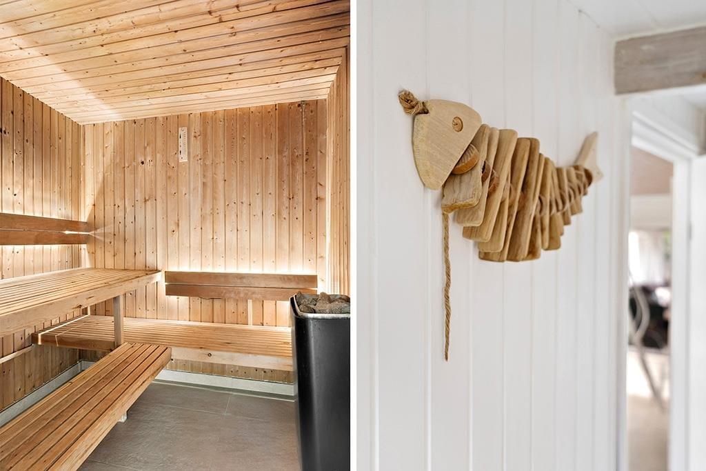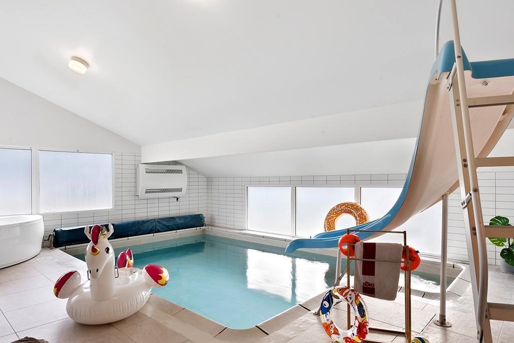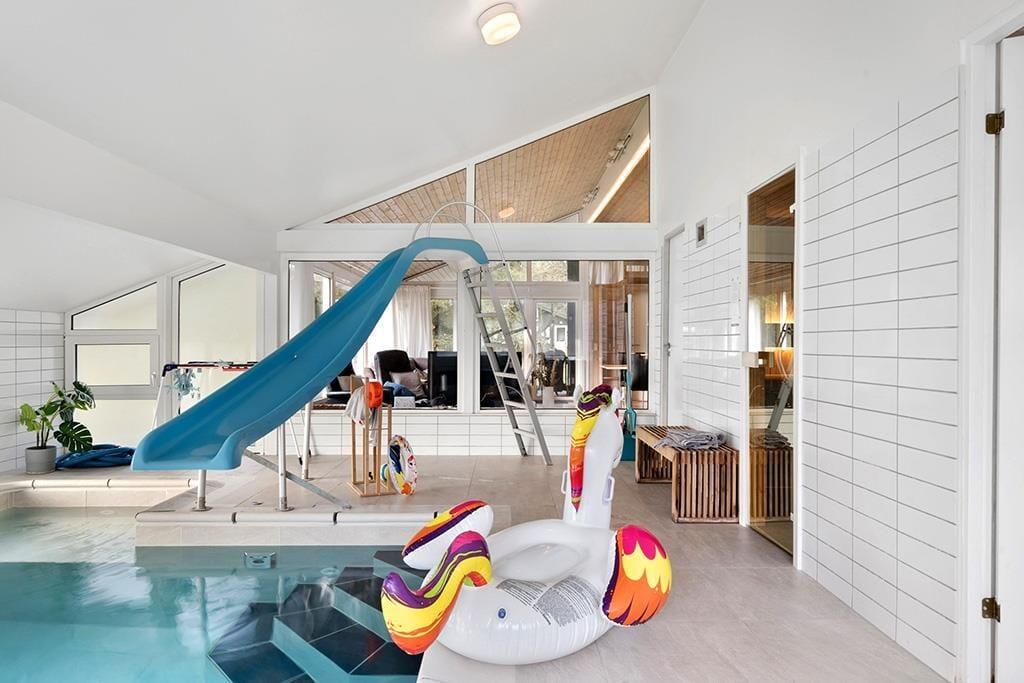 Når du træder ind i sommerhuset, bliver du mødt af en stor og lys stue, der naturligt binder huset sammen med et åbent køkkenalrum. Den åbne planløsning skaber et rummeligt og indbydende miljø, hvor hele familien kan samles. Den hyggelige brændeovn er en perfekt detalje til de køligere dage, hvor du kan slappe af med en god bog, mens flammerne knitrer. Aktivitetsrummet, der er en af husets højdepunkter, giver både børn og voksne et væld af muligheder for underholdning – fra en forfriskende dukkert i poolen til en sjov tur ned ad vandrutschebanen eller afslapning i spaen. Poolen er ligeledes udstyret med en svømmetræner. Saunaen afslutter wellness-oplevelsen og gør det let at finde ro efter en aktiv dag.