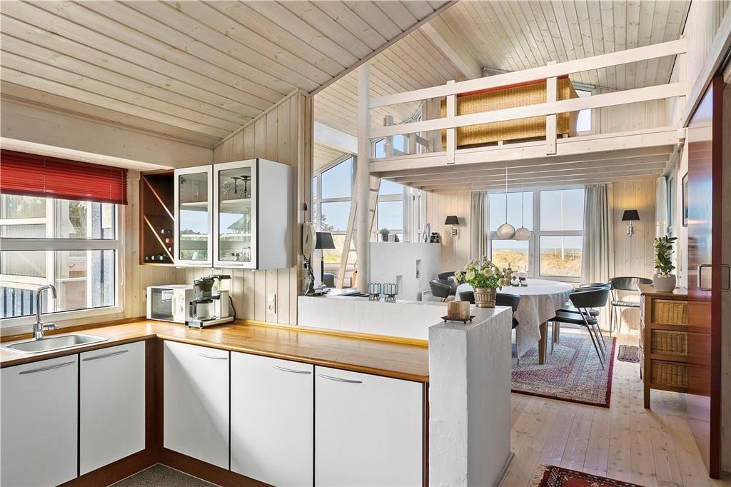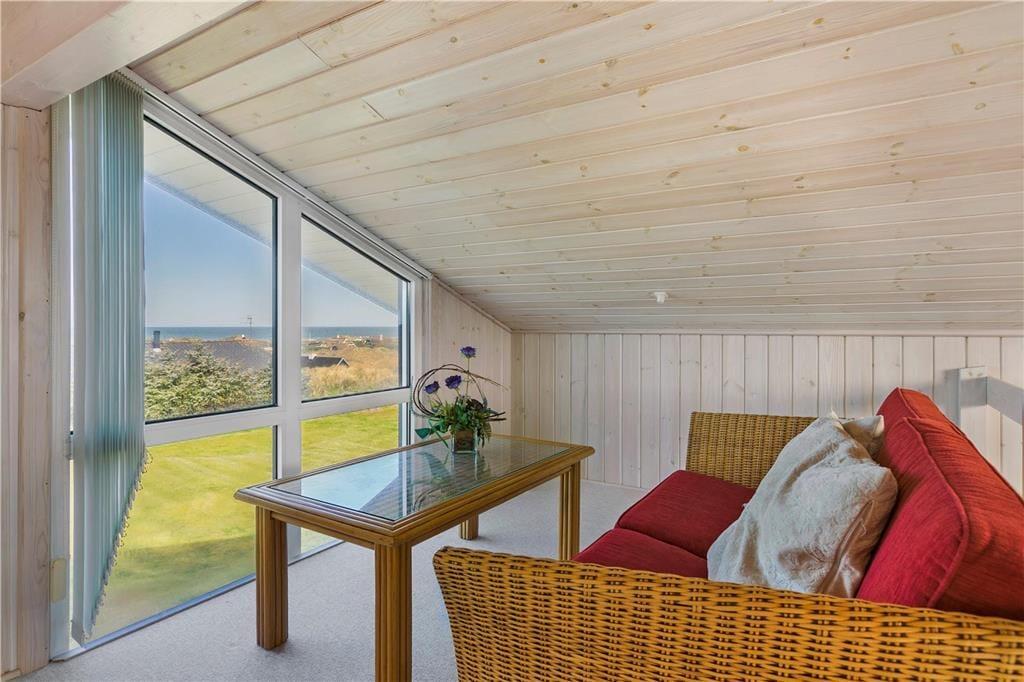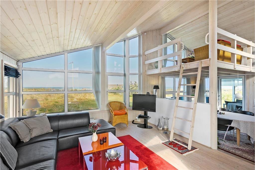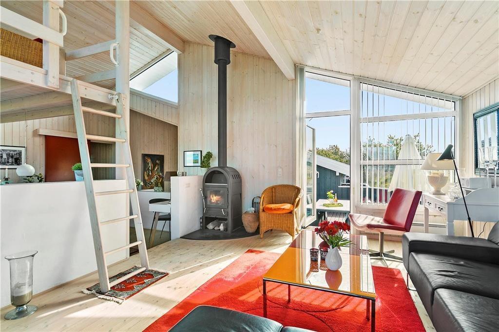 Sommerhuset byder velkommen med en lys og indbydende stue, hvor du kan varme dig foran brændeovnen og samtidig nyde den fantastiske havudsigt. De store vinduer giver masser af naturligt lys, og du kan høre bølgerne fra Vesterhavet, selv mens du slapper af indendørs. Det åbne opholdsområde skaber en hyggelig og afslappet atmosfære, og fra stuen er der direkte adgang til terrassen, hvor du kan nyde en kop kaffe og den friske luft. Huset har også en unik hems, hvor du kan sidde og beundre den smukke havudsigt – en perfekt spot til at fordybe dig i en god bog eller bare nyde stilheden.