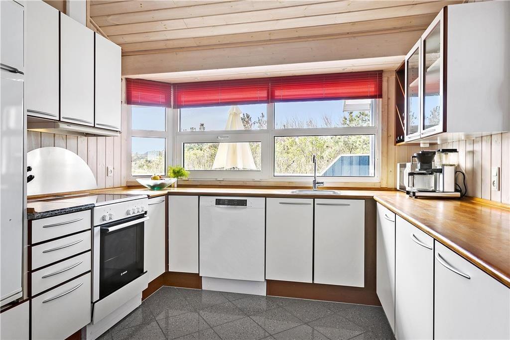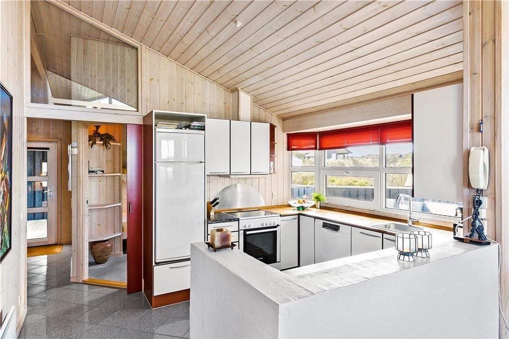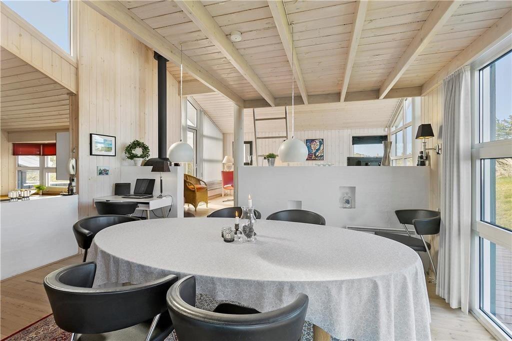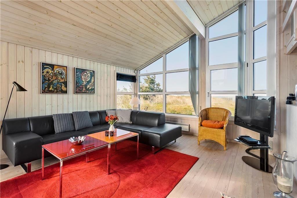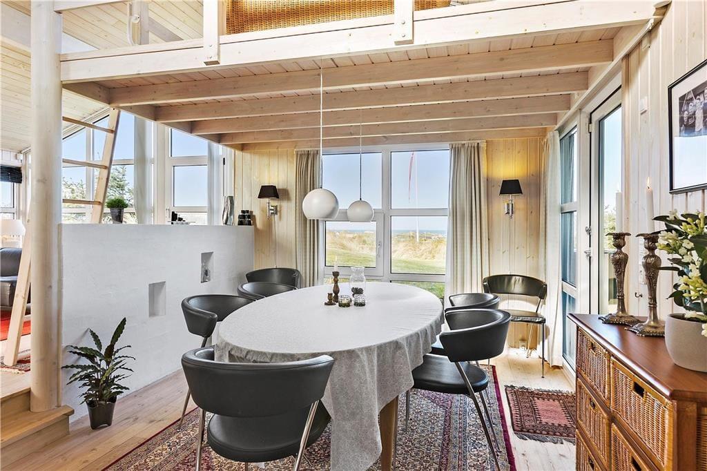 Sommerhuset byder velkommen med en lys og indbydende stue, hvor du kan varme dig foran brændeovnen og samtidig nyde den fantastiske havudsigt. De store vinduer giver masser af naturligt lys, og du kan høre bølgerne fra Vesterhavet, selv mens du slapper af indendørs. Det åbne opholdsområde skaber en hyggelig og afslappet atmosfære, og fra stuen er der direkte adgang til terrassen, hvor du kan nyde en kop kaffe og den friske luft. Huset har også en unik hems, hvor du kan sidde og beundre den smukke havudsigt – en perfekt spot til at fordybe dig i en god bog eller bare nyde stilheden.