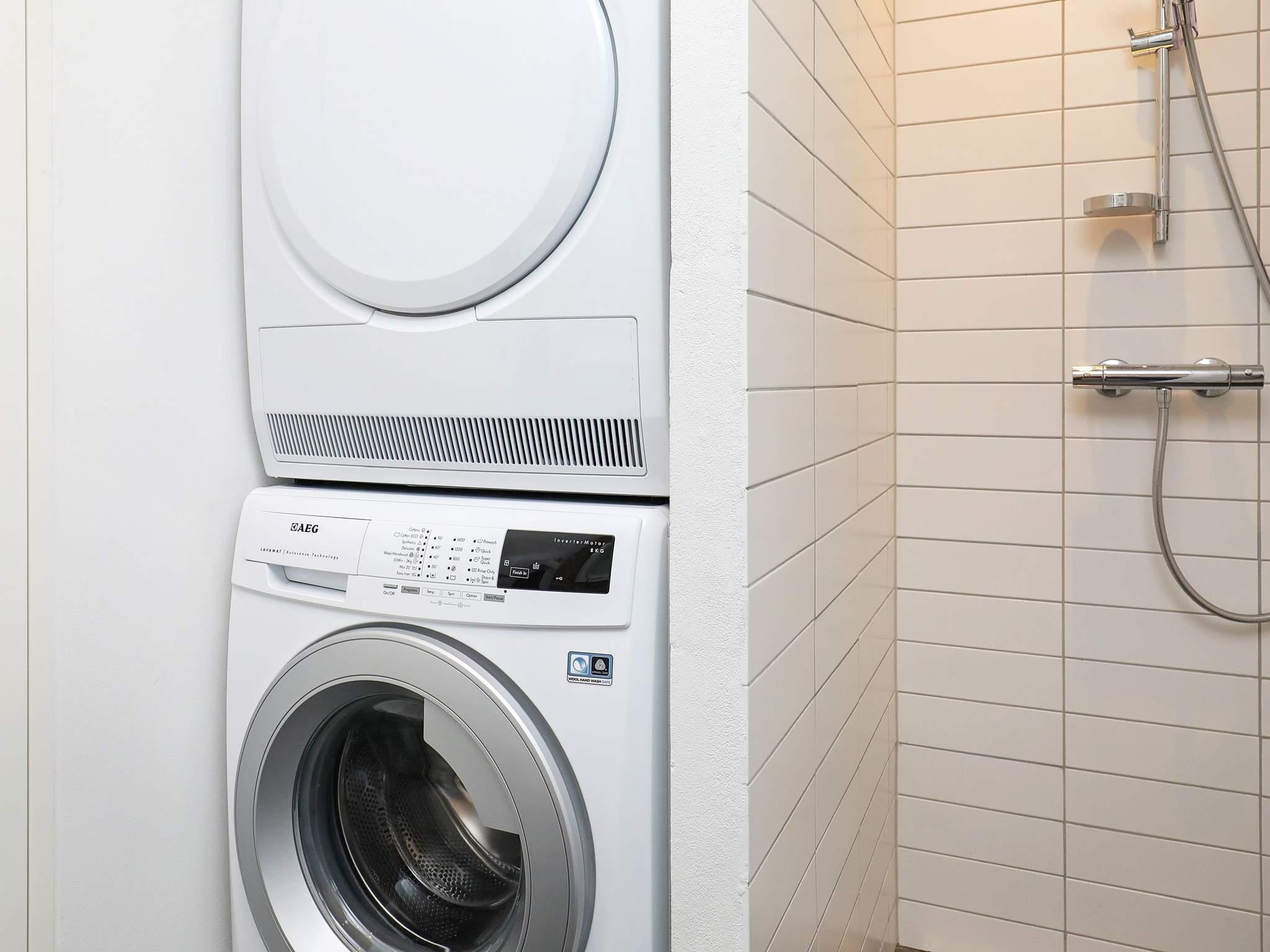 Køkkenafd.: El-komfur, køleskab, mikroovn, emhætte, kaffemaskine, opvaskemask., vaskemask., tørretumbler