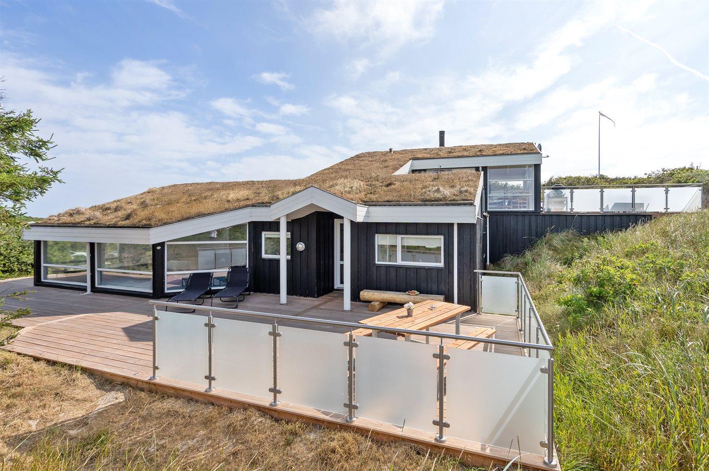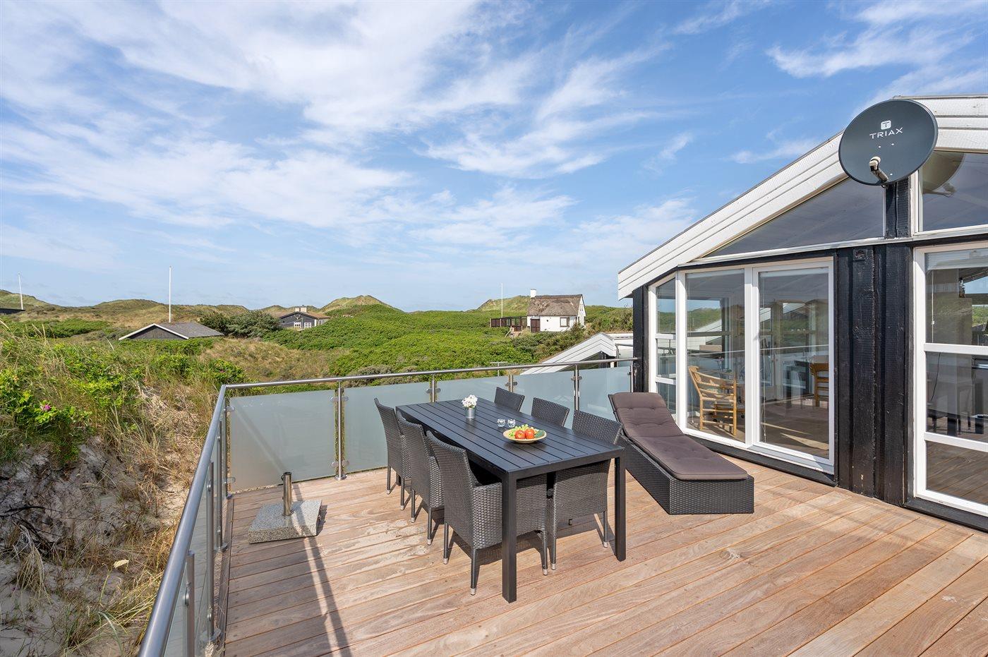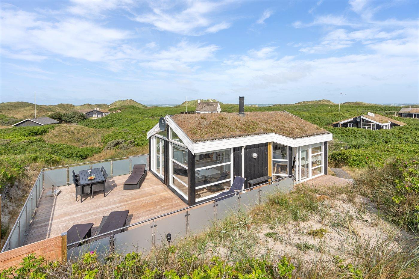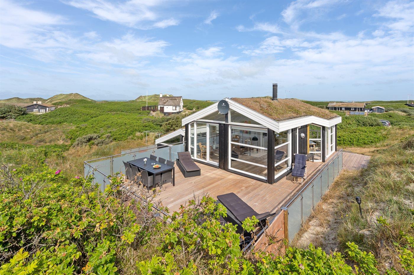 Dette indbydende luksussommerhus indeholder bl. a. swimmingpool, spa, sauna, vaskemaskine, tørretumbler, opvaskemaskine, mikrobølgeovn, fryser, stereoanlæg med CD-afspiller og TV med parabol (digital). Huset er i 2 plan, bygget i træ i 1991og delvist renoveret i 2009 med bl.a. nyt køkken. Huset ligger på en stor, kuperet natur-/klitgrund, kun 230 m fra Vesterhavet og der er havudsigt fra grunden. Til huset hører stort, åbent terrasseareal med diverse havemøbler. Dels trægulve, dels opvarmet klinkegulv. Væggene og lofterne er beklædt med hvidmalet træ. Ny, flot køkkenafdeling (2009) kombineret med spise-/opholdsstuen. Der findes brændeovn samt gratis, trådløs internetforbindelse (computer skal medbringes). Huset indeholder 2 badeværelser, begge med bruseniche. Stor, pragtfuld swimmingpool-afdeling. 4 komfortable soverum (2 med dobbeltseng, 1 med 2 enkeltsenge og 1 med 2 køjer). Der er god skabsplads. Huset er smagfuldt og hyggeligt indrettet. Høj barnestol forefindes. Carport. Der er installeret oplader til elbil. Gynge til børnene. Huset er velegnet til såvel 1 som 2 familier. Et dejligt, spændende sommerhus med en herlig beliggenhed i det kuperede klitområde ved den brede sandstrand ved Saltum. Bemærk: Trapper fører op til huset.