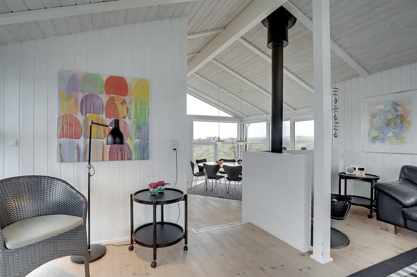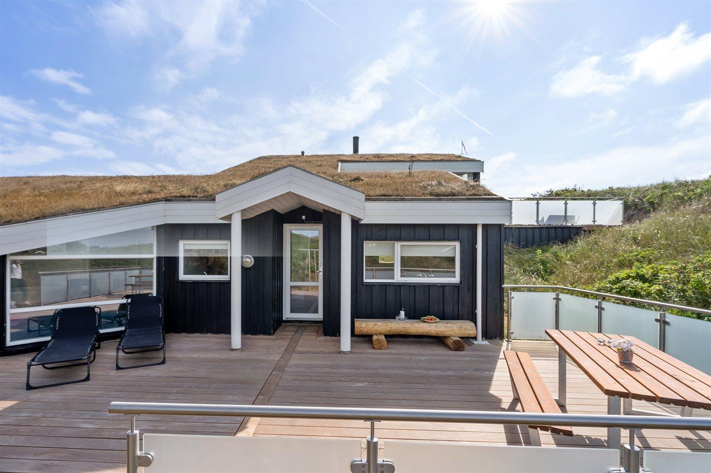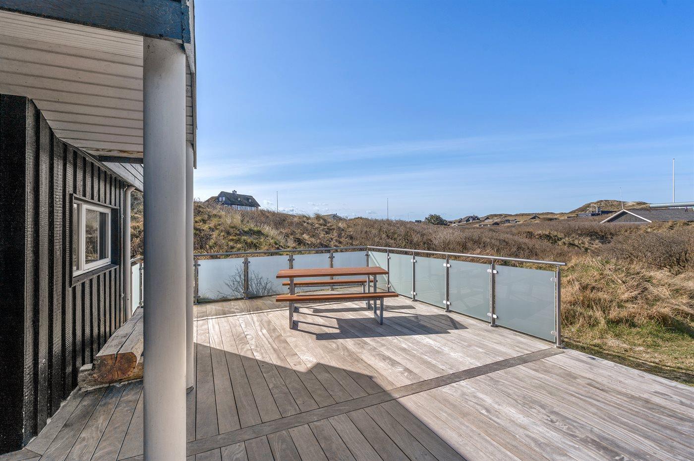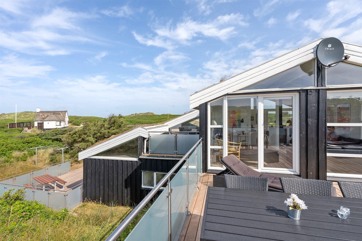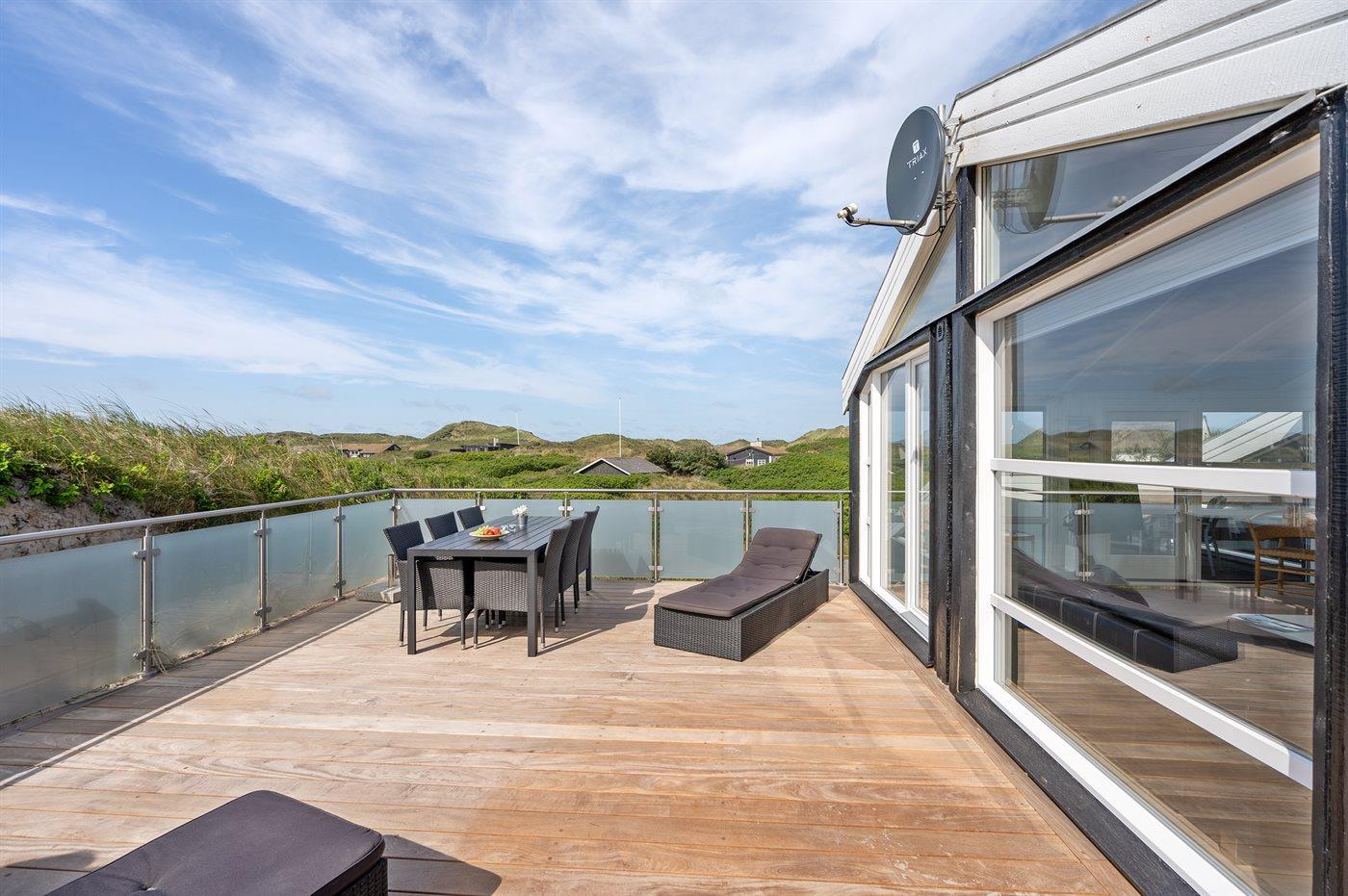 Dette indbydende luksussommerhus indeholder bl. a. swimmingpool, spa, sauna, vaskemaskine, tørretumbler, opvaskemaskine, mikrobølgeovn, fryser, stereoanlæg med CD-afspiller og TV med parabol (digital). Huset er i 2 plan, bygget i træ i 1991og delvist renoveret i 2009 med bl.a. nyt køkken. Huset ligger på en stor, kuperet natur-/klitgrund, kun 230 m fra Vesterhavet og der er havudsigt fra grunden. Til huset hører stort, åbent terrasseareal med diverse havemøbler. Dels trægulve, dels opvarmet klinkegulv. Væggene og lofterne er beklædt med hvidmalet træ. Ny, flot køkkenafdeling (2009) kombineret med spise-/opholdsstuen. Der findes brændeovn samt gratis, trådløs internetforbindelse (computer skal medbringes). Huset indeholder 2 badeværelser, begge med bruseniche. Stor, pragtfuld swimmingpool-afdeling. 4 komfortable soverum (2 med dobbeltseng, 1 med 2 enkeltsenge og 1 med 2 køjer). Der er god skabsplads. Huset er smagfuldt og hyggeligt indrettet. Høj barnestol forefindes. Carport. Der er installeret oplader til elbil. Gynge til børnene. Huset er velegnet til såvel 1 som 2 familier. Et dejligt, spændende sommerhus med en herlig beliggenhed i det kuperede klitområde ved den brede sandstrand ved Saltum. Bemærk: Trapper fører op til huset.