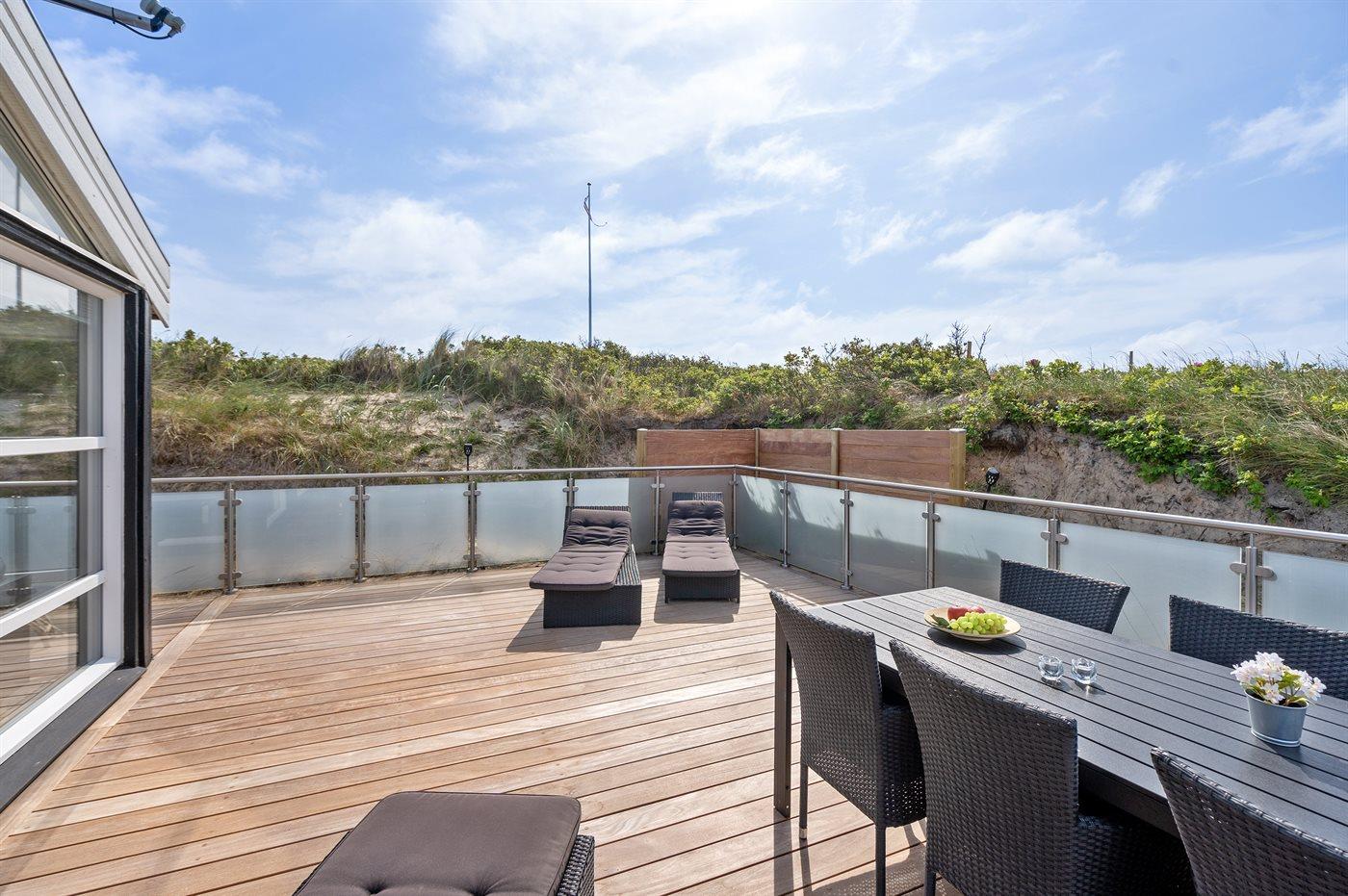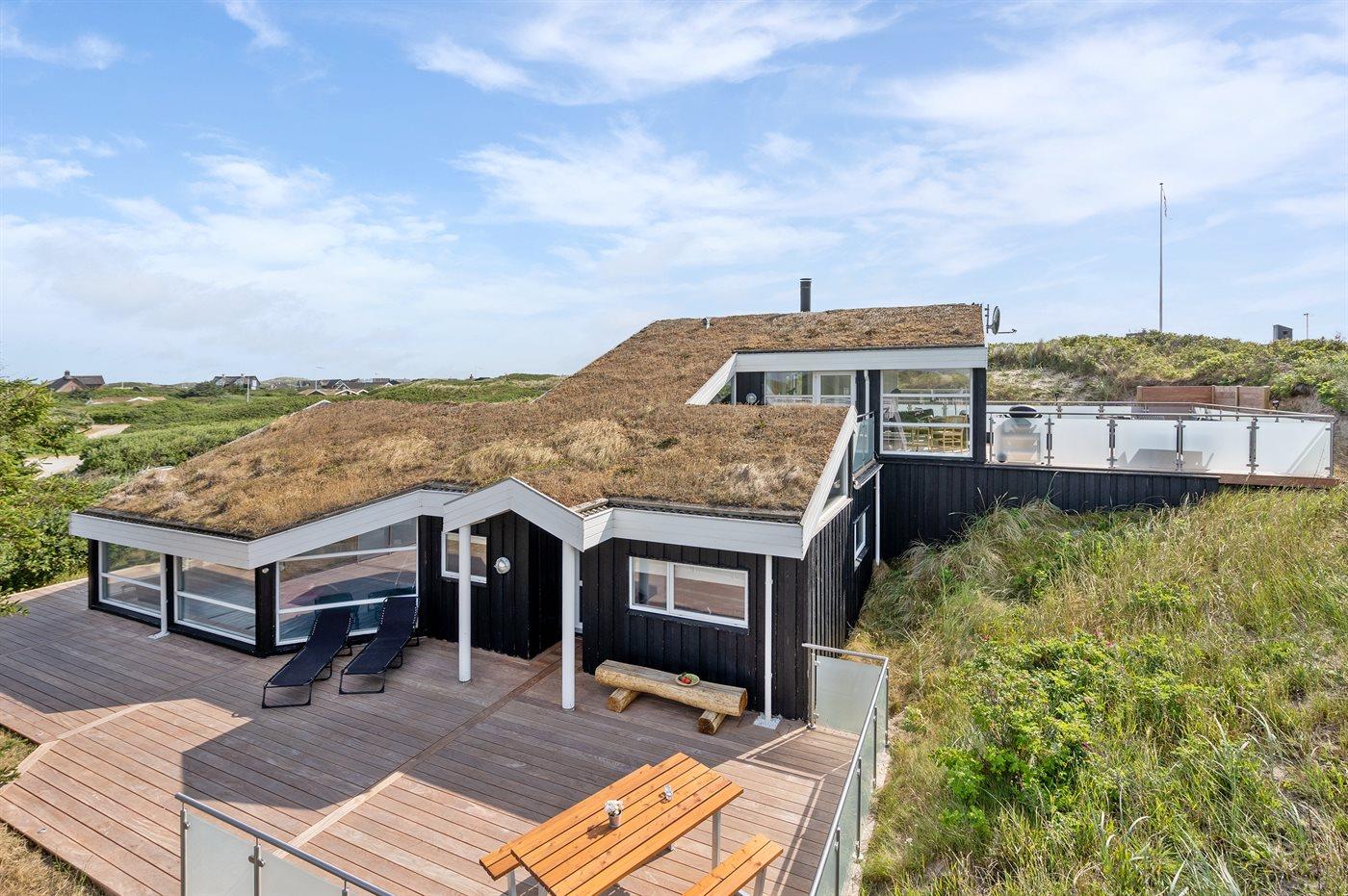 Luksussommerhus nær Vesterhavet med privat pool, spa, sauna og havudsigt på stor klitgrund.