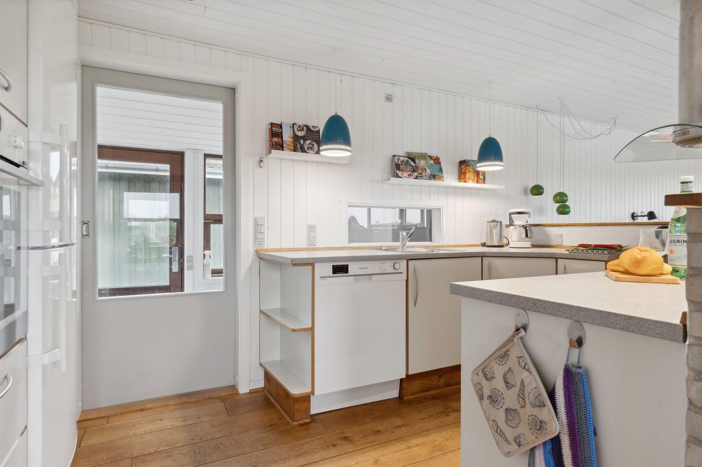 Køkkenet er udstyret med 1 køleskab. Der er 4 keramiske kogeplader, bageovn, mikrobølgeovn samt opvaskemaskine.