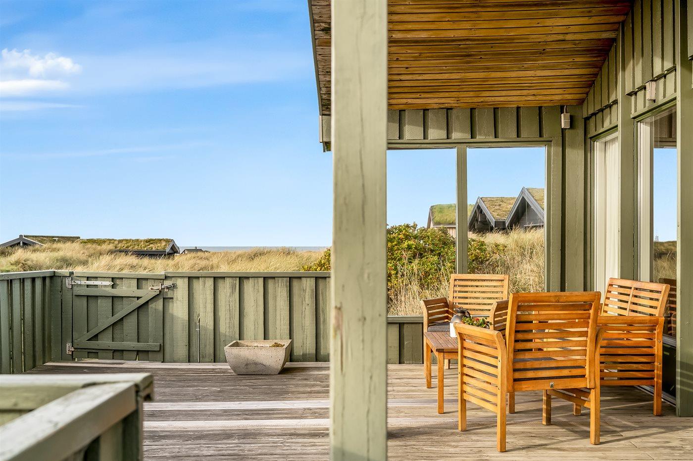 Hyggeligt sommerhus med havudsigt, stor terrasse og roligt naturområde nær Vesterhavet.