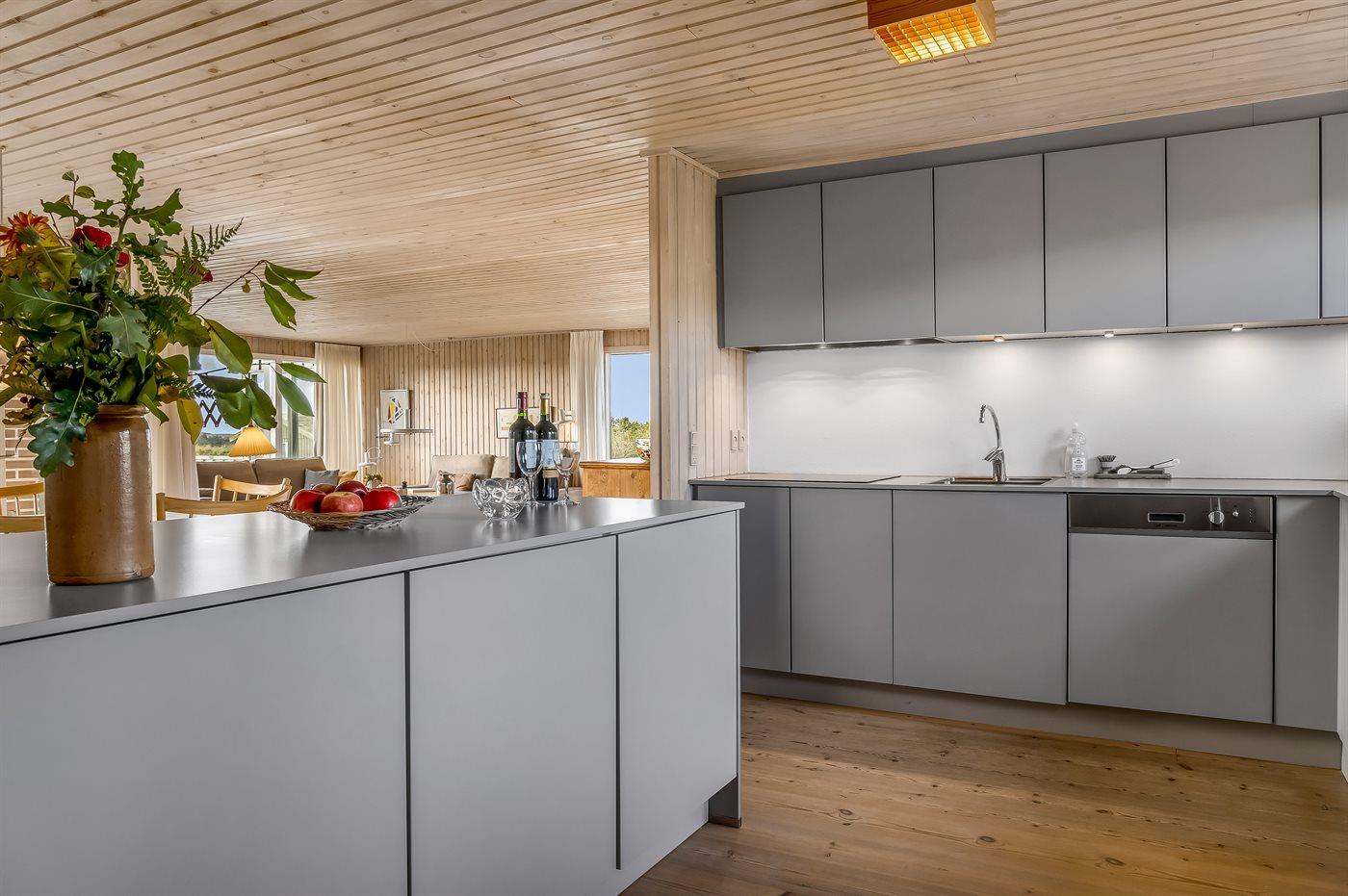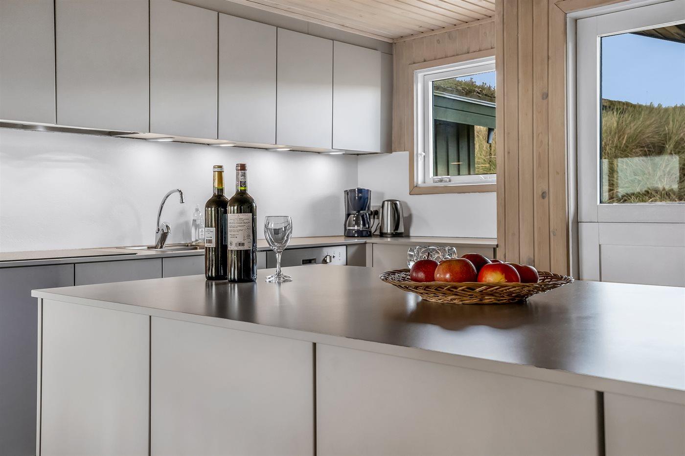 Køkkenet er udstyret med 1 køleskab. Der er 4 keramiske kogeplader, bageovn, mikrobølgeovn samt opvaskemaskine.