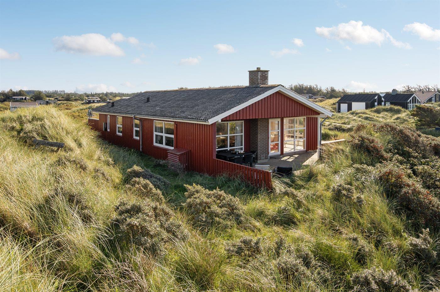 Rummeligt sommerhus højt beliggende på en skøn kuperet grund i storslået natur lige bag klitterne til stranden og Vesterhavet. Havudsigt fra såvel hus som grund. Til huset hører gode terrasser, naturligt afskærmet af klitter, med havemøbler.
