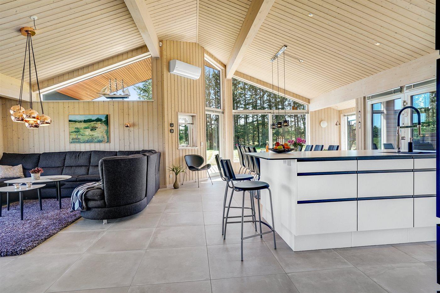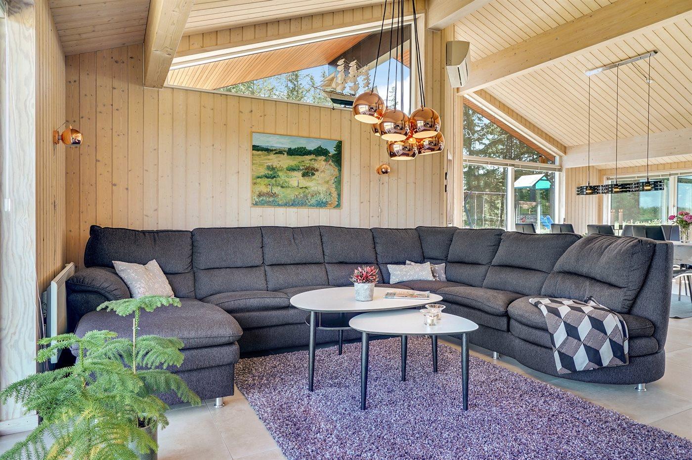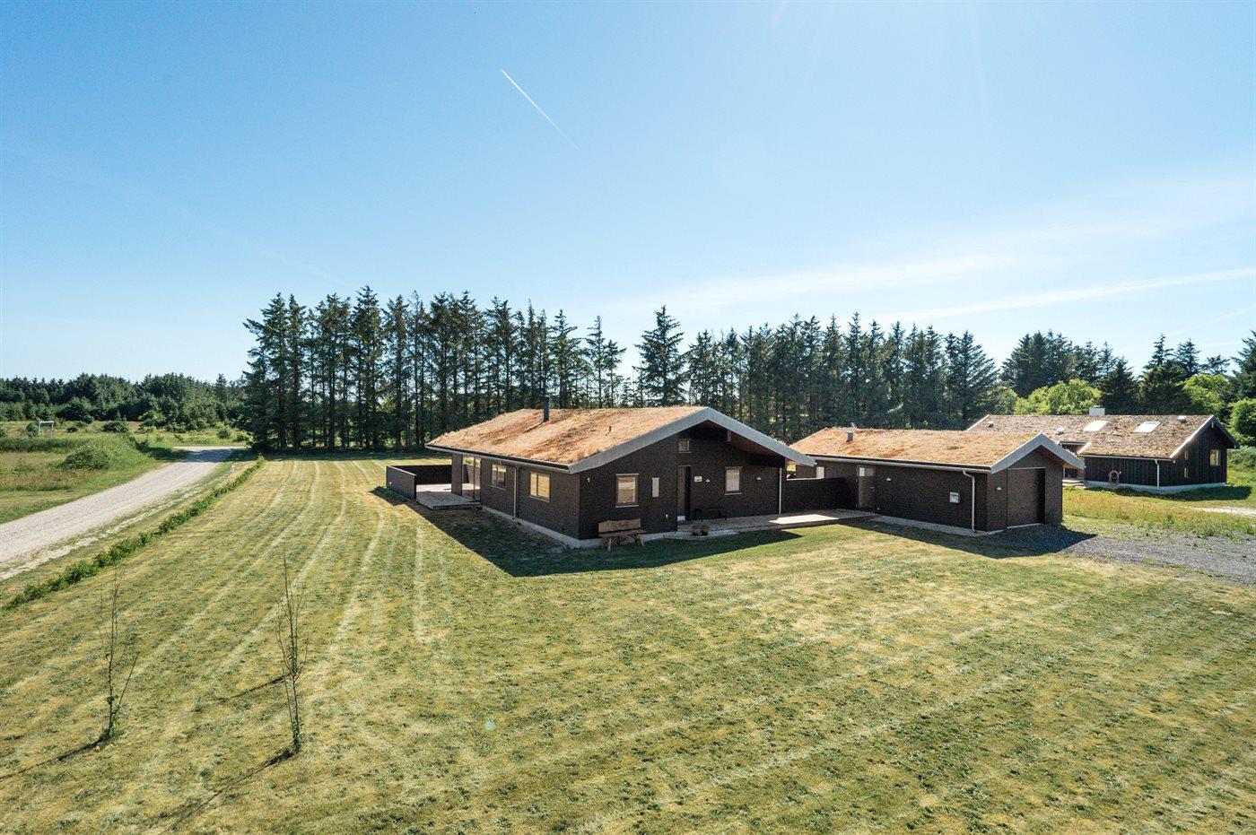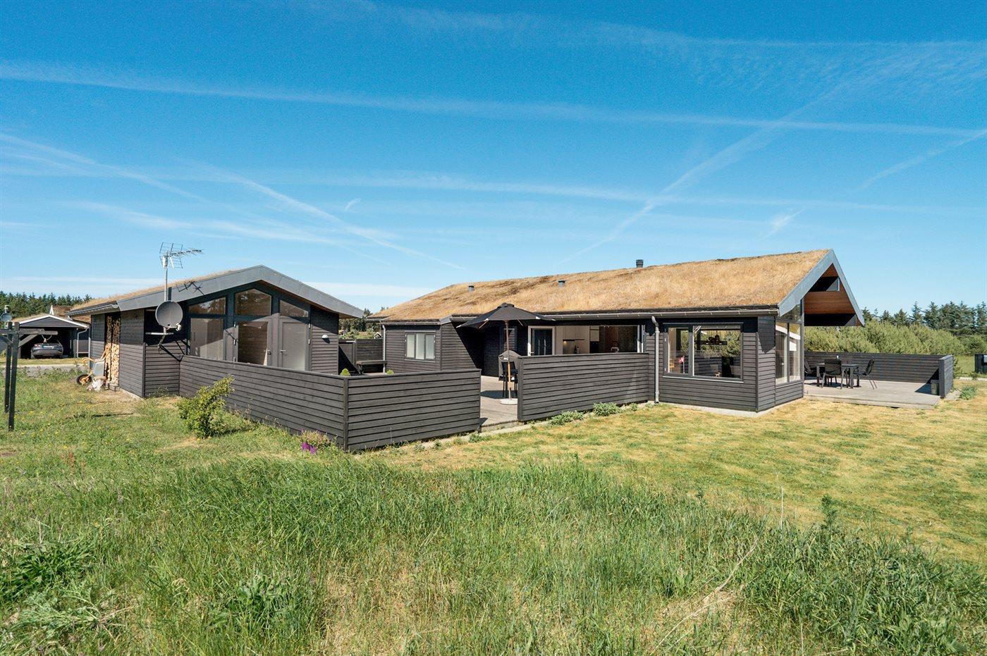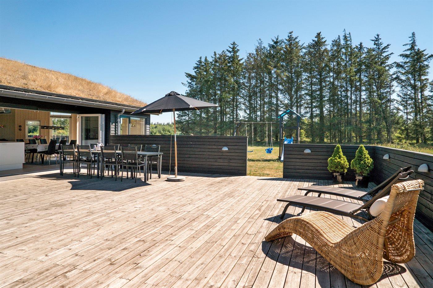 Stort, luksuriøst udstyret sommerhus i træ fra 2009 med spa og sauna. Huset, der er opført på en naturgrund, er omgivet af et meget stort terrasseareal, hvoraf en del er overdækket. Indvendigt er gulvene belagt med klinker, dog er der trægulv i 2 soveværelser. Rummeligt badeværelse med 2-pers. spa, sauna, gulvvarme, bruseniche og håndklædetørrer. Det flotte køkken er udstyret med opvaskemaskine, mikrobølgeovn, varmluftovn, fryser og komfur med keramiske kogeplader. En stor foldedør fra køkkenets spiseafdeling og ud til den overdækkede terrasse gør det muligt at lukke naturen helt ind i huset. Den luksuriøst udstyrede stue indeholder brændeovn, TV med digital parabol og DVD-afspiller. Huset har 2 soveværelser med dobbeltseng og praktisk walk-in-closet samt 1 soveværelse med 2 enkeltsenge. Endvidere findes anneks med 1 soverum med 2 enkeltsenge, ekstra TV og Playstation1 samt badeværelse med bruseniche. I tilknytning til annekset er indrettet et aktivitetsrum med komb. bordfodbold/mini bordtennis/airhockey, motionscykel, romaskine og musikanlæg. Til husets udstyr hører endvidere barneseng, høj barnestol, vaskemaskine og tørretumbler. Et skønt sommerhus tæt ved Fårup Sommerland, Vesterhavet og skovområde.