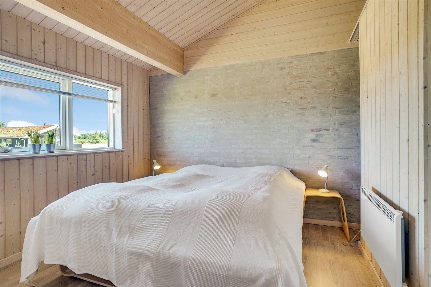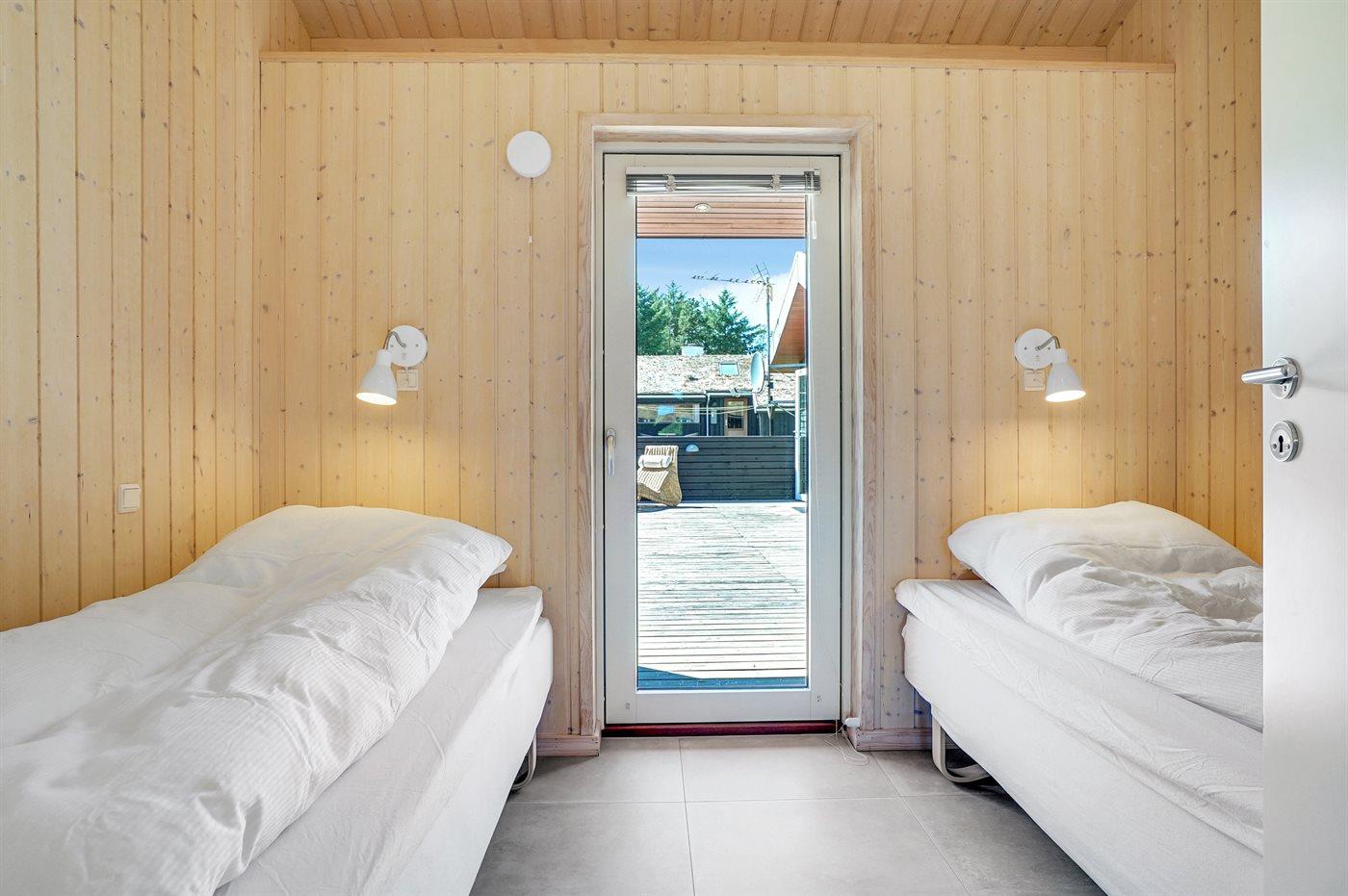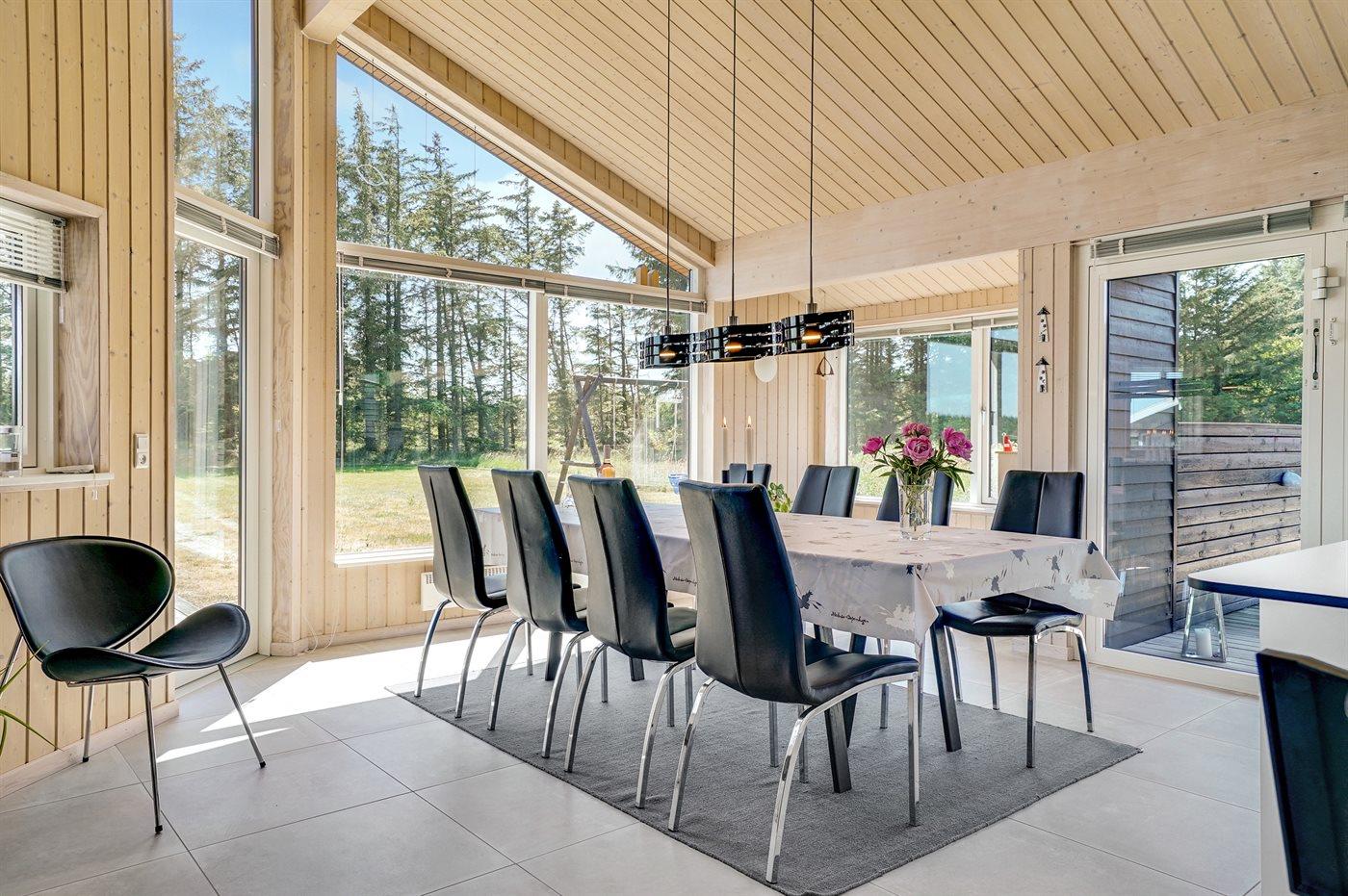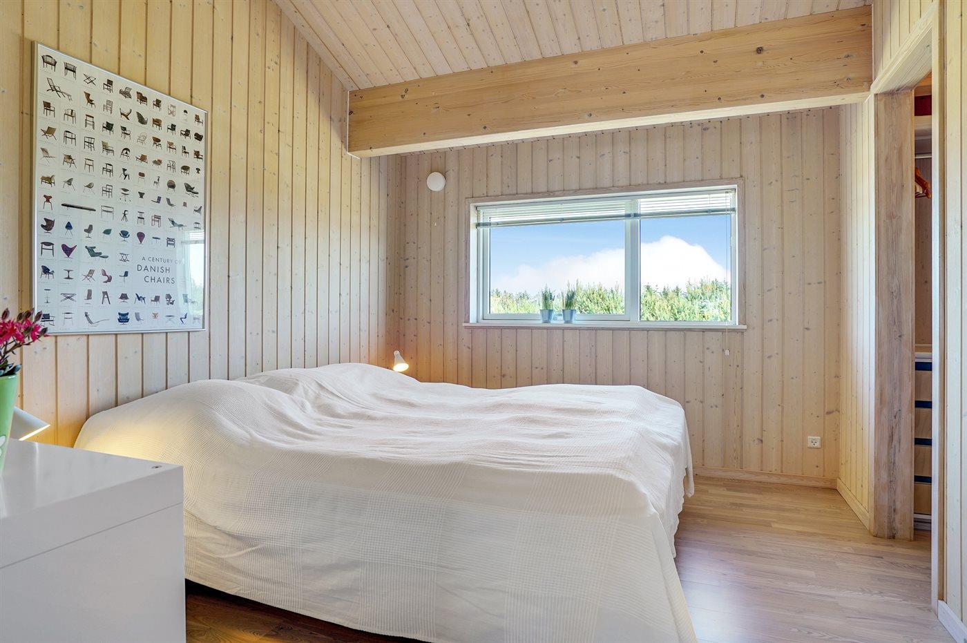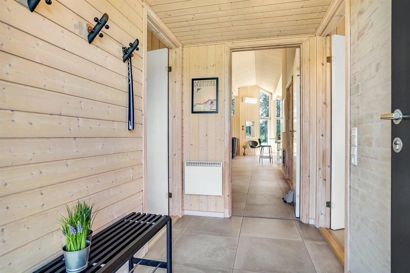 Stort, luksuriøst udstyret sommerhus i træ fra 2009 med spa og sauna. Huset, der er opført på en naturgrund, er omgivet af et meget stort terrasseareal, hvoraf en del er overdækket. Indvendigt er gulvene belagt med klinker, dog er der trægulv i 2 soveværelser. Rummeligt badeværelse med 2-pers. spa, sauna, gulvvarme, bruseniche og håndklædetørrer. Det flotte køkken er udstyret med opvaskemaskine, mikrobølgeovn, varmluftovn, fryser og komfur med keramiske kogeplader. En stor foldedør fra køkkenets spiseafdeling og ud til den overdækkede terrasse gør det muligt at lukke naturen helt ind i huset. Den luksuriøst udstyrede stue indeholder brændeovn, TV med digital parabol og DVD-afspiller. Huset har 2 soveværelser med dobbeltseng og praktisk walk-in-closet samt 1 soveværelse med 2 enkeltsenge. Endvidere findes anneks med 1 soverum med 2 enkeltsenge, ekstra TV og Playstation1 samt badeværelse med bruseniche. I tilknytning til annekset er indrettet et aktivitetsrum med komb. bordfodbold/mini bordtennis/airhockey, motionscykel, romaskine og musikanlæg. Til husets udstyr hører endvidere barneseng, høj barnestol, vaskemaskine og tørretumbler. Et skønt sommerhus tæt ved Fårup Sommerland, Vesterhavet og skovområde.