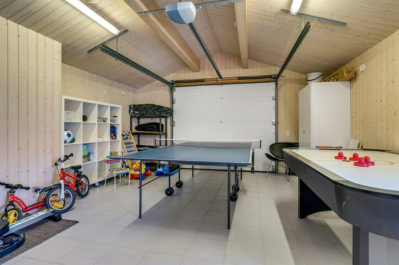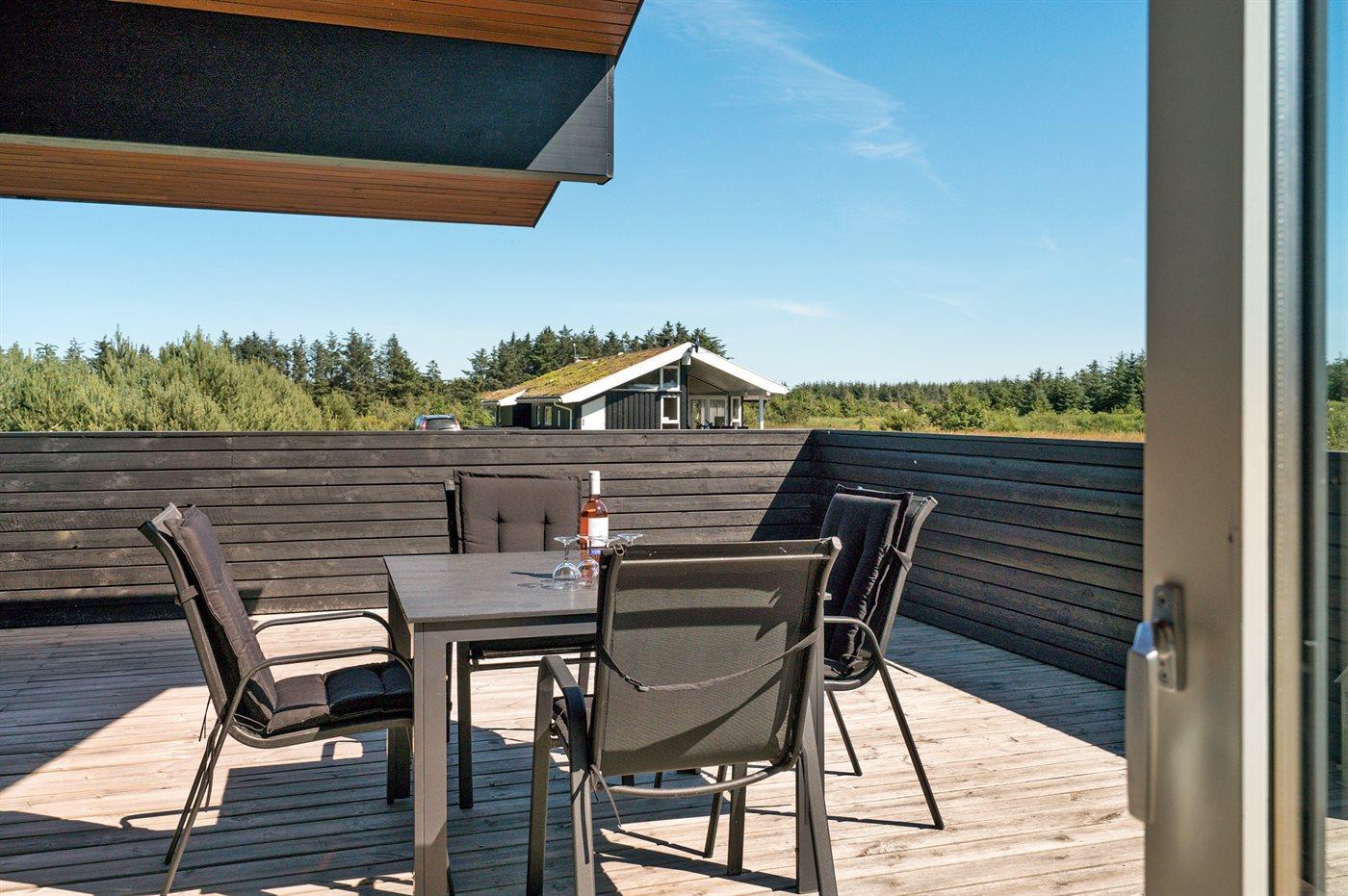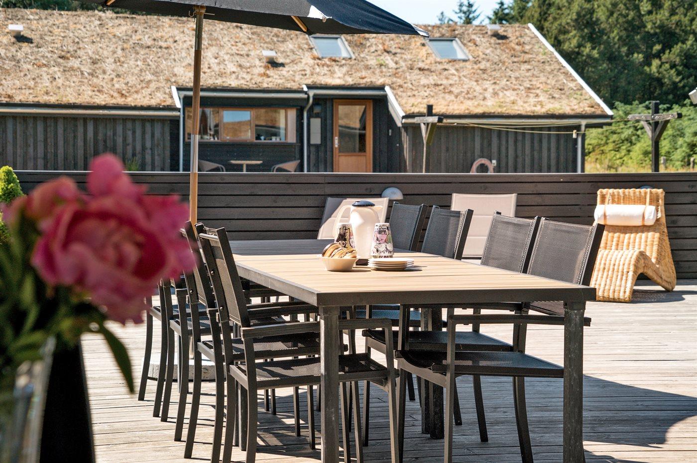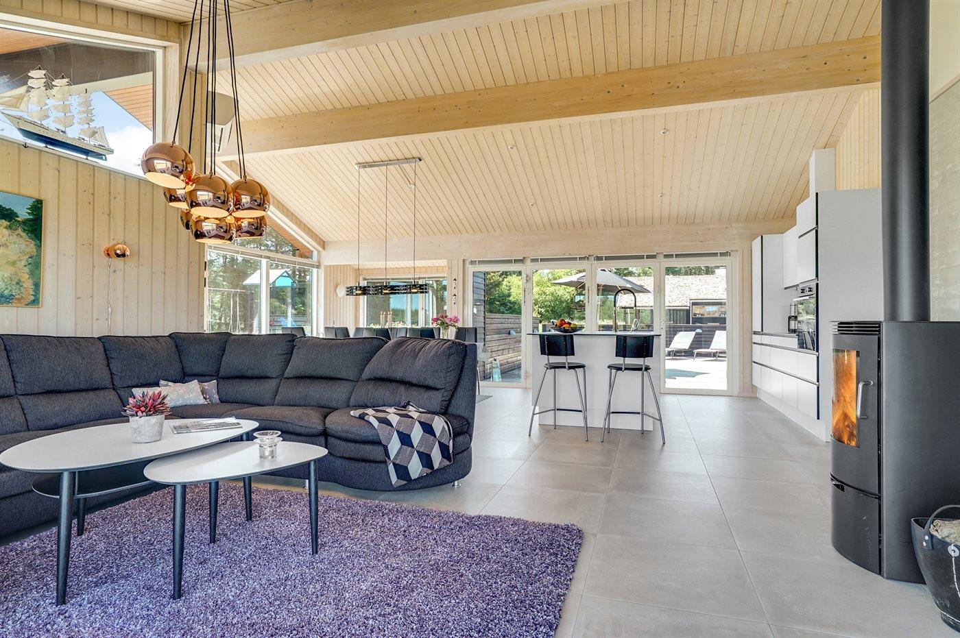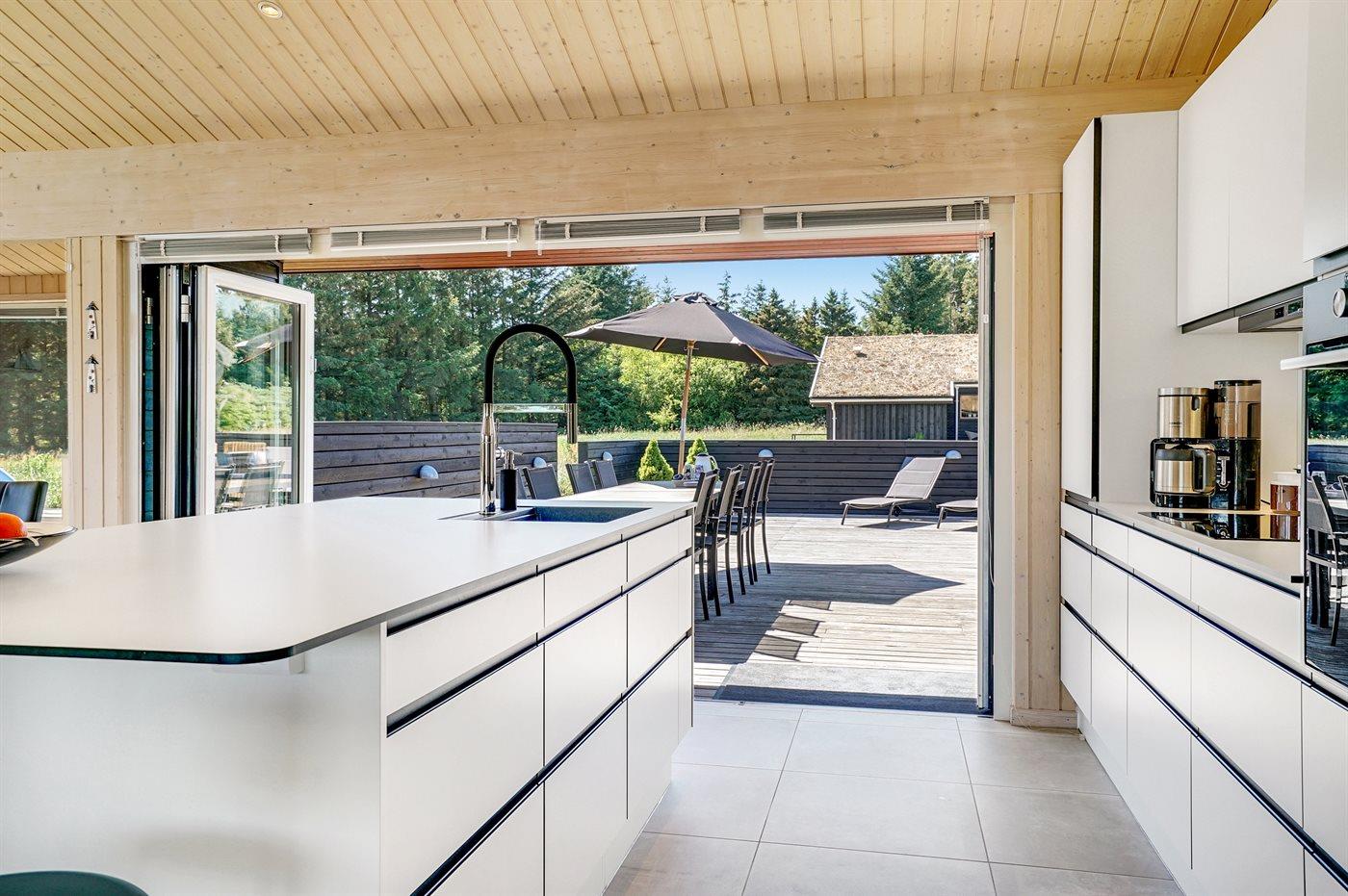 Stort, luksuriøst udstyret sommerhus i træ fra 2009 med spa og sauna. Huset, der er opført på en naturgrund, er omgivet af et meget stort terrasseareal, hvoraf en del er overdækket. Indvendigt er gulvene belagt med klinker, dog er der trægulv i 2 soveværelser. Rummeligt badeværelse med 2-pers. spa, sauna, gulvvarme, bruseniche og håndklædetørrer. Det flotte køkken er udstyret med opvaskemaskine, mikrobølgeovn, varmluftovn, fryser og komfur med keramiske kogeplader. En stor foldedør fra køkkenets spiseafdeling og ud til den overdækkede terrasse gør det muligt at lukke naturen helt ind i huset. Den luksuriøst udstyrede stue indeholder brændeovn, TV med digital parabol og DVD-afspiller. Huset har 2 soveværelser med dobbeltseng og praktisk walk-in-closet samt 1 soveværelse med 2 enkeltsenge. Endvidere findes anneks med 1 soverum med 2 enkeltsenge, ekstra TV og Playstation1 samt badeværelse med bruseniche. I tilknytning til annekset er indrettet et aktivitetsrum med komb. bordfodbold/mini bordtennis/airhockey, motionscykel, romaskine og musikanlæg. Til husets udstyr hører endvidere barneseng, høj barnestol, vaskemaskine og tørretumbler. Et skønt sommerhus tæt ved Fårup Sommerland, Vesterhavet og skovområde.