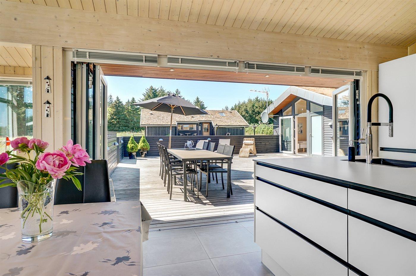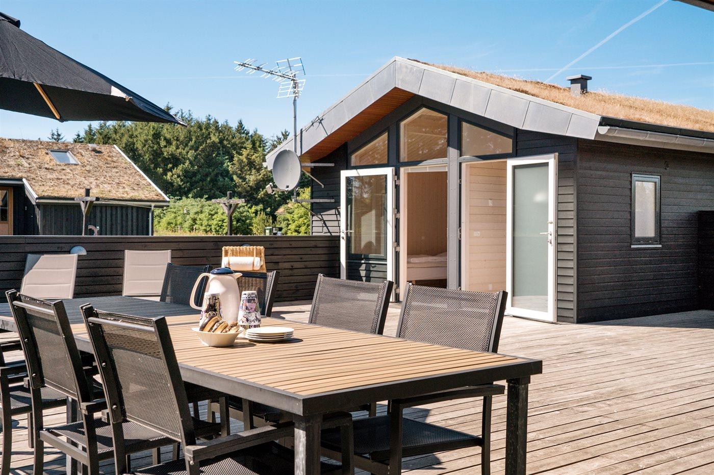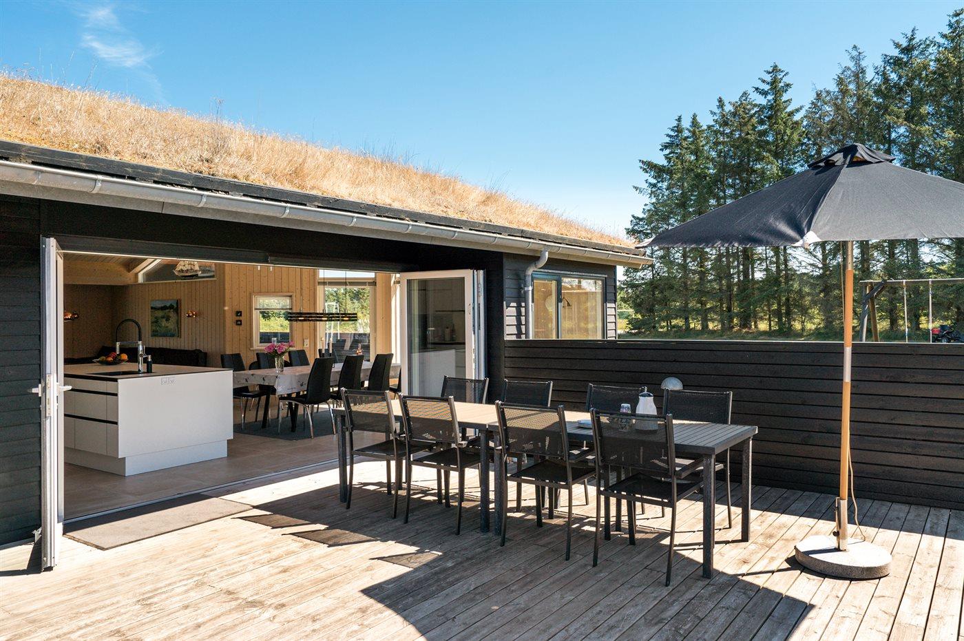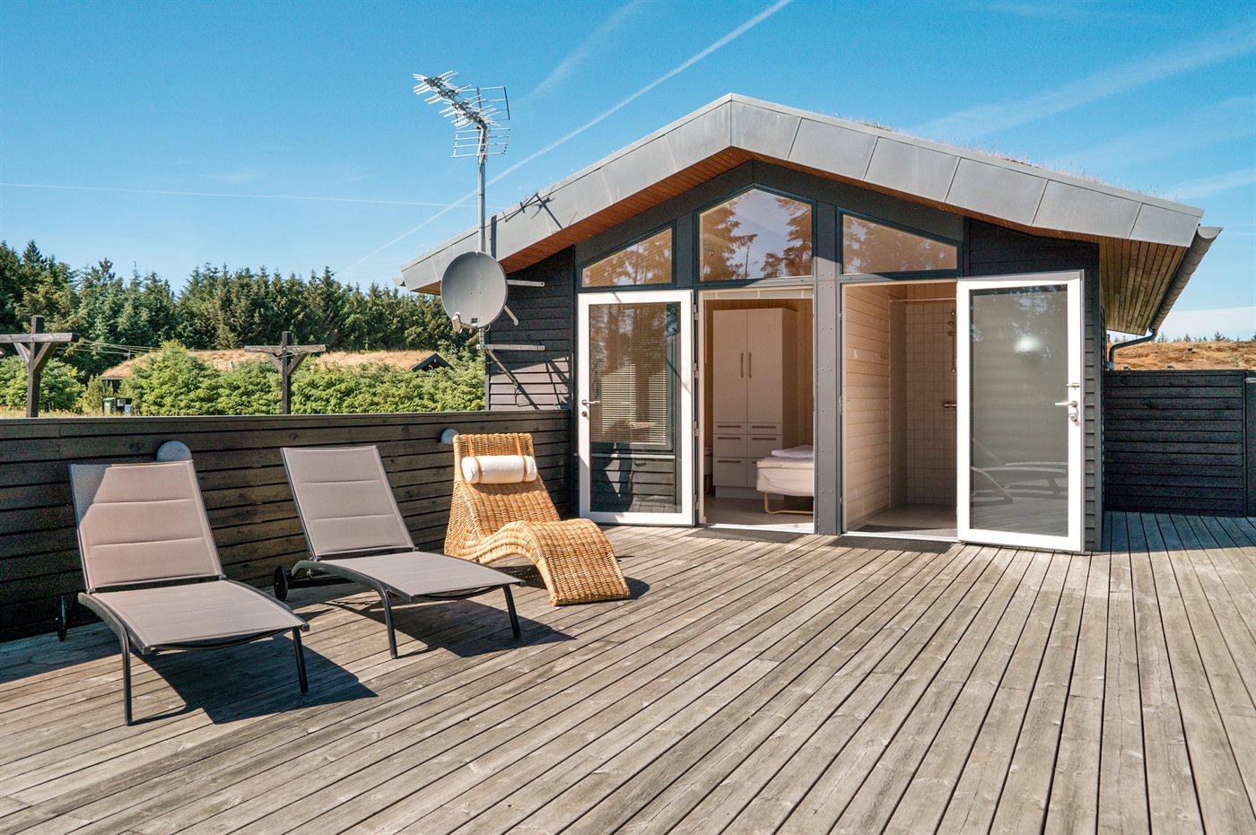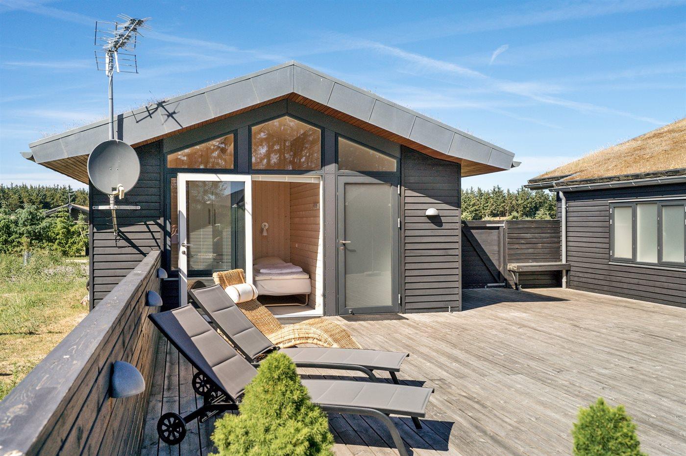 Luksuriøst træsommerhus med spa, sauna og stort terrasseareal nær Vesterhavet og Fårup Sommerland.