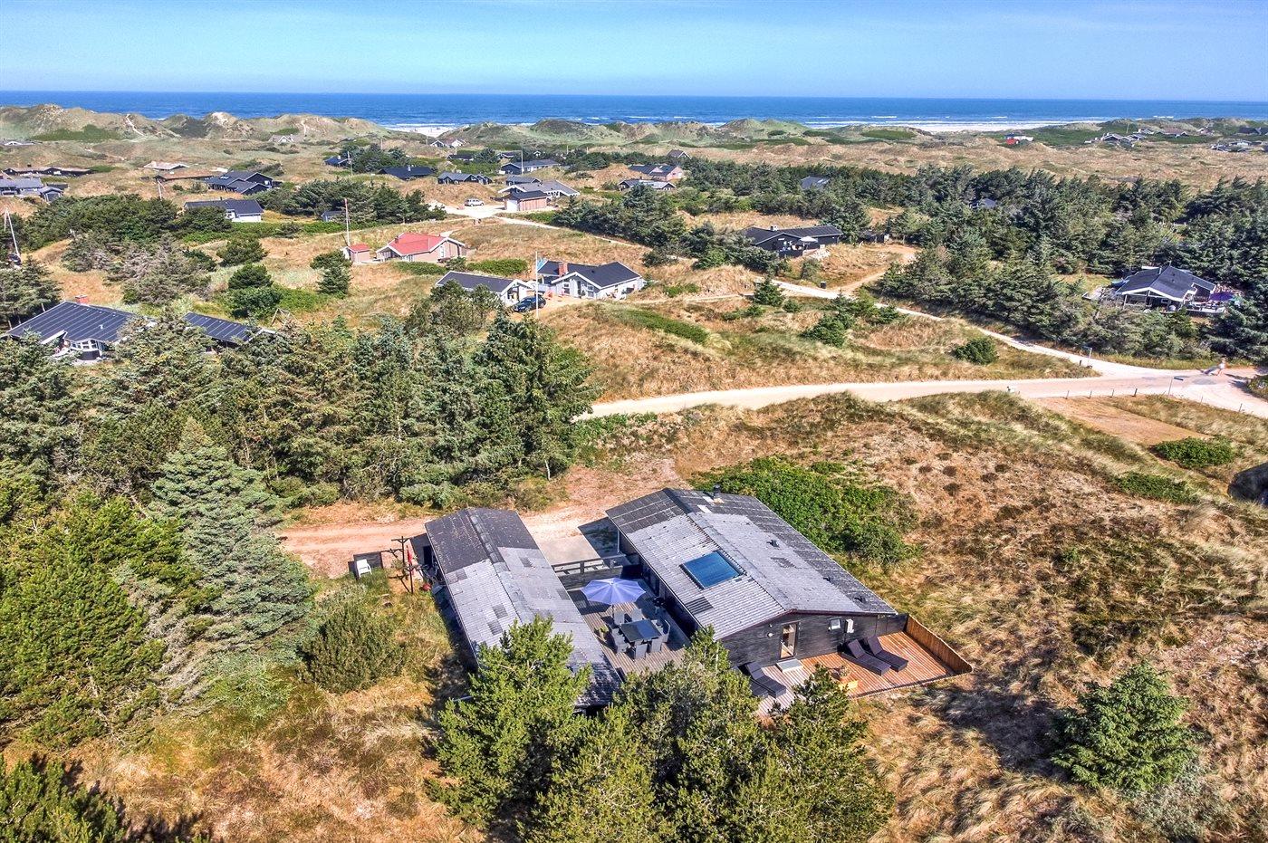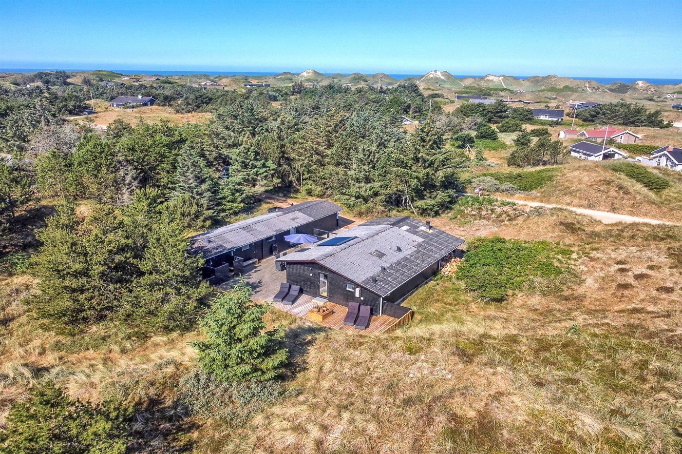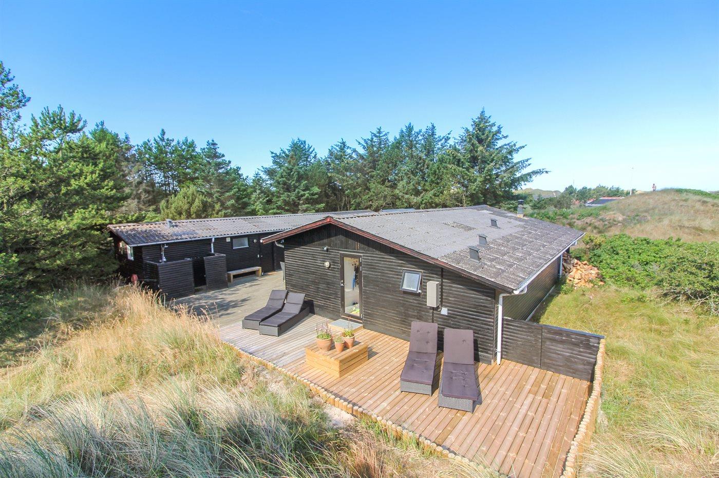 Et hyggeligt, ældre og rummeligt sommerhus beliggende på en meget stor og kuperet grund nær Vesterhavet og skøn badestrand. Fra grunden er der kig til havet, og på det store, lukkede terrasseareal er der en udendørsbruser og gode læforhold. Til huset hører et stort anneks med 2 af soveværelserne samt et stort badeværelse med spa og sauna.