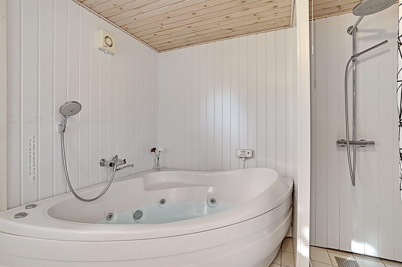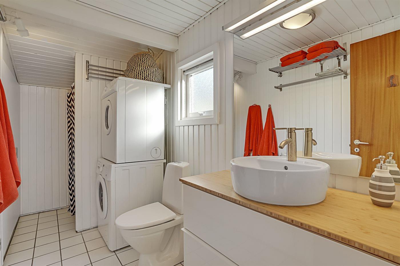 Der er 2 badeværelser med bruseniche og 2 toiletter. Der er gulvvarme på 2 badeværelser. I saunaen er der mulighed for afslapning.