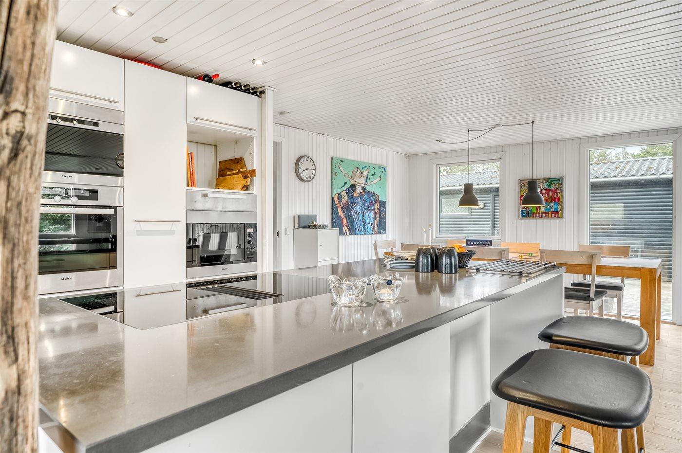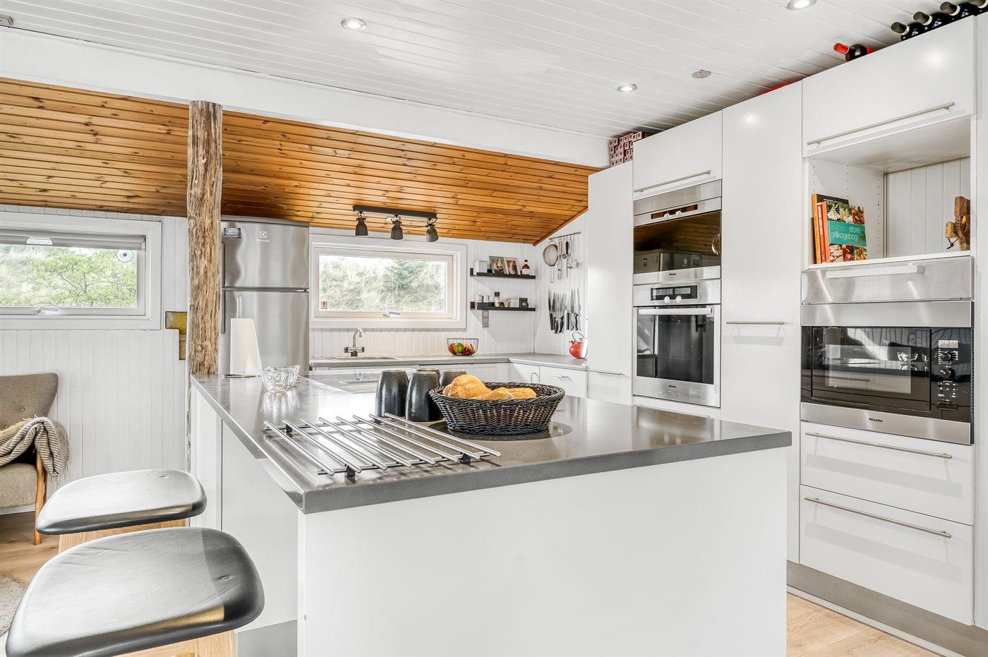 Køkkenet er udstyret med 2 køleskabe. Der er 4 keramiske kogeplader, bageovn, varmluftovn, mikrobølgeovn samt opvaskemaskine.