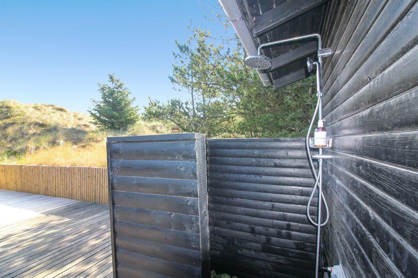 Ferieboligen er beliggende på en 2610 m² stor naturgrund. Der er 650 m til havet. Nærmeste forretning er beliggende i en afstand af 1200 m. Der er en golfbane i en afstand af 8000 m. Til ferieboligen hører 80 m² lukket terrasse. Der er redskabsrum. Udendørs bruser. Der er installeret stik til opladning af elbil. Parkering ved ferieboligen.