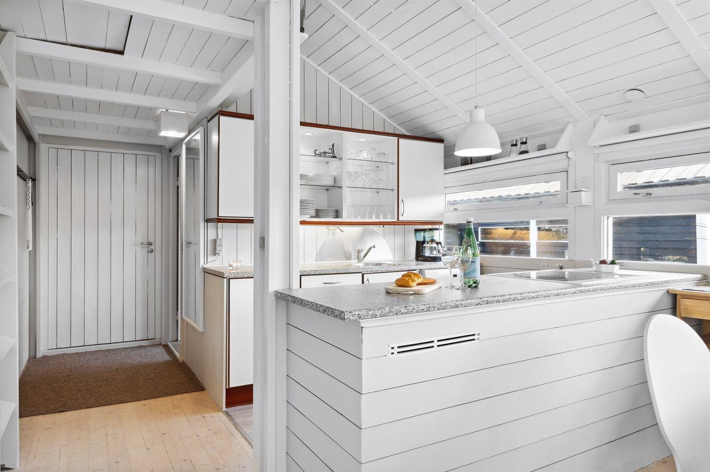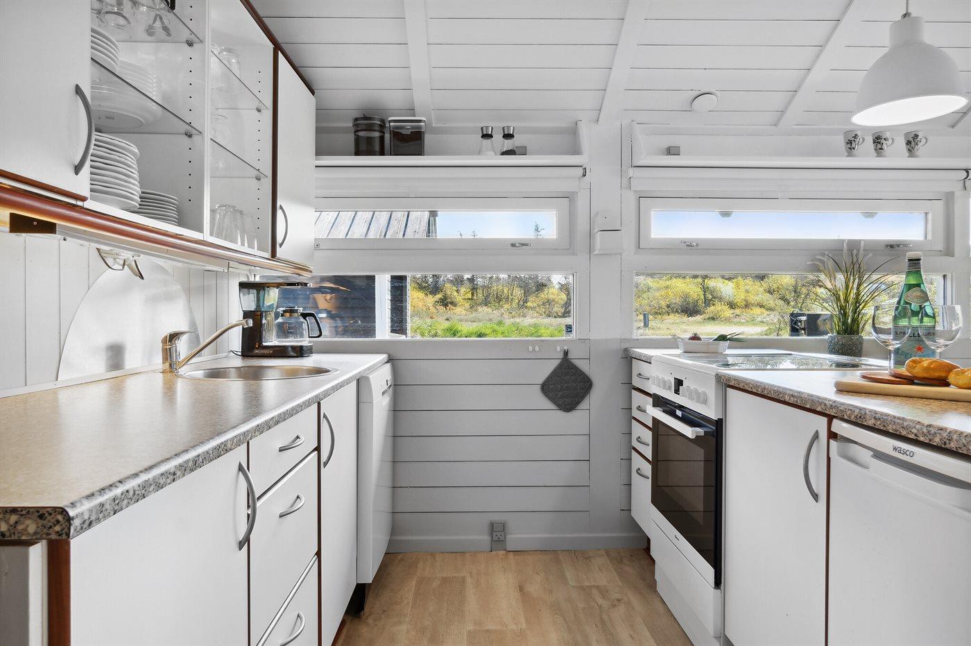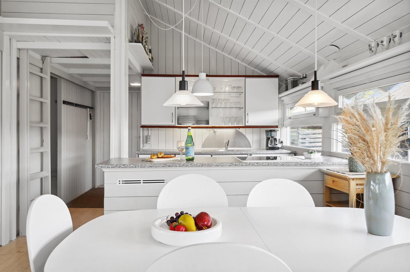 Køkkenet er udstyret med 1 køleskab. Der er 4 keramiske kogeplader, varmluftovn, mikrobølgeovn samt opvaskemaskine Der findes ekstra køleskab (160 liter) samt fryser (45 liter) i redskabsrummet.