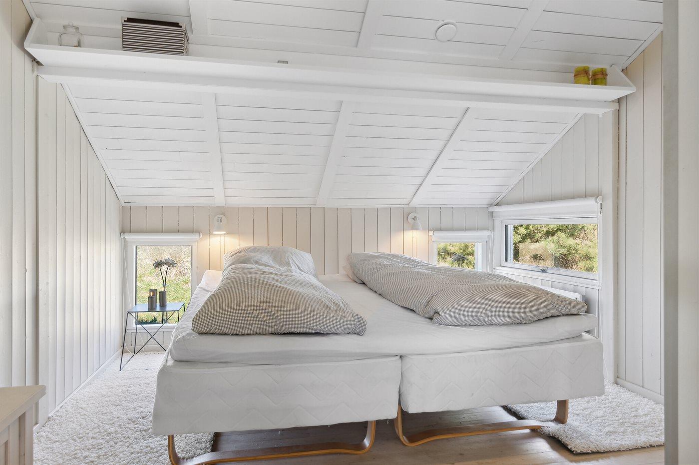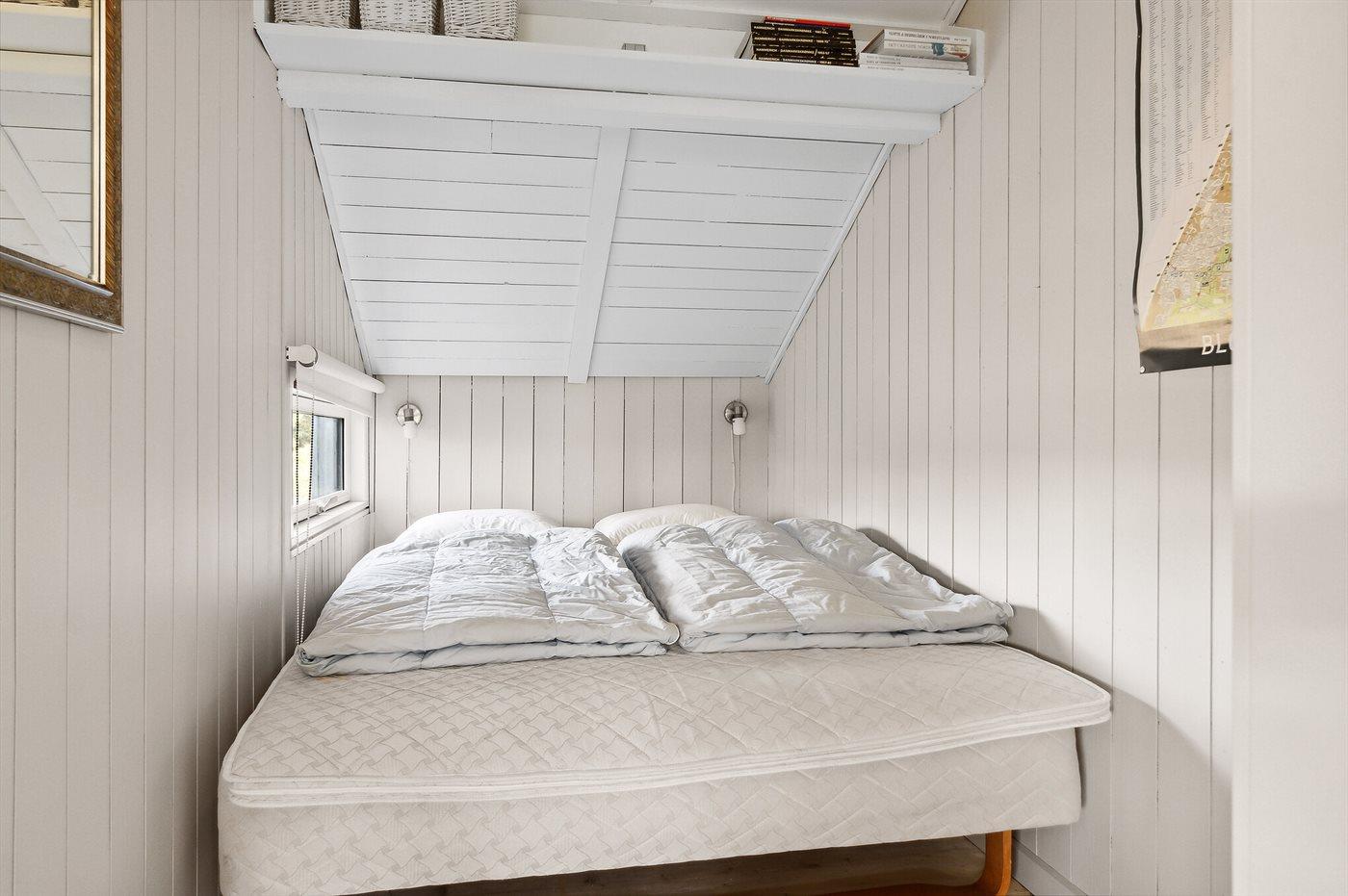Der er i alt 2 soveværelser. Sovepladserne fordeler sig på: 4 sovepladser i dobbeltsenge. 1 af disse sovepladser befinder sig på husets hems. Derudover er der 1 stk. barneseng.