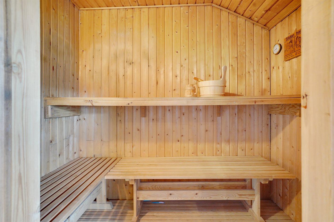 Der er 1 badeværelse med bruseniche og 1 toilet. I saunaen er der mulighed for afslapning.
