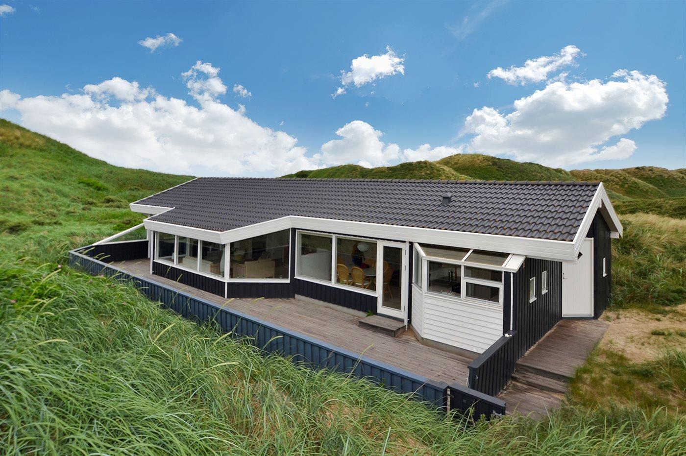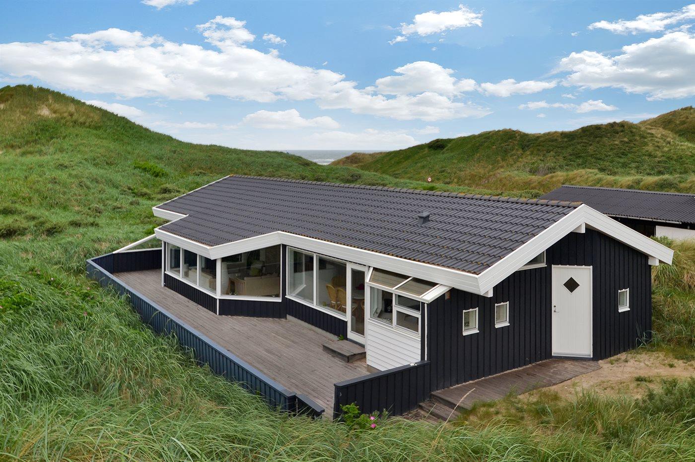 Dejligt sommerhus med en fantastisk beliggenhed på en kuperet klitgrund - kun 100 m fra Vesterhavet. Fra grunden kan havet skimtes. Til huset hører en stor åben terrasse foran huset og en dejlig overdækket, næsten lukket terrasse, som vender ud mod havet.