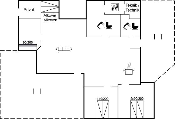 Der er i alt 3 soveværelser. Sovepladserne fordeler sig på: 2 sovepladser i dobbeltseng. 2 sovepladser i enkeltsenge. 2 sovepladser i køjeseng. 2 sovepladser i alkove. 2 af disse sovepladser befinder sig i stuen. Derudover er der 1 stk. barneseng.
