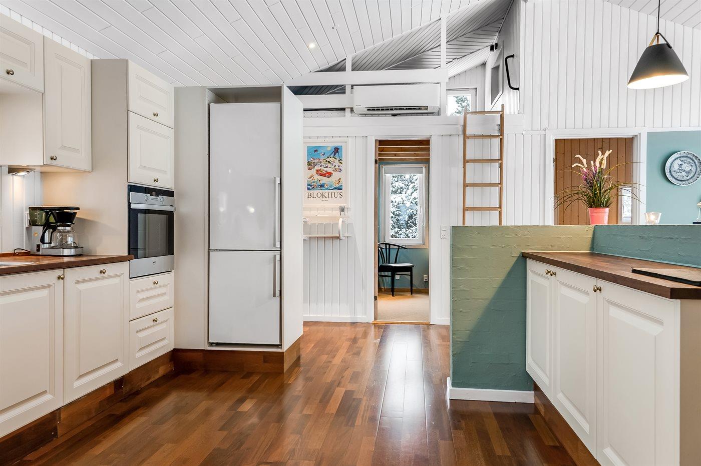 Køkkenet er udstyret med 1 køleskab. Der er 4 keramiske kogeplader, varmluftovn, mikrobølgeovn samt opvaskemaskine.