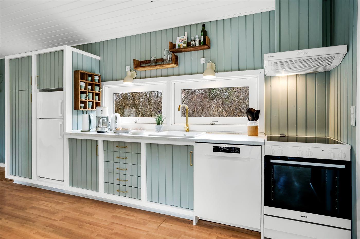 Køkkenet er udstyret med 1 køleskab. Der er 4 keramiske kogeplader, varmluftovn, mikrobølgeovn samt opvaskemaskine.