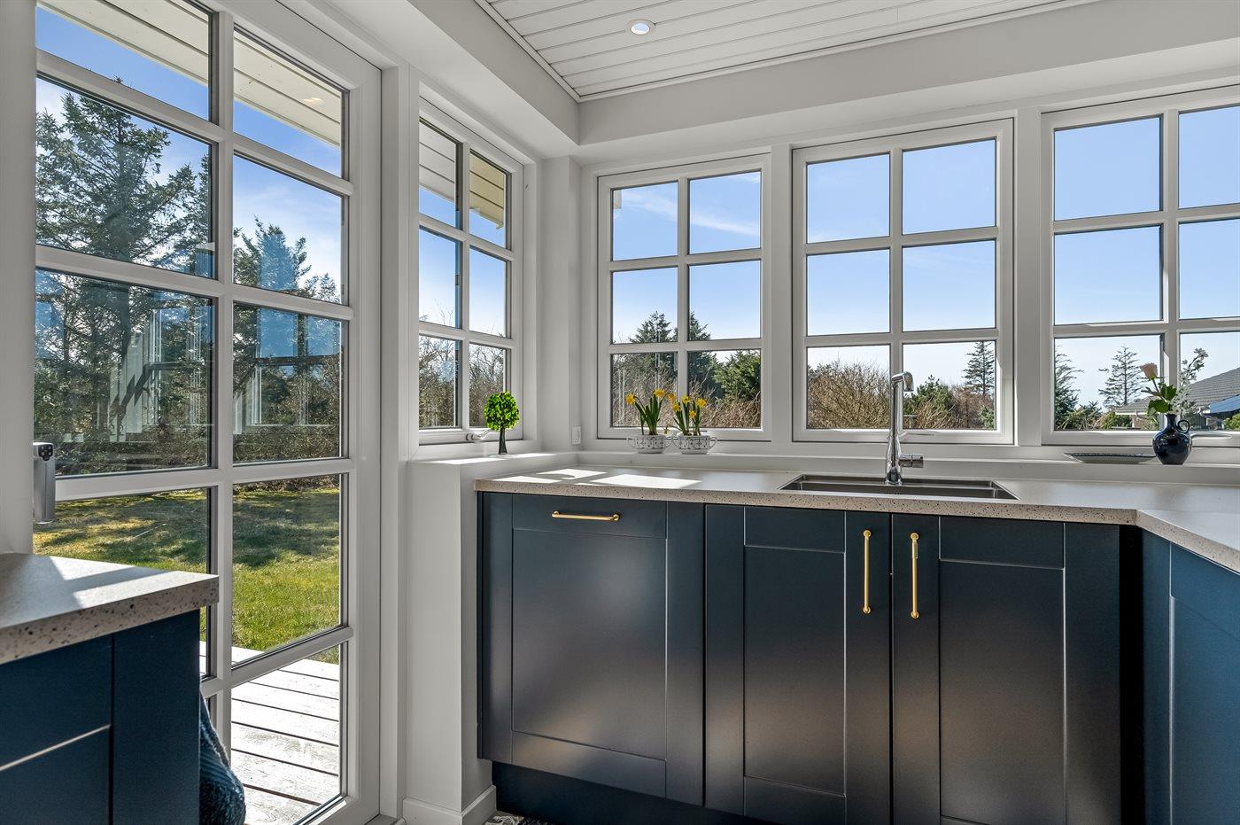 Køkkenet er udstyret med 1 køleskab. Der er 4 induktionskogeplader, varmluftovn, mikrobølgeovn samt opvaskemaskine Der er gulvvarme i køkkenet.