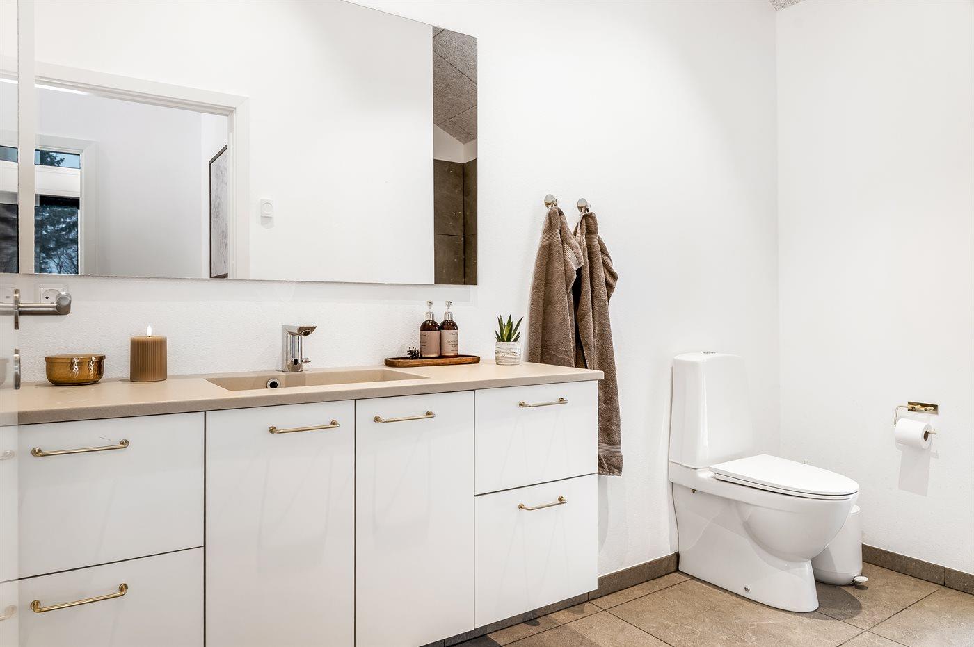 Der er 2 badeværelser med bruseniche og 3 toiletter, heraf 1 gæstetoilet. Der er gulvvarme på 2 badeværelser. Der er gulvvarme på gæstetoilettet.