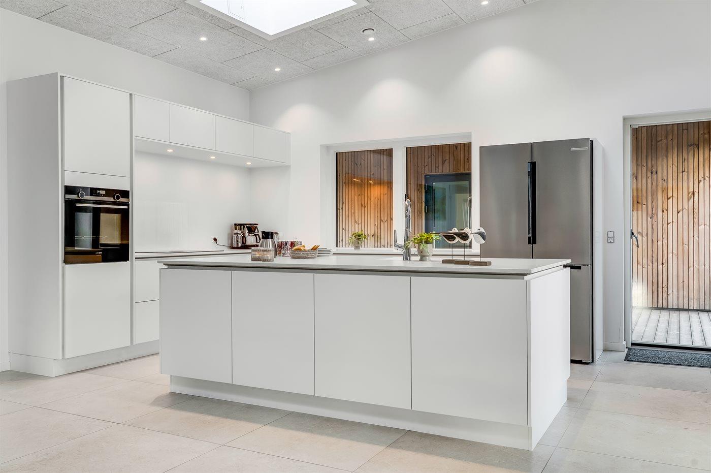 Køkkenet er udstyret med 1 køleskab. Der er 4 induktionskogeplader, varmluftovn samt opvaskemaskine.